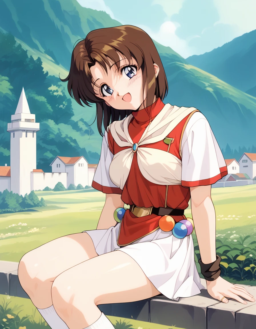 light yellow neckerchief, short sleeves, wristband, white_skirt, white_ miniskirt, belt, socks, brown_footwear,