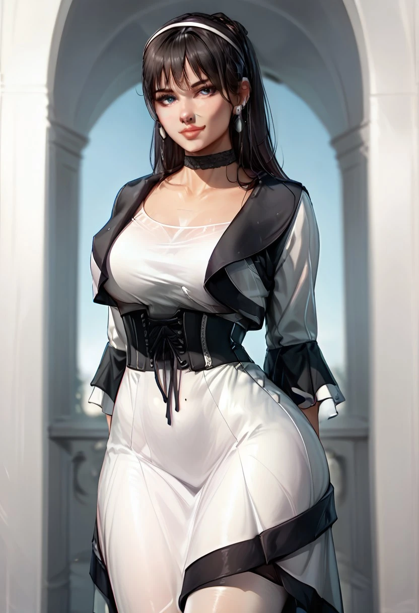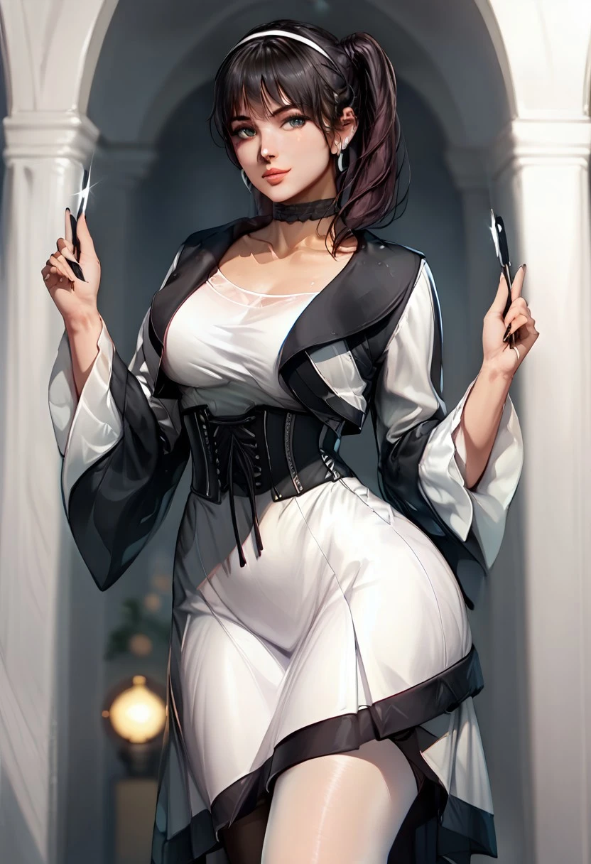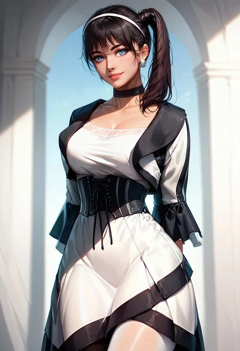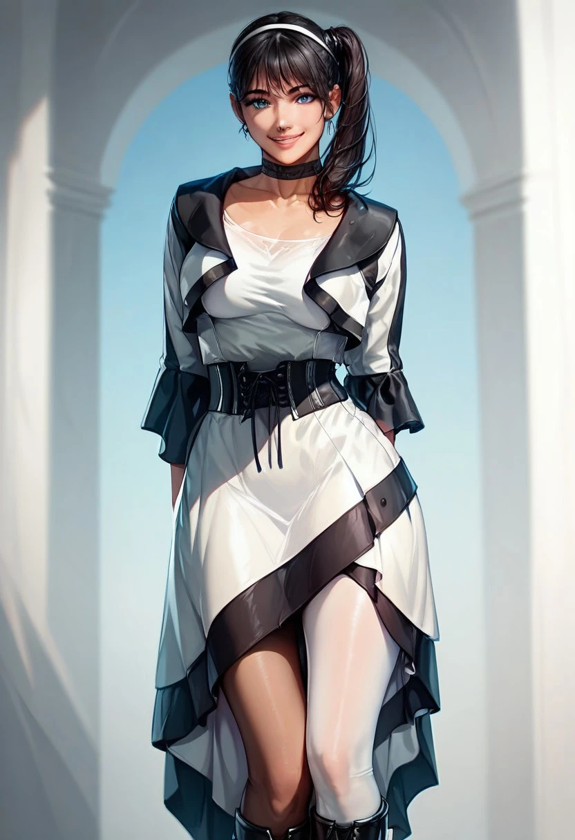 1girl, tsumuri, solo, boots, black hair, pantyhose, choker, asymmetrical legwear, ponytail, dress, long hair, Black and white stockings,