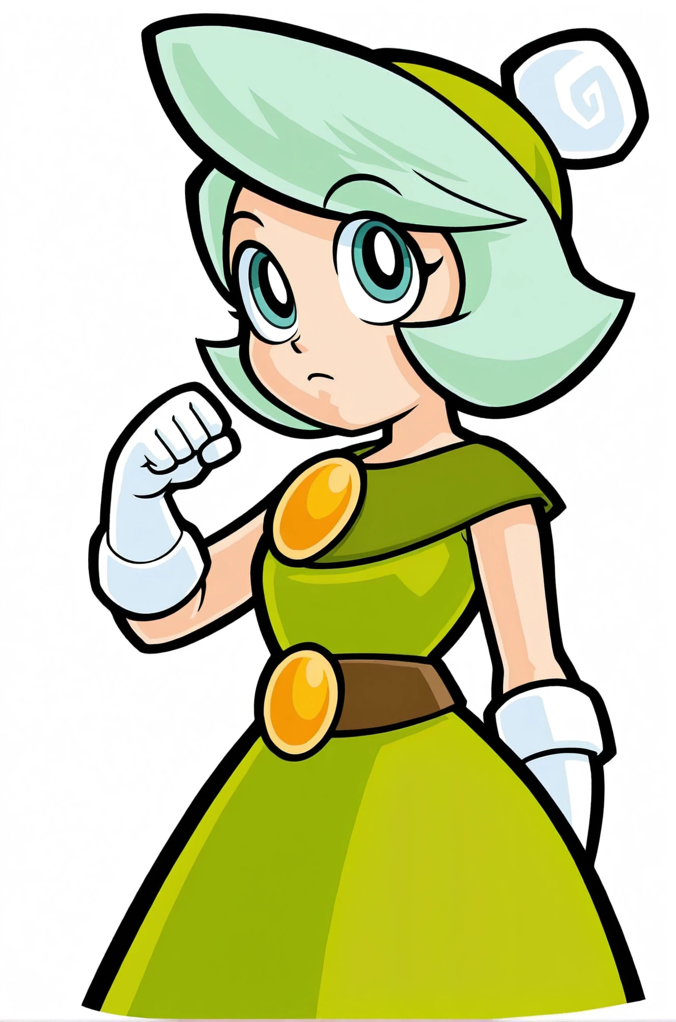 queenmerelda, short hair, green hair, acqua eyes, black pupils, small breasts, gloves, hat, dress, belt, white gloves, green dress