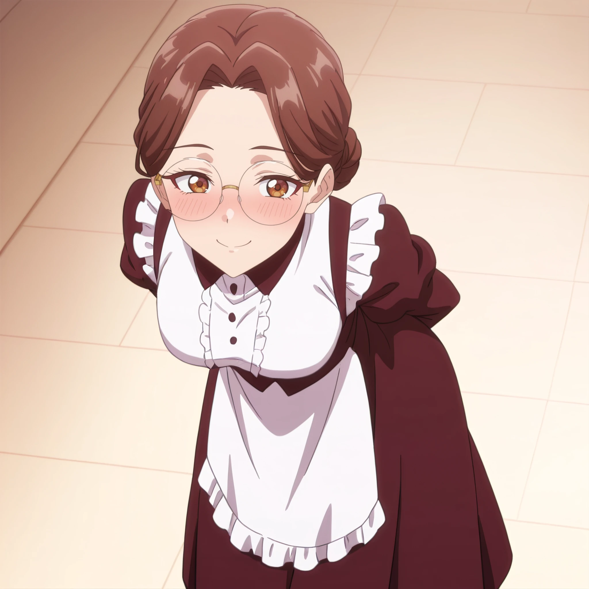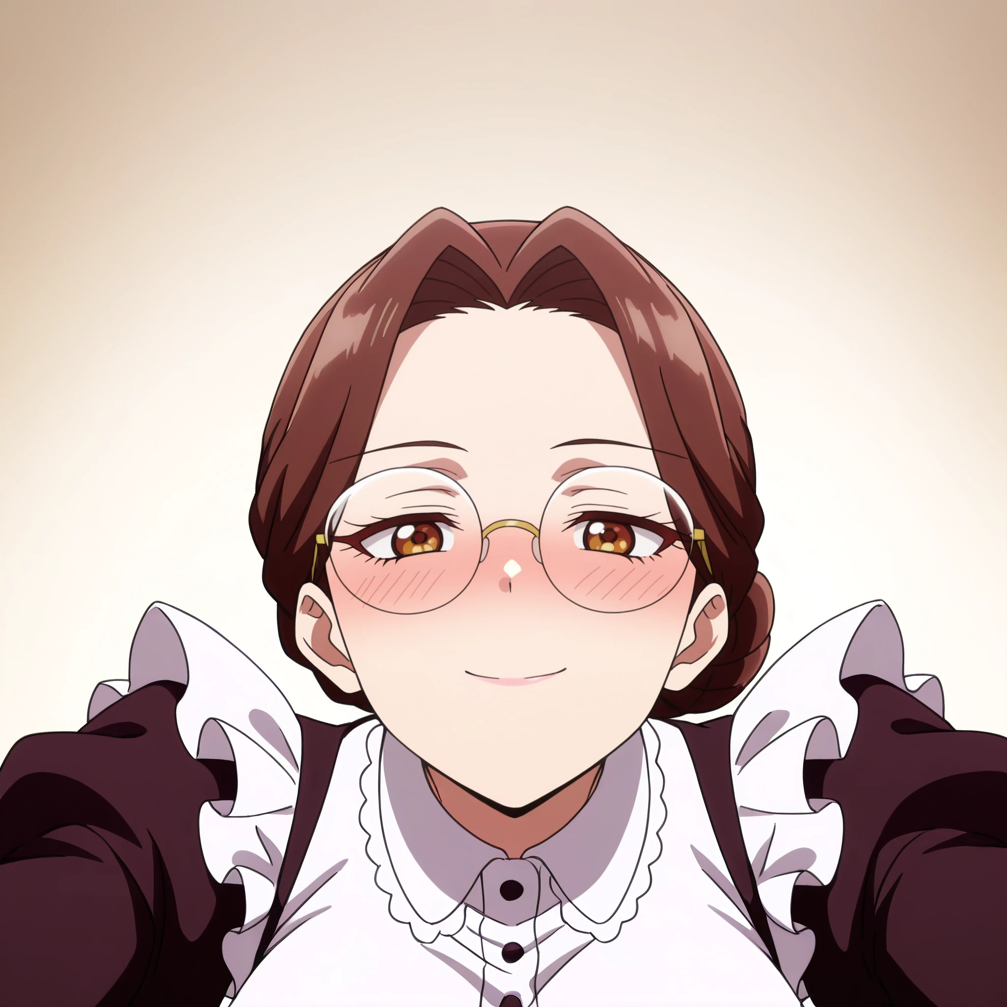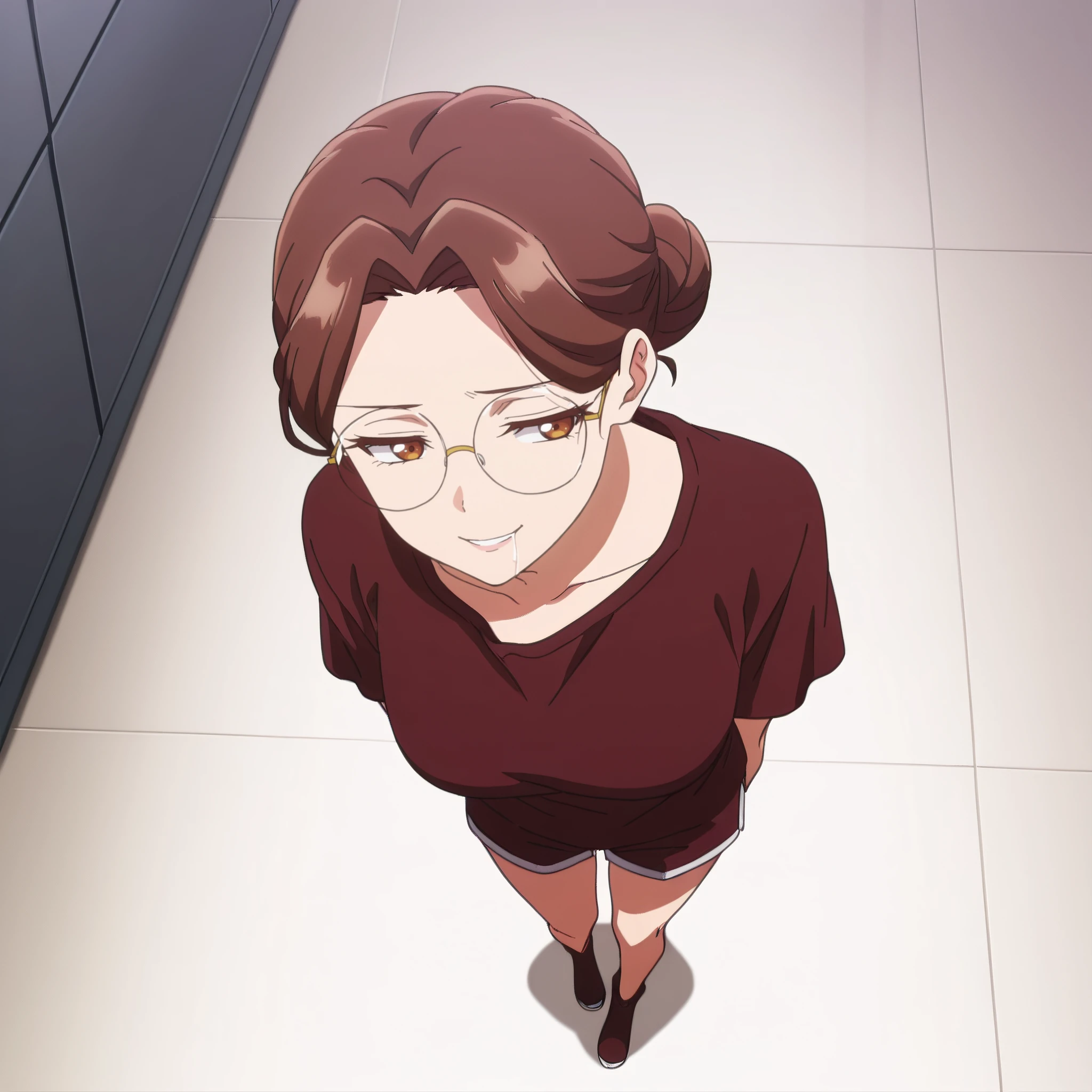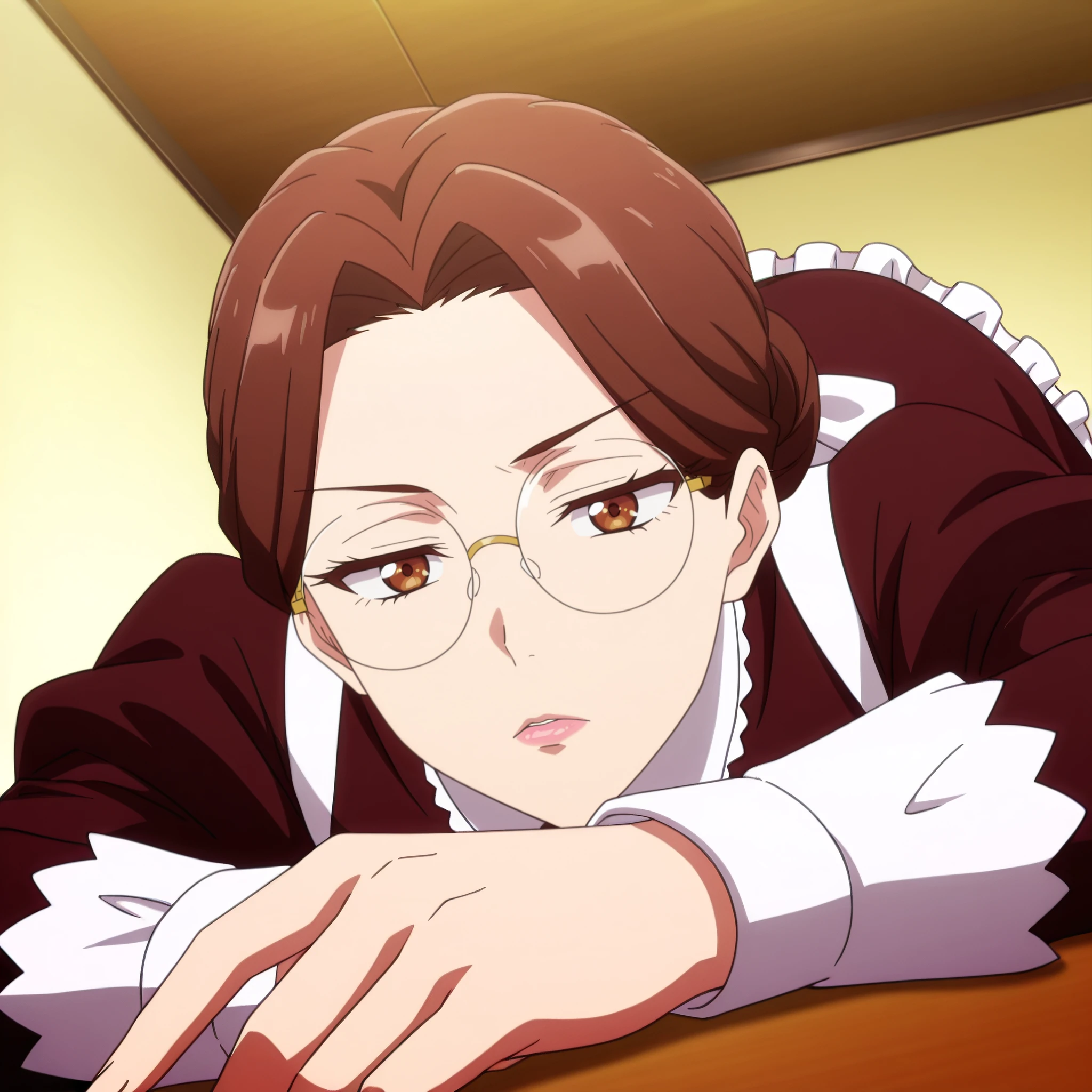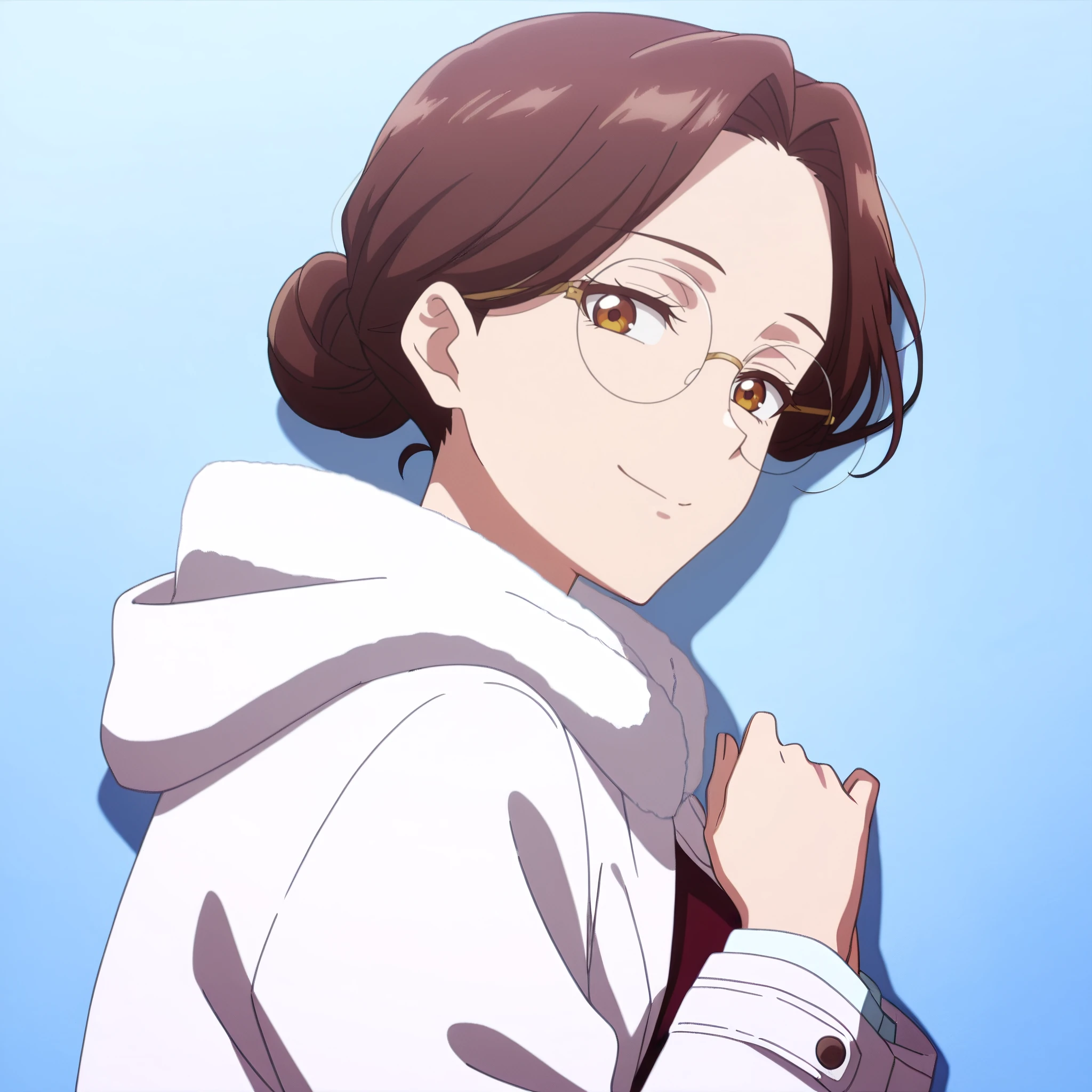 A4OMailen, brown eyes, brown hair, short hair, hair bun, bangs, long hair, glasses,