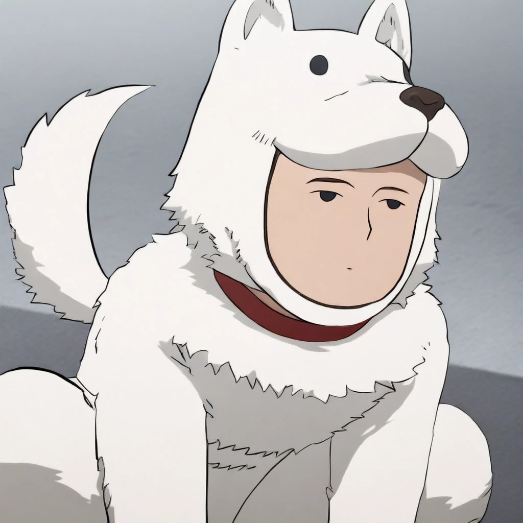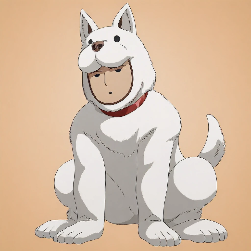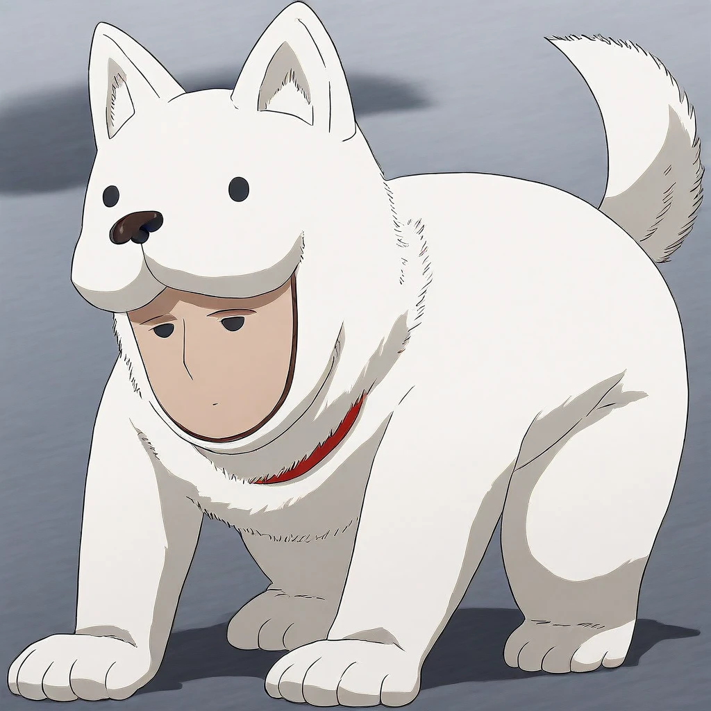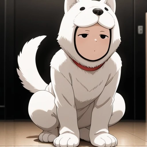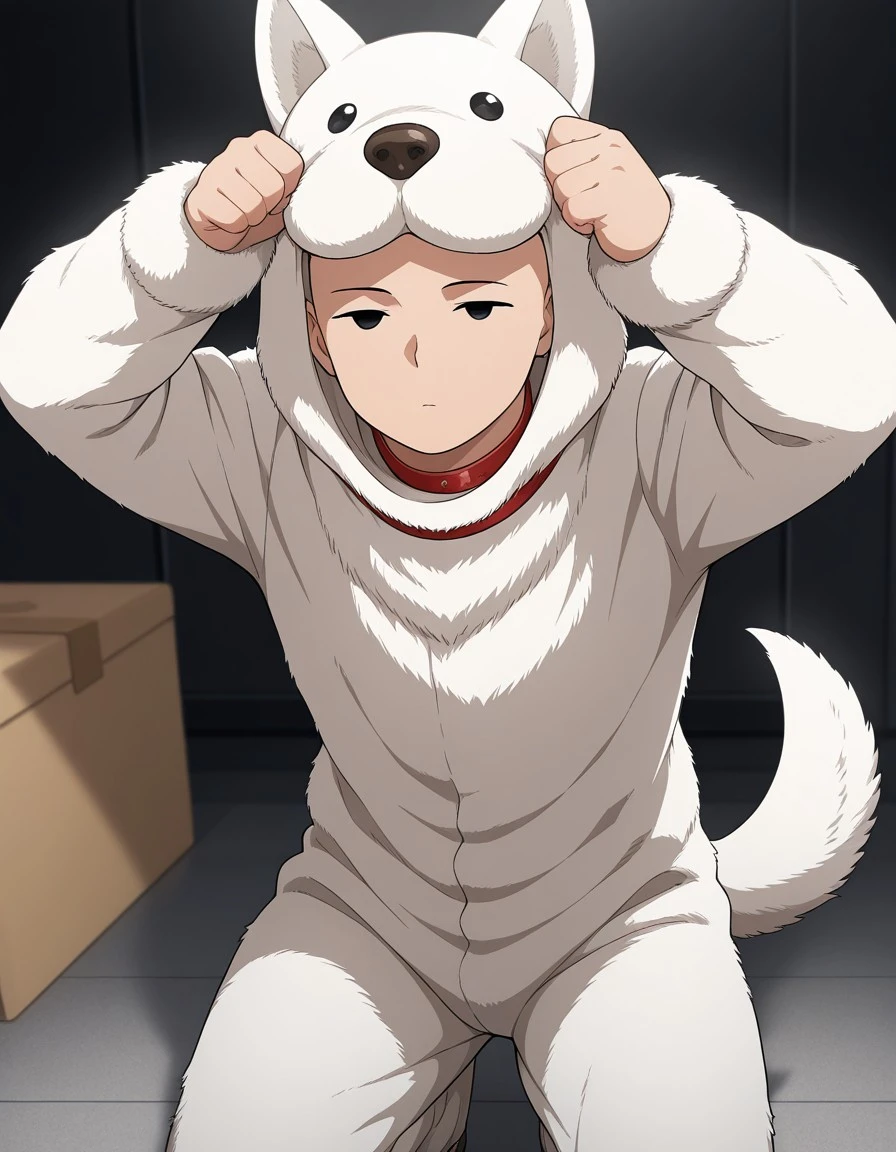 man in dog suit, white dog suit, black eyes, red dog collar, white dog tail, animal costume,