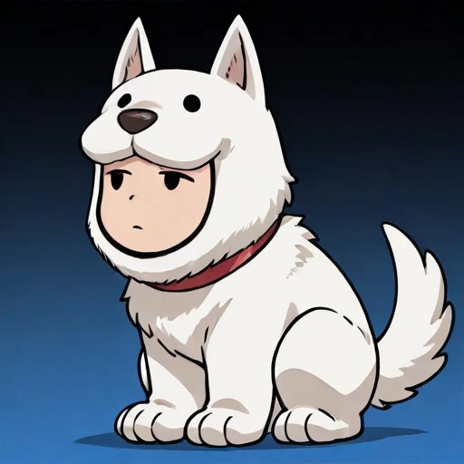 WDM-OPM, man in dog suit, white dog suit, black eyes, red dog collar, white dog tail, animal costume,Description