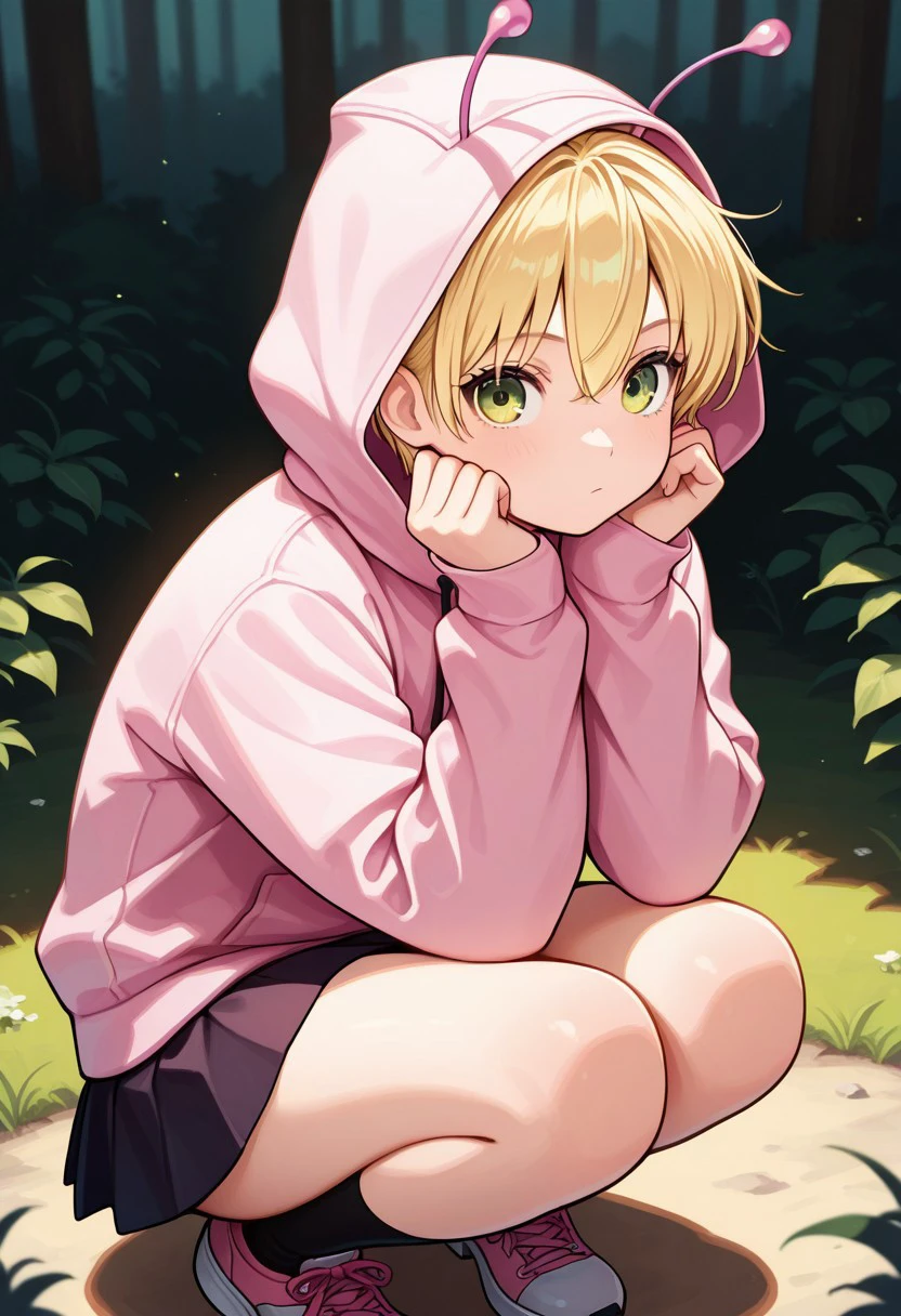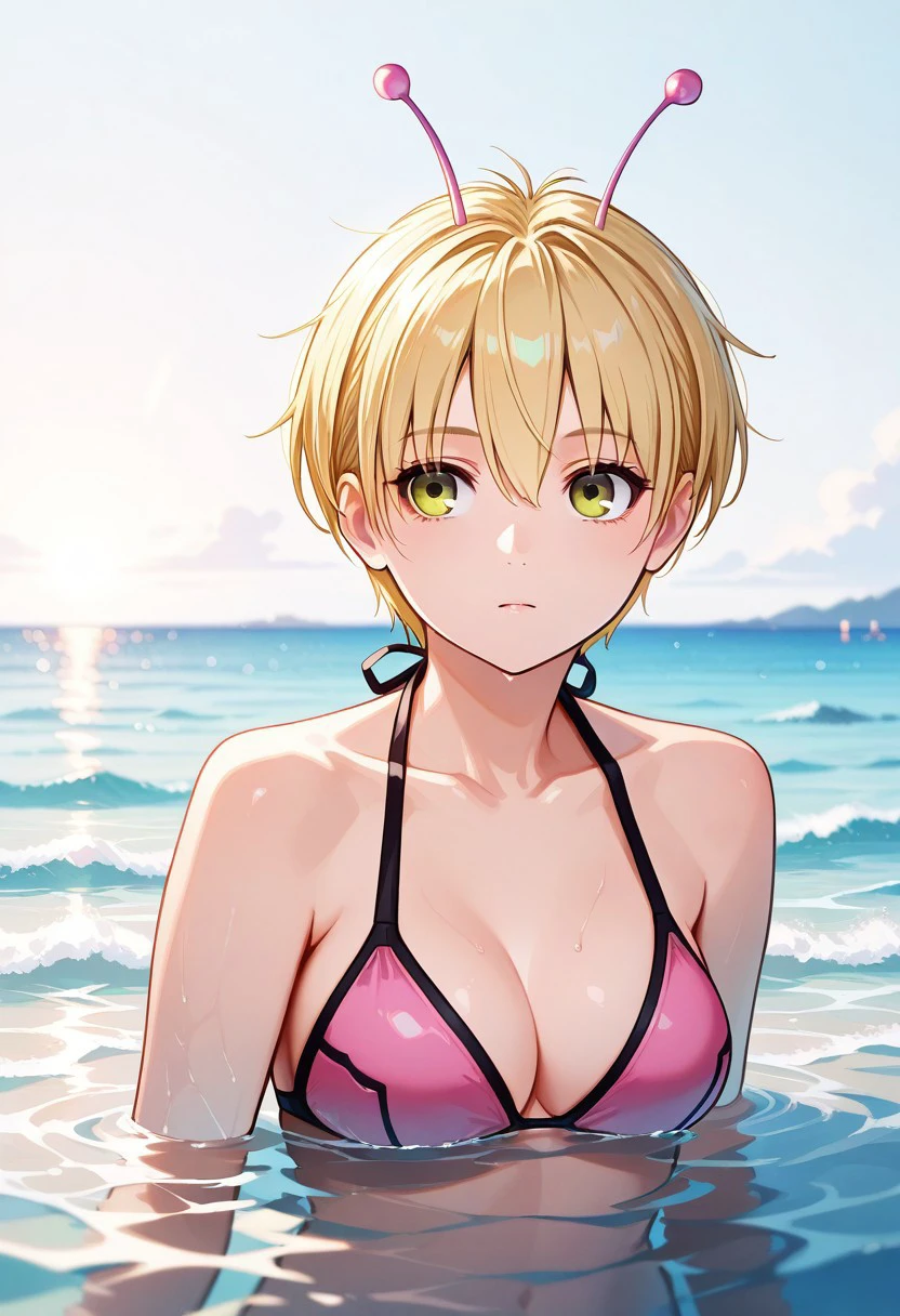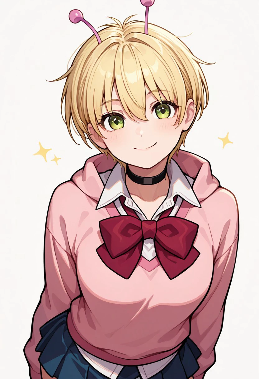Trigger + Appearance: vamola, 1girl, solo, blonde hair, antennae, green eyes, short hair
