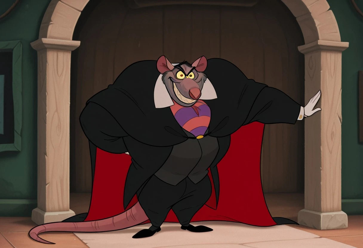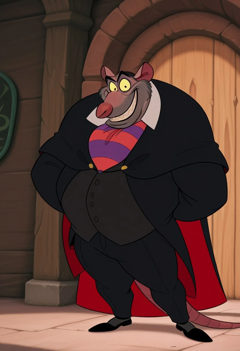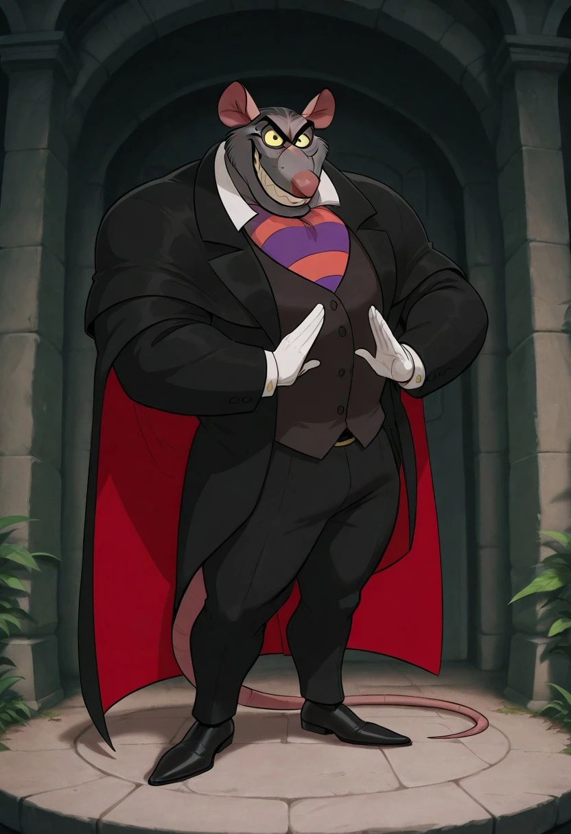 disney style, cape, bara, cartoon, wide body, purple and red striped tie, pink rat nose, black jacket, blue circles around eyes, yellow whites of eyes, styled hair, short legs, furry, black pants, male, rat tail, rat, large body