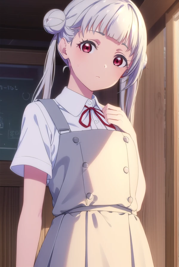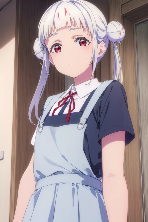 chisato arashi, long hair, bangs, (red eyes:1.3), twintails, white hair, blunt bangs, hair bun, double bun,