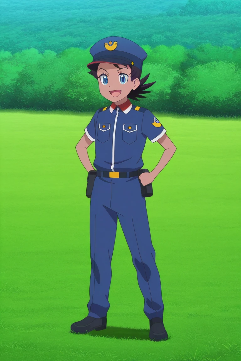 *short sleeves, police uniform, blue headwear, black footwear, blue pants, belt, uniform, police hat