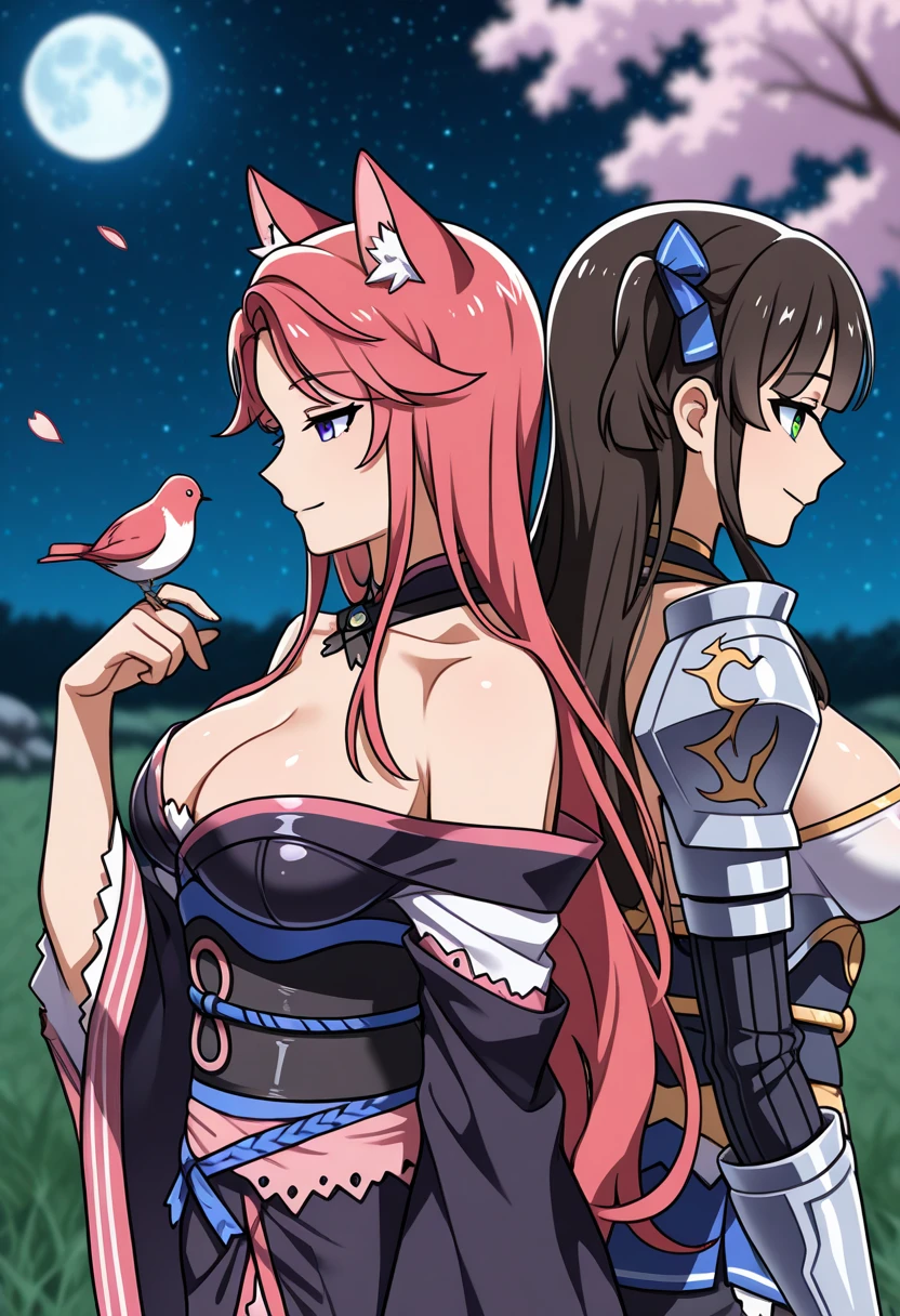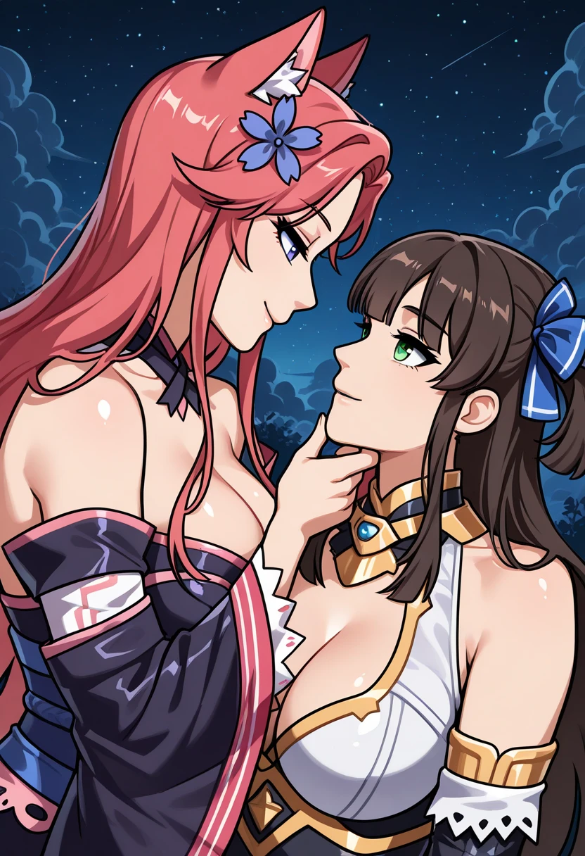 large brests, green eyes, blue eyes, long hair, hair ribbon, hair flower, animal ears, pink hair, red hair, black hairNotes:
