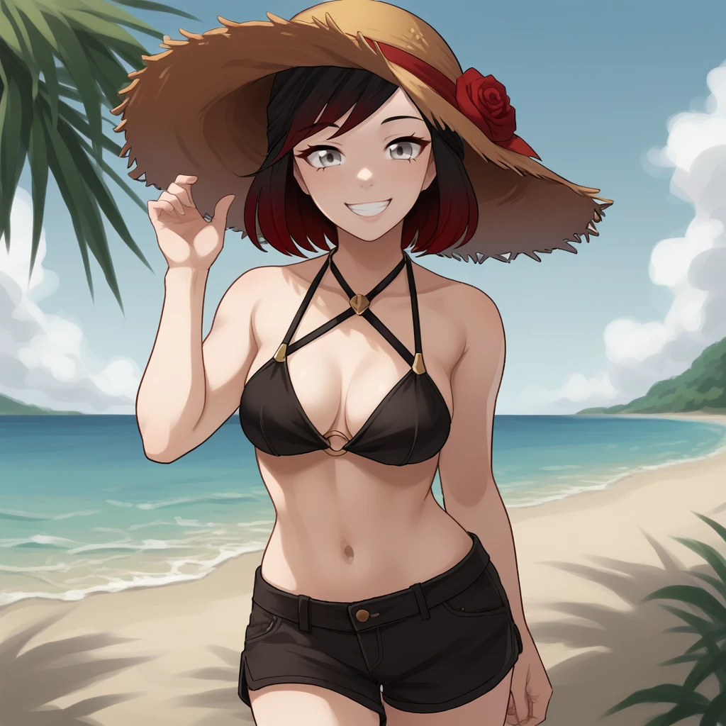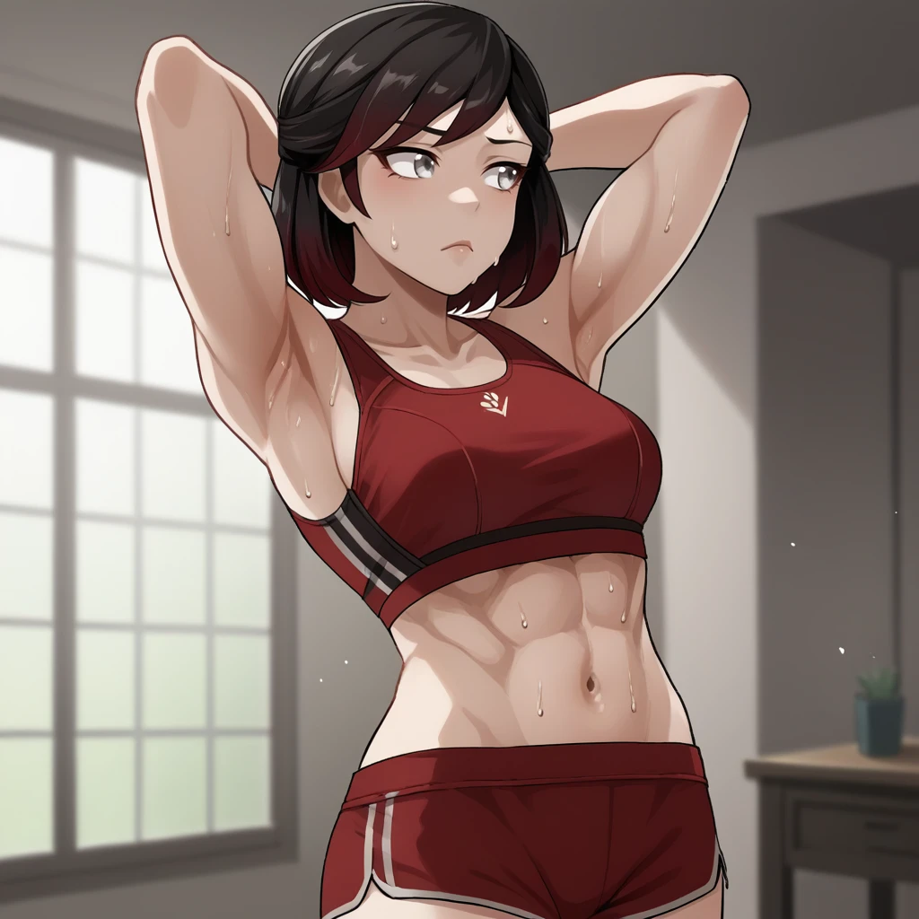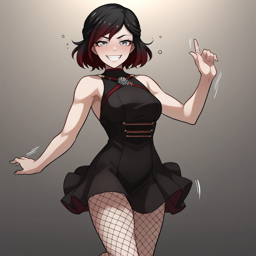 short hair, black hair,gradient hair, grey eyes, fingerless gloves, detached sleeves, bare shoulders, red dress,pantyhose, red cape, boots