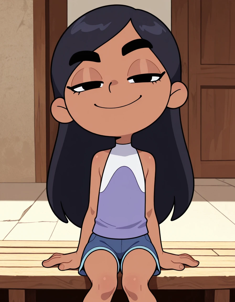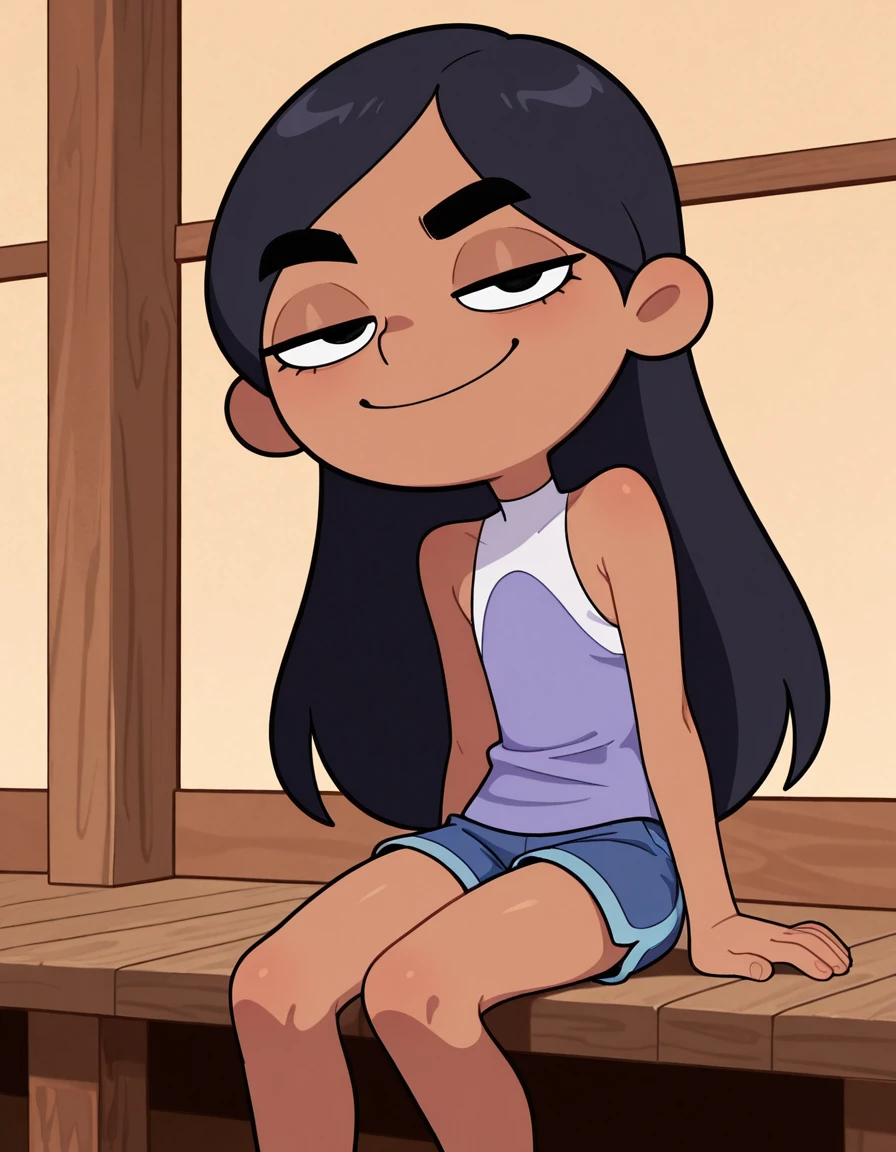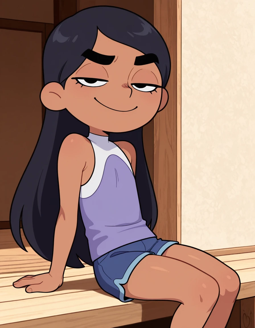 isabellavav, long hair, black hair, shorts, dark-skinned female, lidded eyes, thick eyebrows, sleeveless top, blue shorts