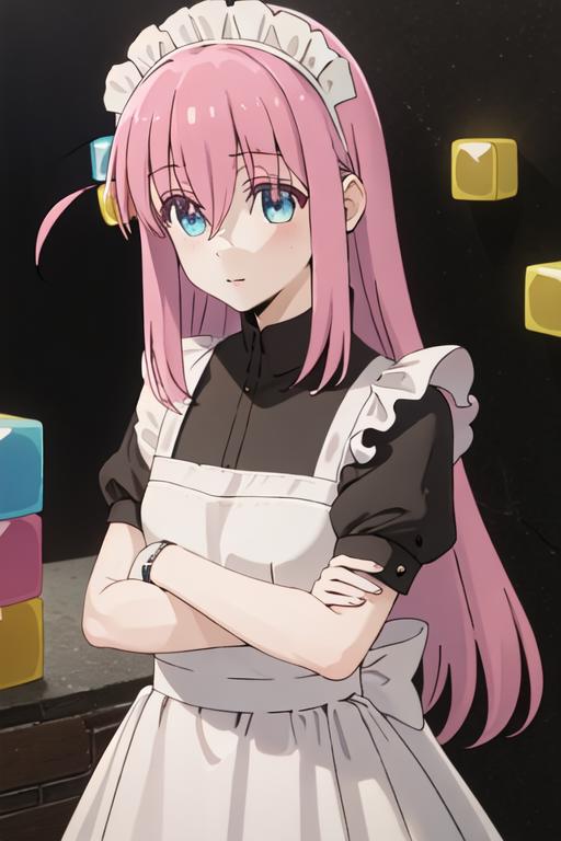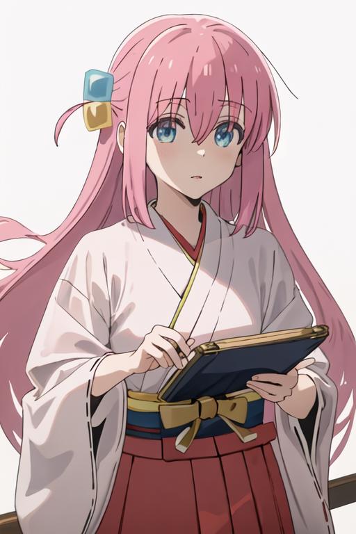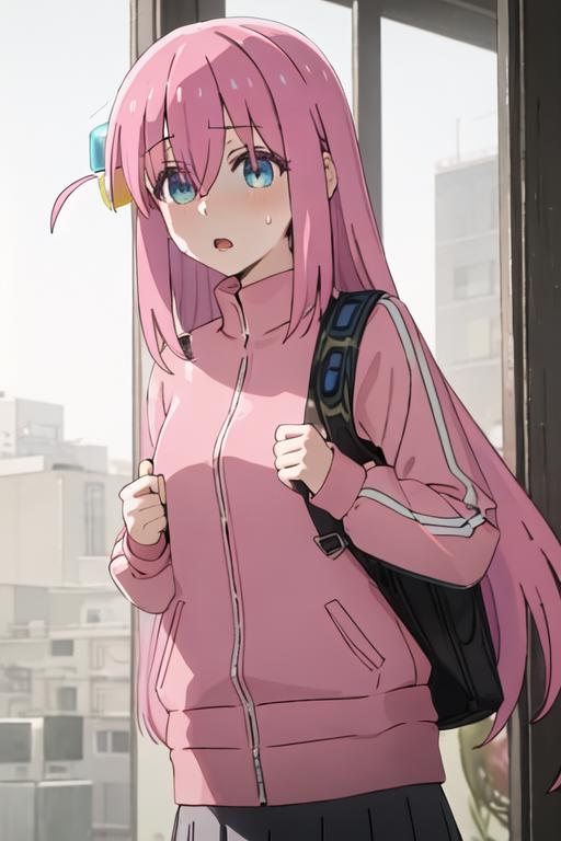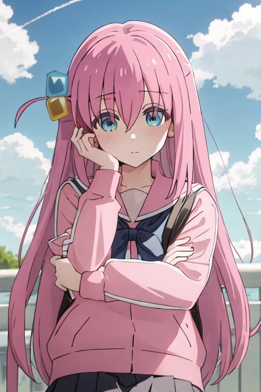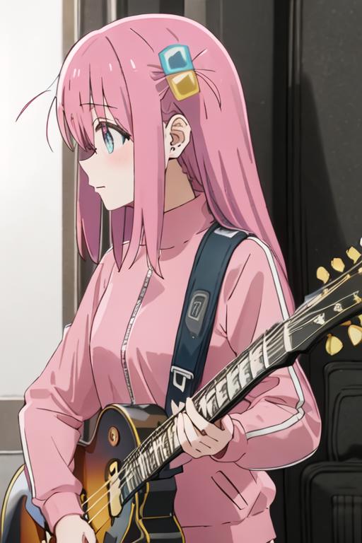 The trigger word is goto_hitori_bocchitherock, and the recommended tags are best quality, masterpiece, highres, solo, {goto_hitori_bocchitherock:1.15}, pink_hair, bangs, long_hair, hair_between_eyes, cube_hair_ornament, one_side_up, hair_ornament, blue_eyes.