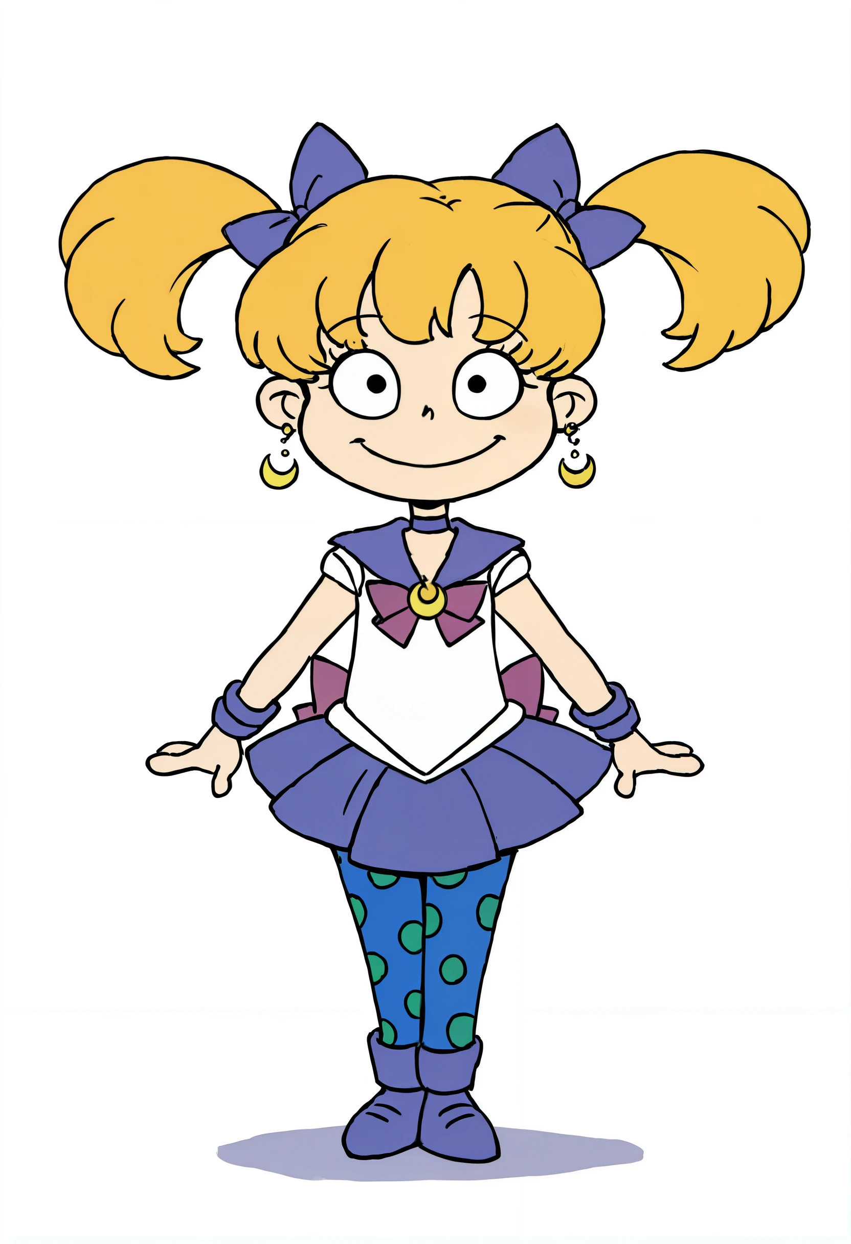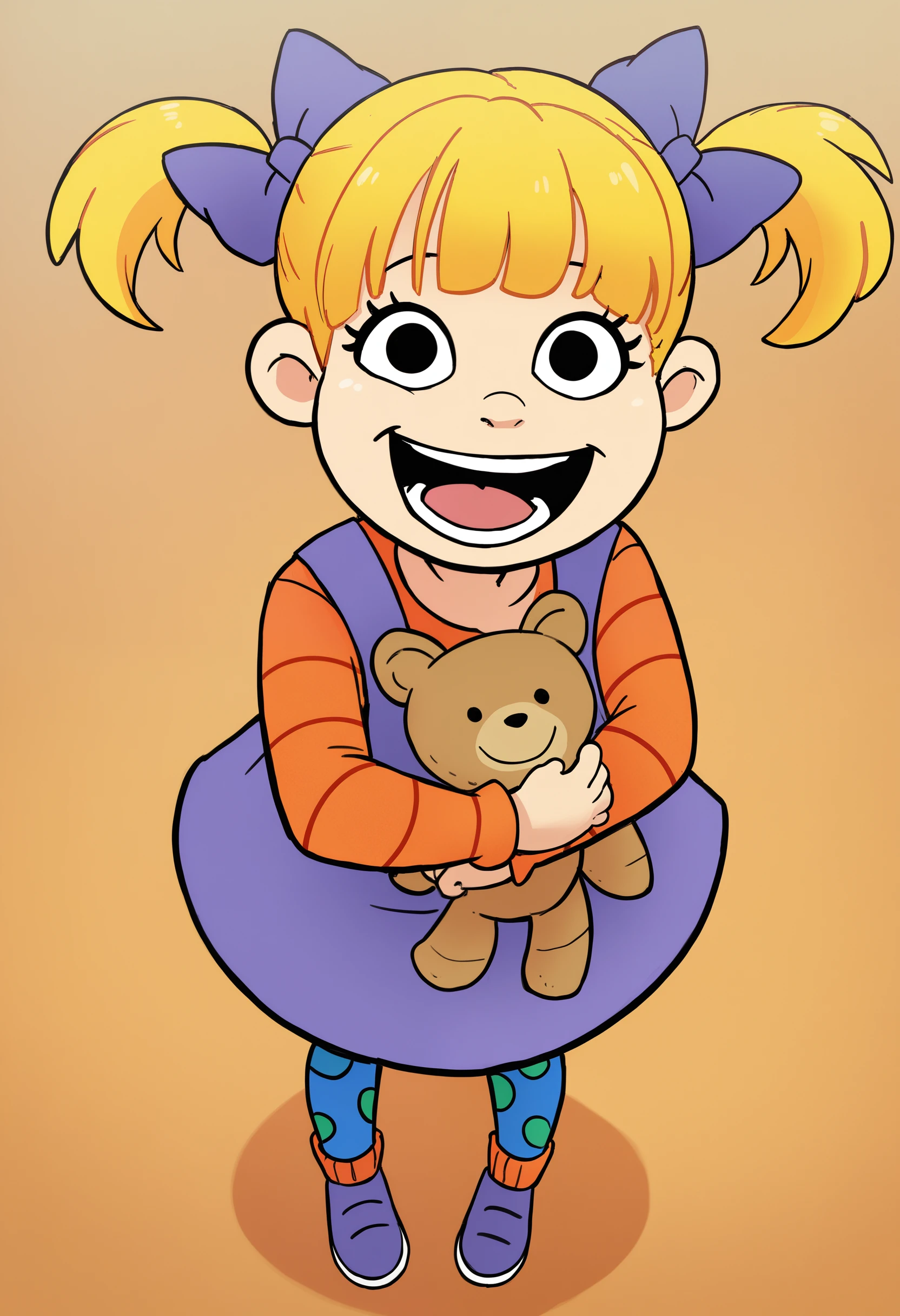 • Example prompt: "score_9, score_8_up, score_7_up, score_6_up, score_5_up, score_4_up, source_cartoon, BREAK, rating_safe, BREAK, AngXL, a little girl with blonde hair styled in pigtails with bows, wearing a purple dress with orange sleeves, blue leggings with green dots and purple sneakers"