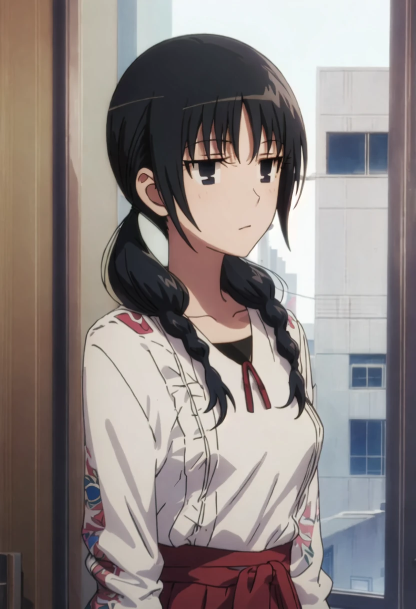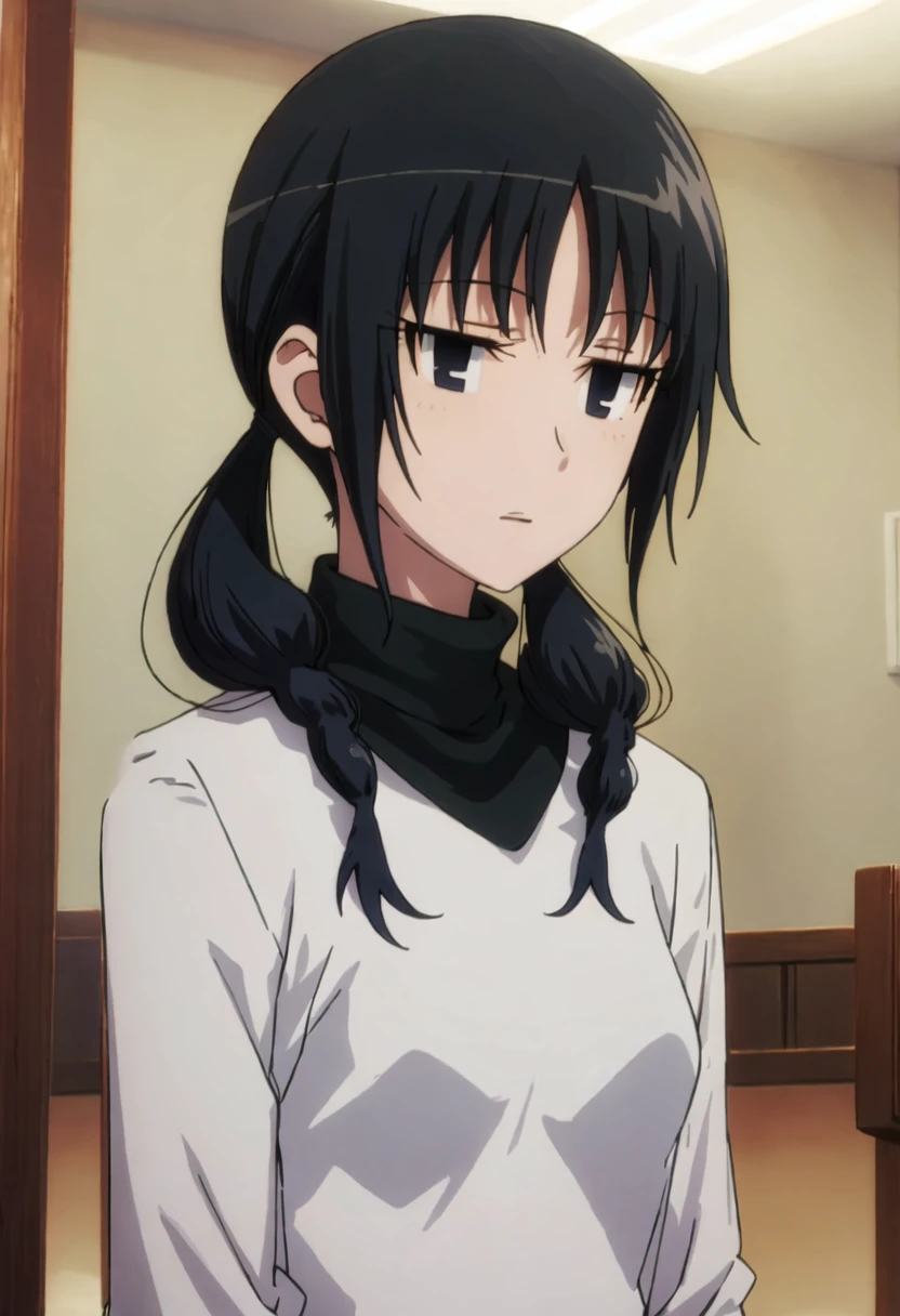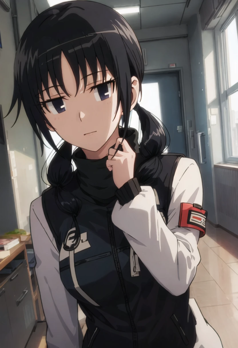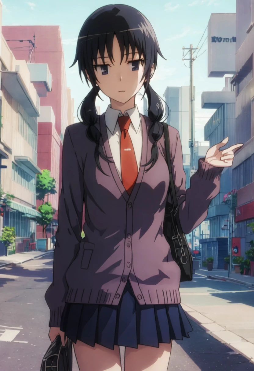 The trigger word is uomi_chihiro_seitokaiyakuindomo, and the pruned tags are black_hair, twintails, long_hair, low_twintails, black_eyes.