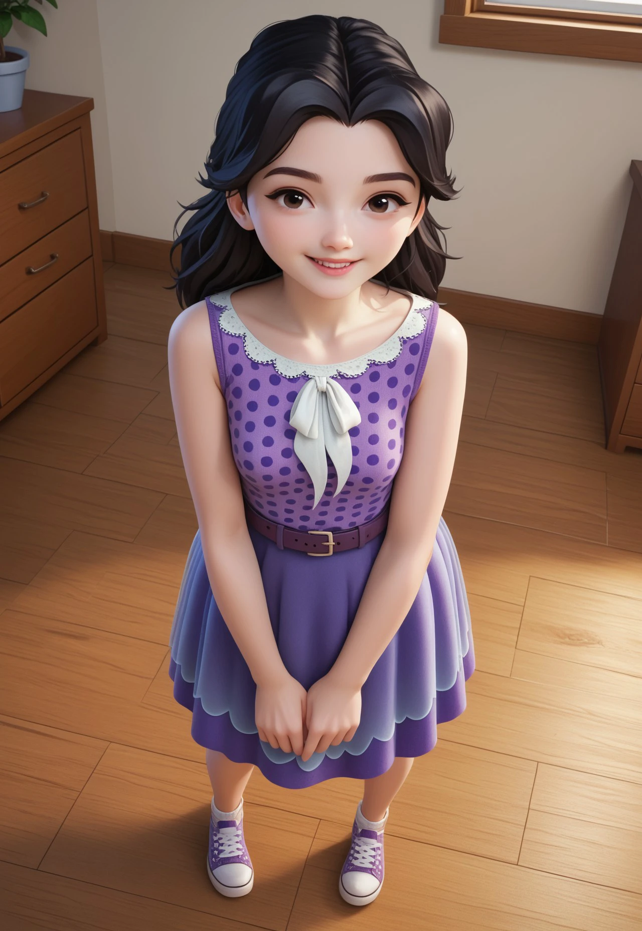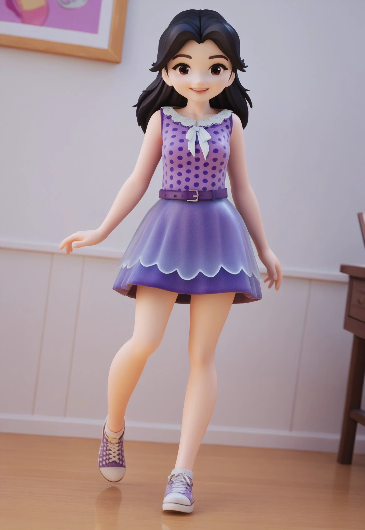 emma_lego, black hair, long hair, black eyes, polka dot dress, purple dress, sleeveless, belt, shoes
