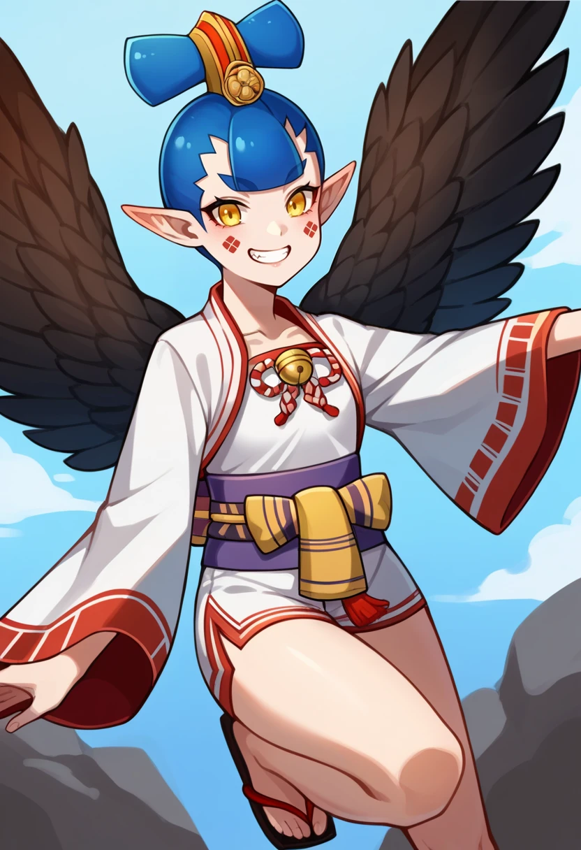 amanazokosmtv, blue hair, hair ornament, yellow eyes, pointy ears, black wings, kimono, wide sleeves, geta,