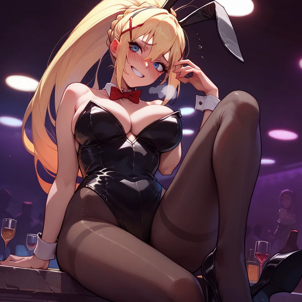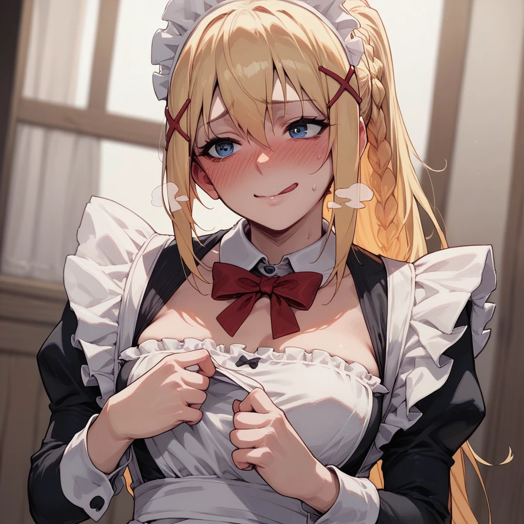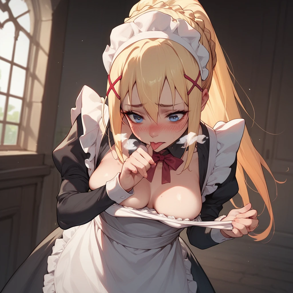 darkness, blonde, blue eyes, long hair, ponytail, x hair ornament, braid, largue breast,