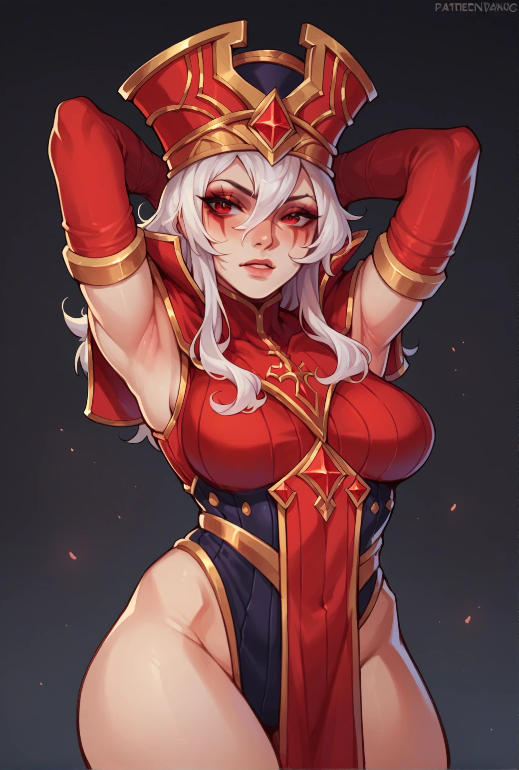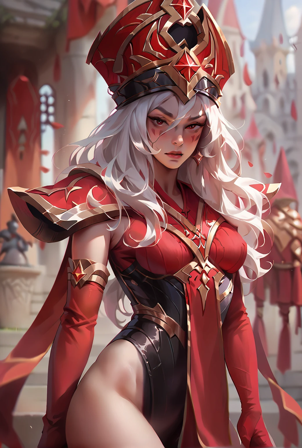 whitemane, white hair, red eyes, facial markings, leotard, tabard, thigh highs, elbow gloves, shoulder armor, hat, pelivc curtain
