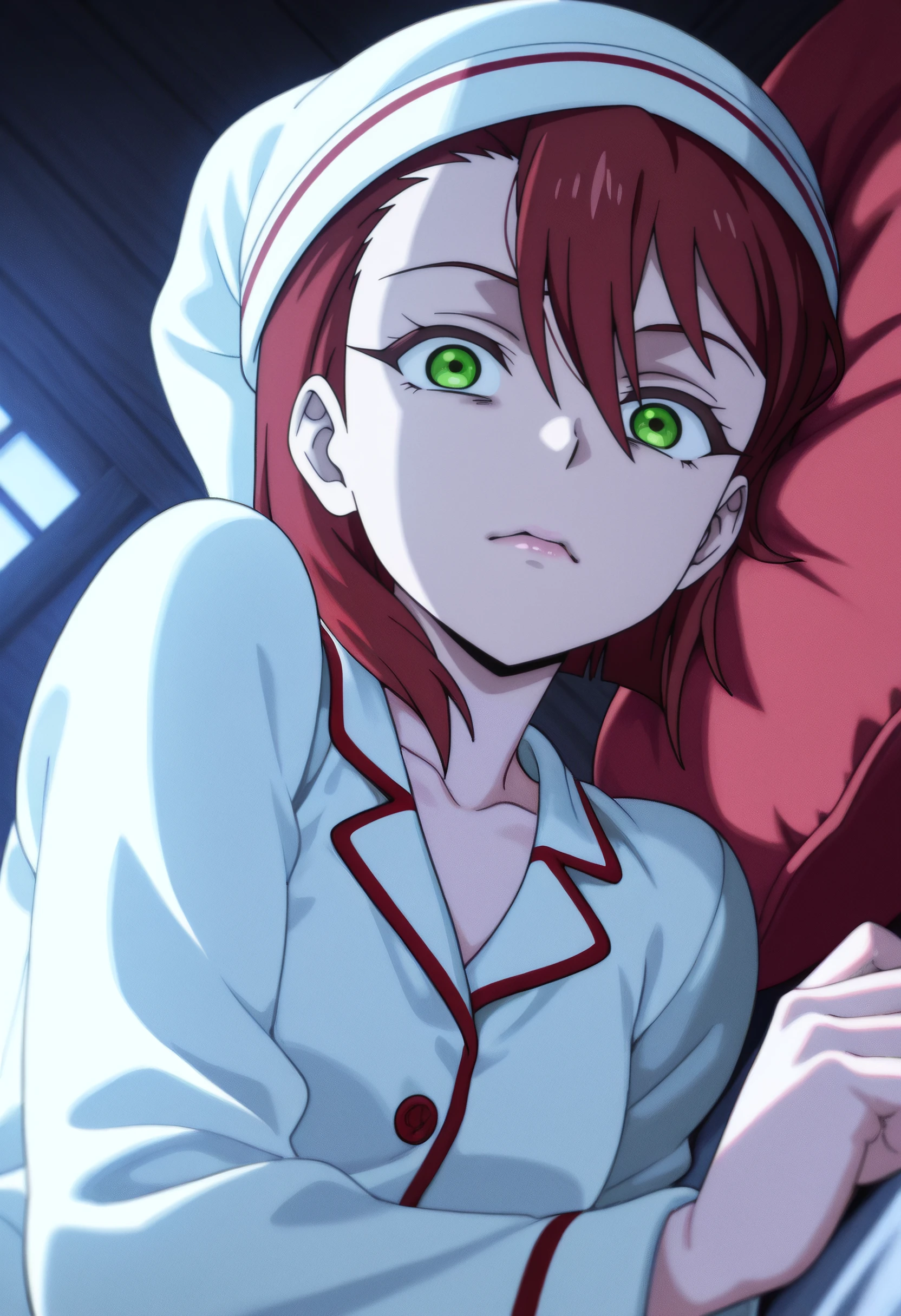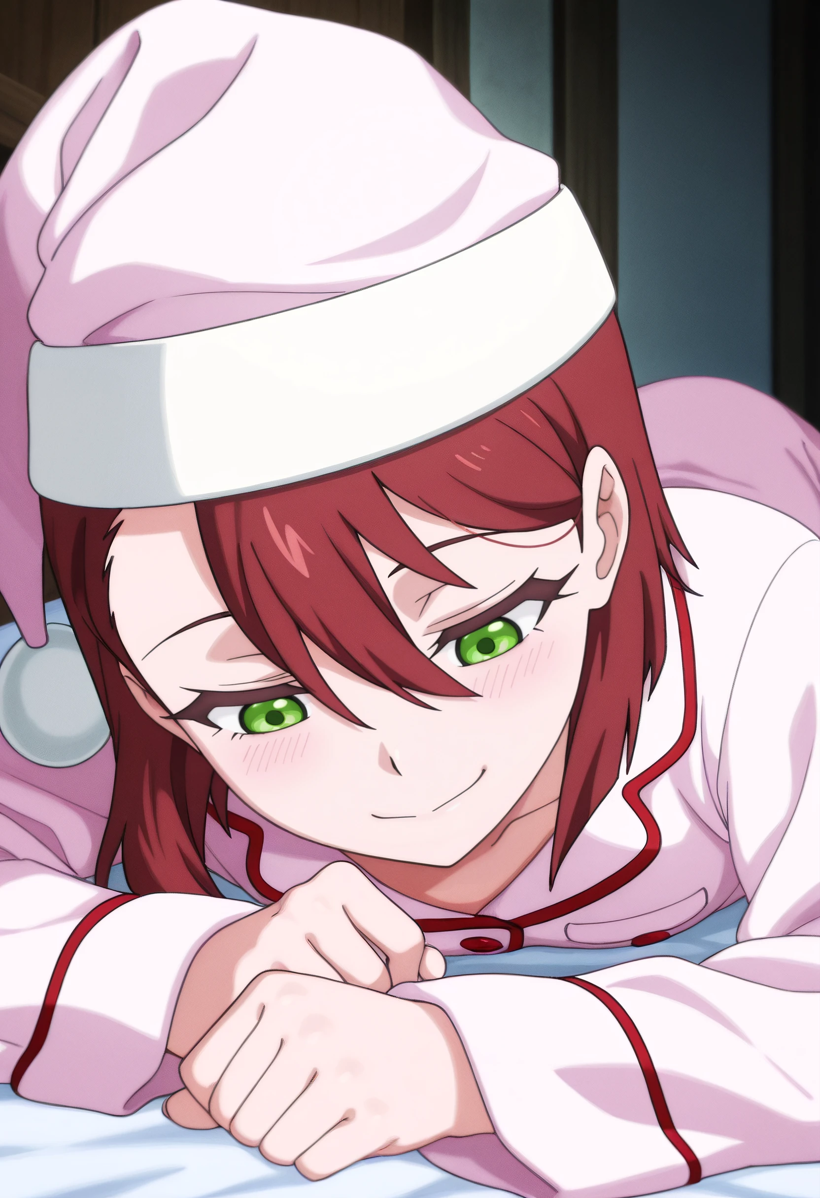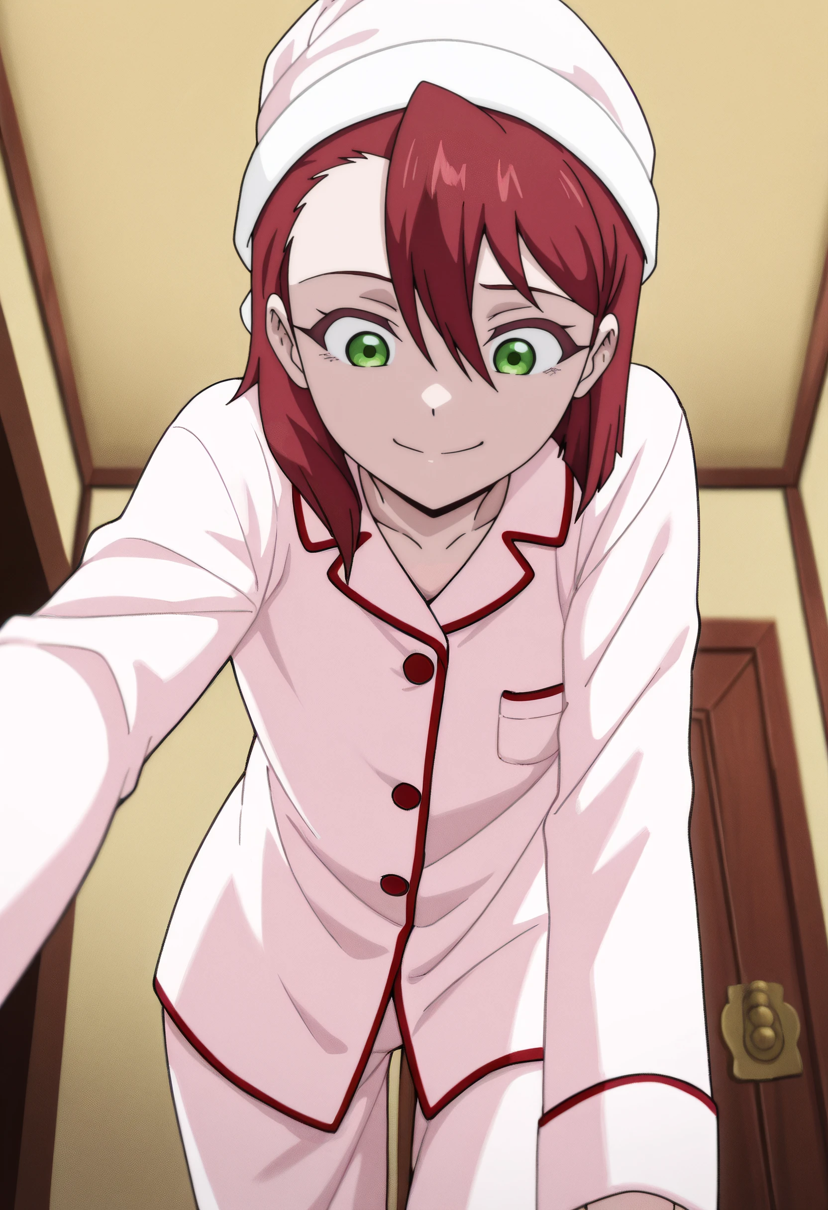 DinaSleepwear, pajamas, hat, nightcap, sleepwear, white pajamas, long sleeves, buttons, hair between eyes,