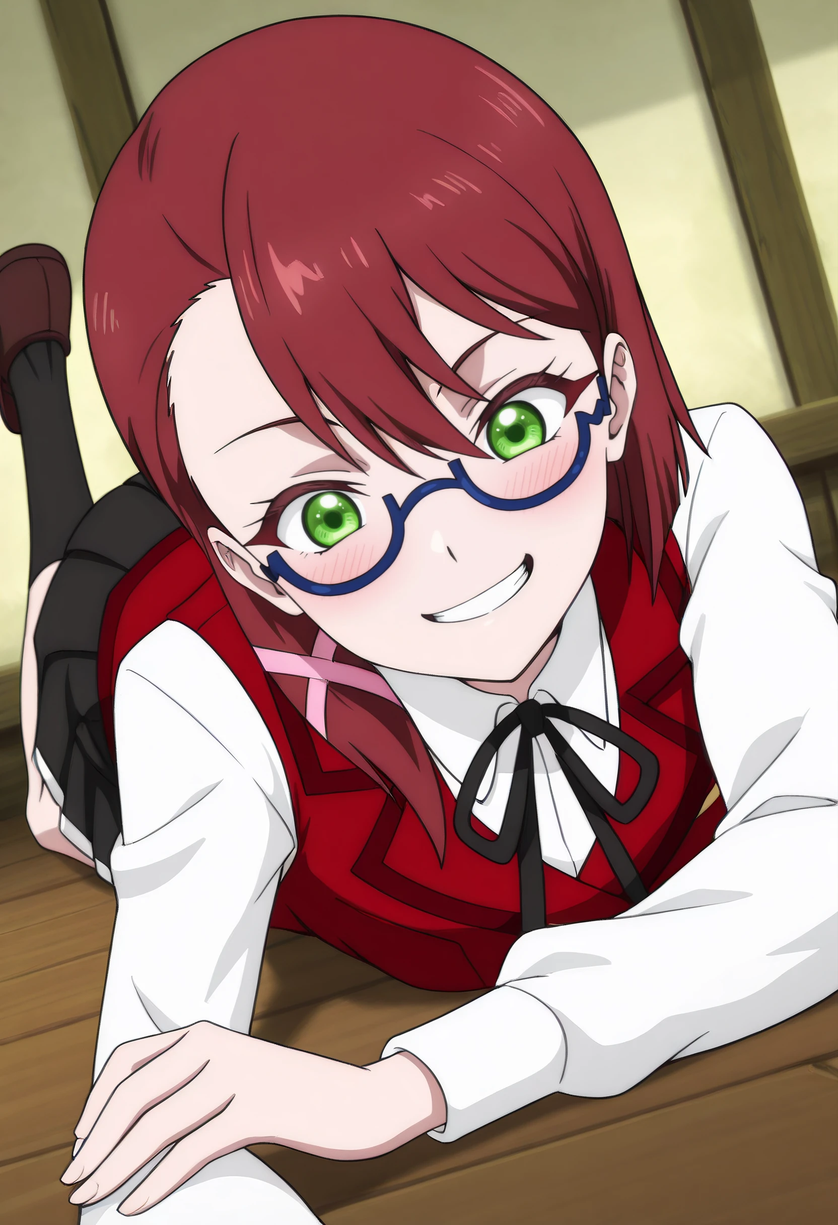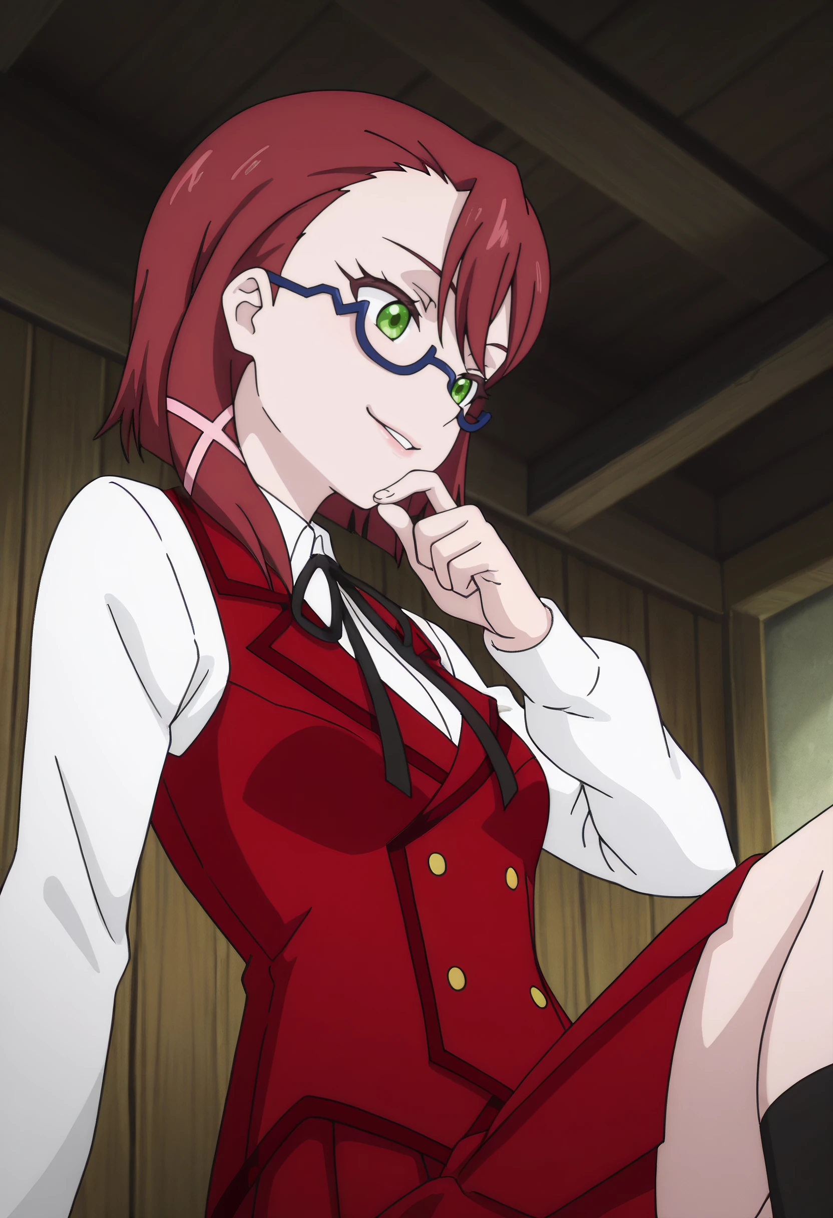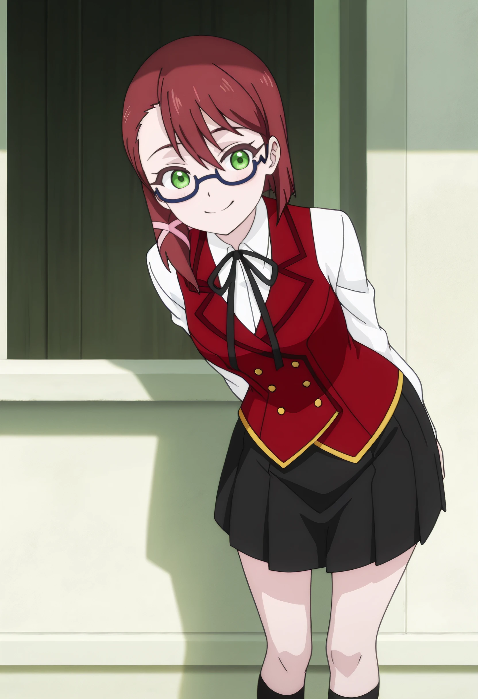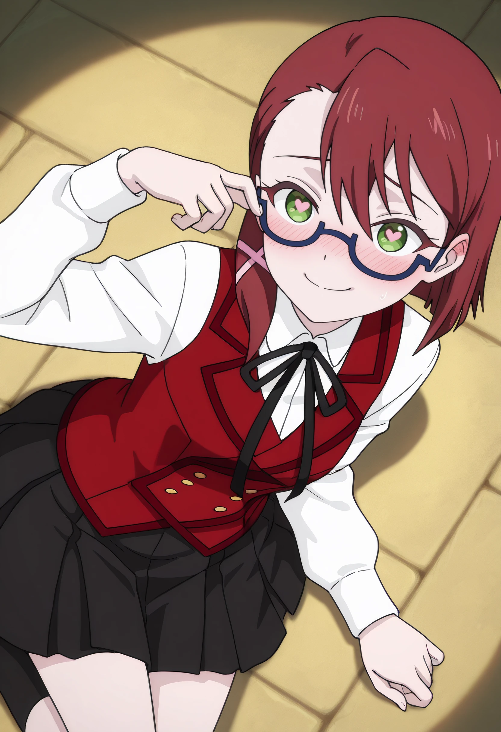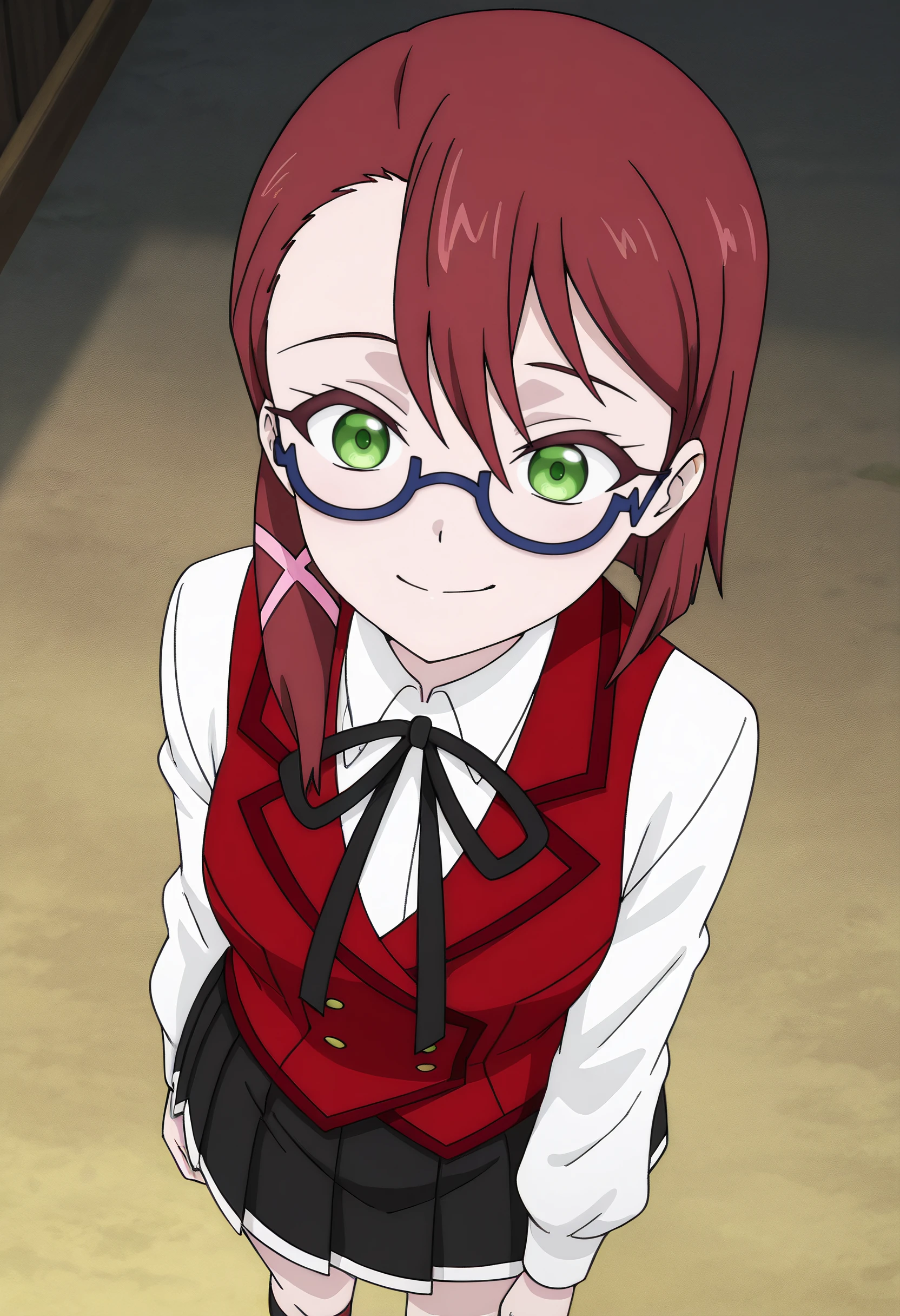 DinaSchool, glasses, school uniform, vest, ribbon, semi-rimless eyewear, shirt, white shirt, brown vest, black ribbon, neck ribbon, hair ornament, long sleeves, red-framed eyewear, hair ribbon, collared shirt, asymmetrical hair, skirt, pleated skirt, black socks, socks, x hair ornament, dress shirt, hair over shoulder, black skirt, side ponytail, wing collar,
