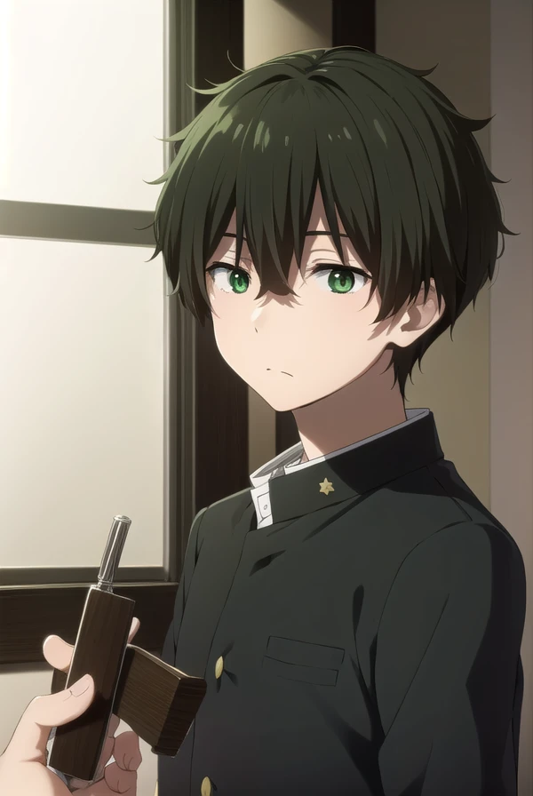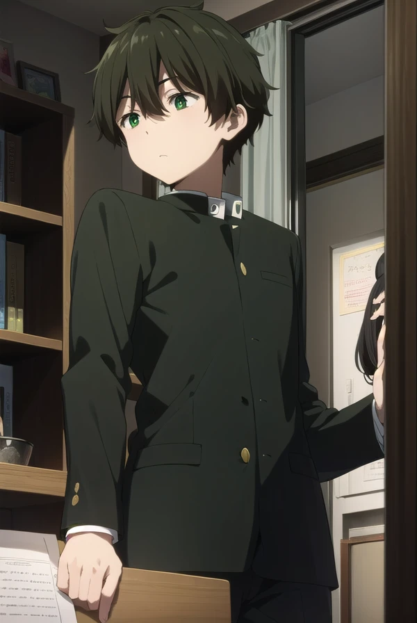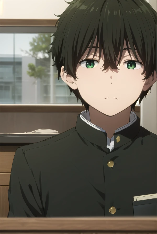 houtarou oreki, short hair, bangs, black hair, hair between eyes, (green eyes:1.5), male focus,