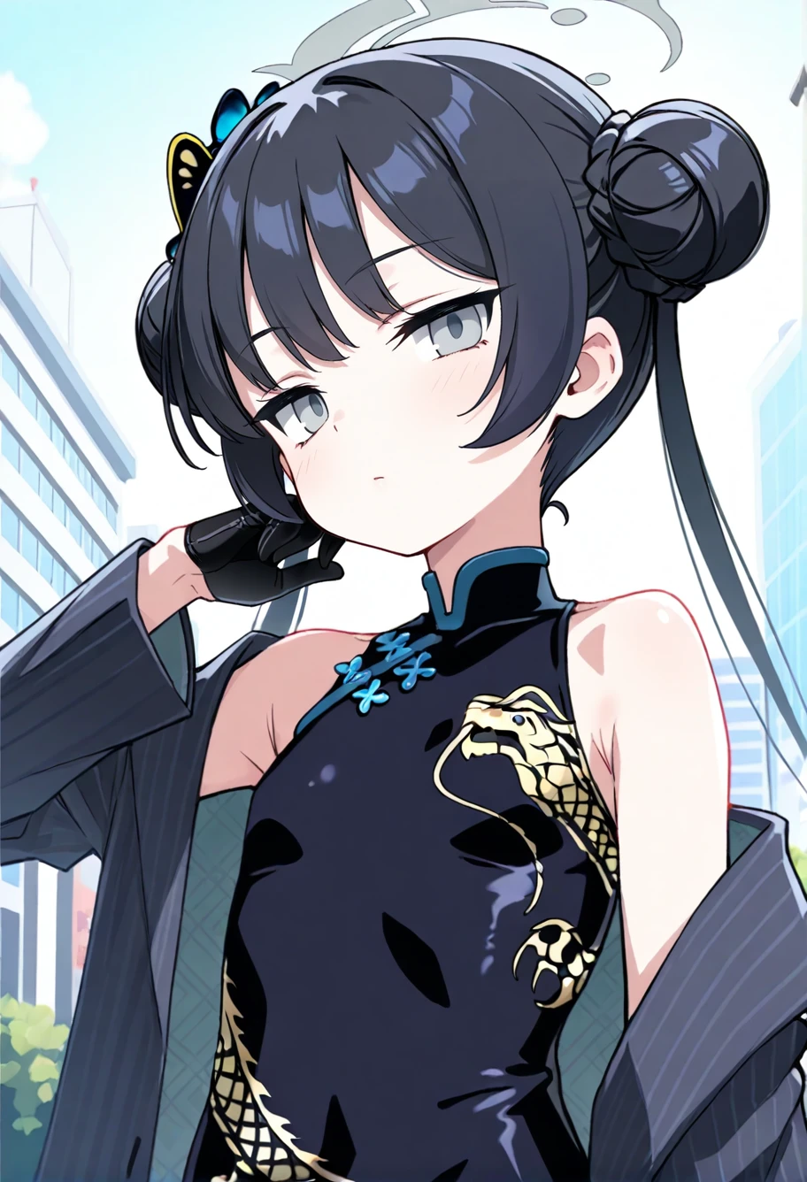 kisaki-default, kisaki \(blue archive\),grey eyes,black hair, double bun,twintails,halo,grey jacket,china dress,pelvic curtain,high heels,black gloves