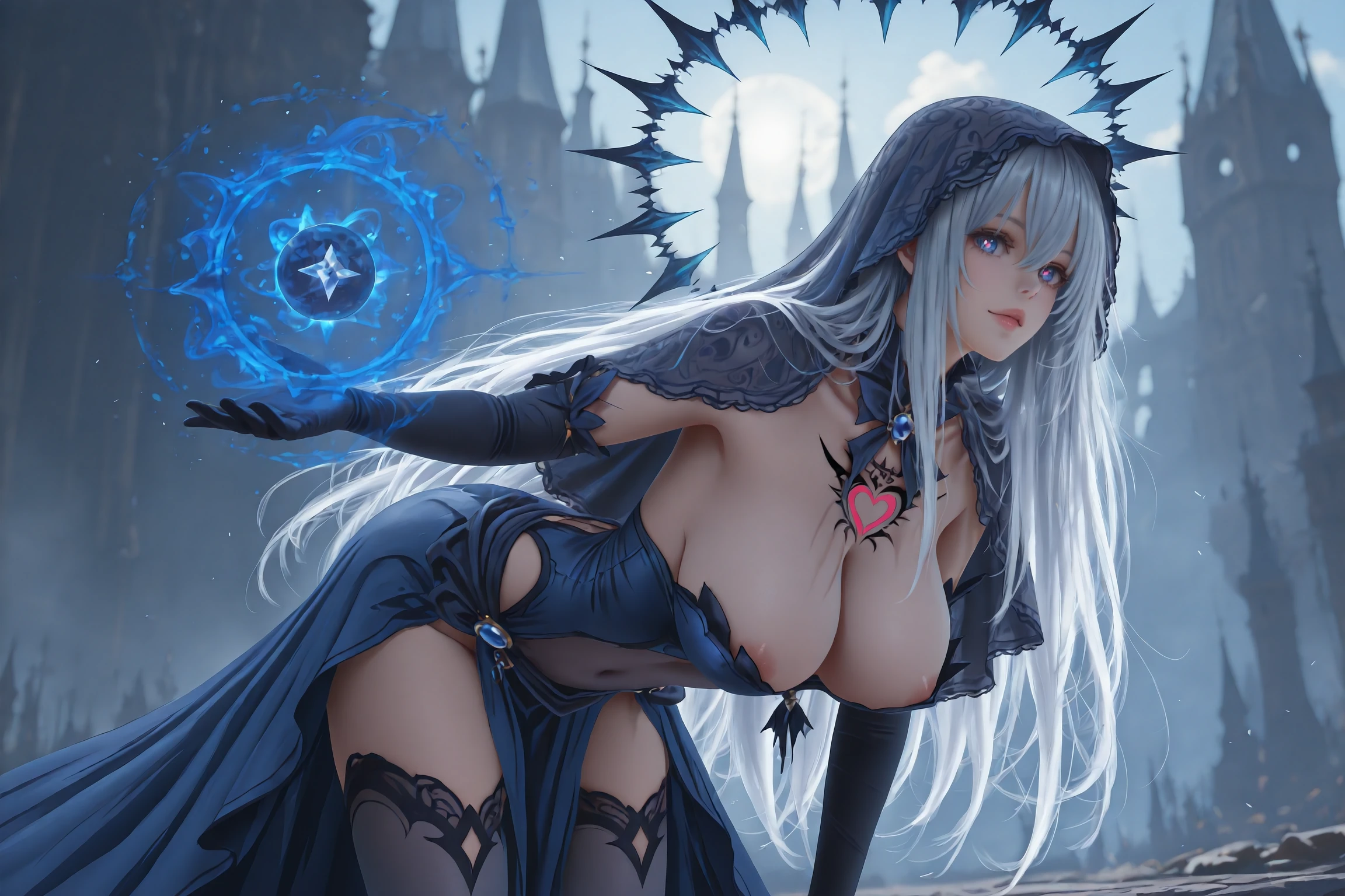 Demonblender,1girl,gloves,long hair,solo,veil,thighhighs,dress,white hair,tattoo,black gloves,elbow gloves,blue eyes,very long hair,blue dress,bare shoulders,dark persona,pubic tattoo,hair ornament,symbol-shaped pupils