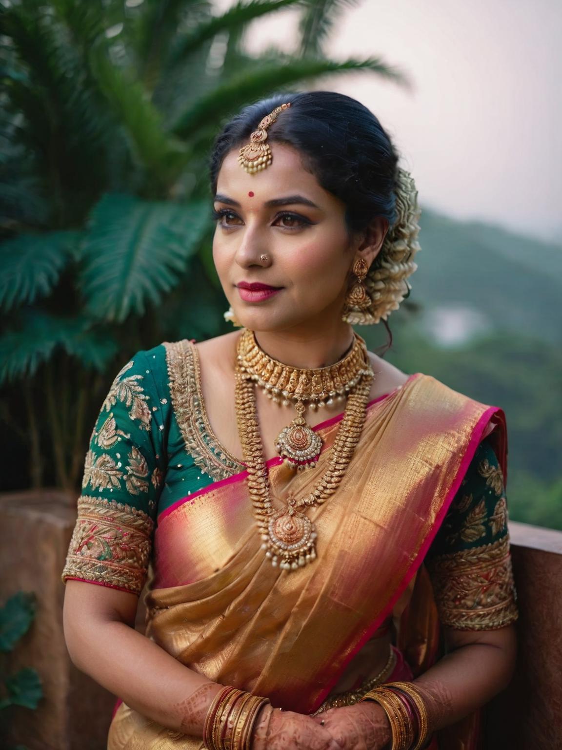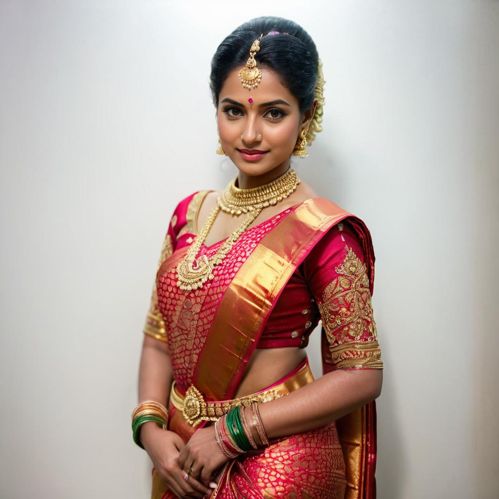 The South Indian Bridal Saree LoRa is an intricately crafted representation of the elegance and cultural richness in the traditional bridal attire of South Indian state of Tamil Nadu.