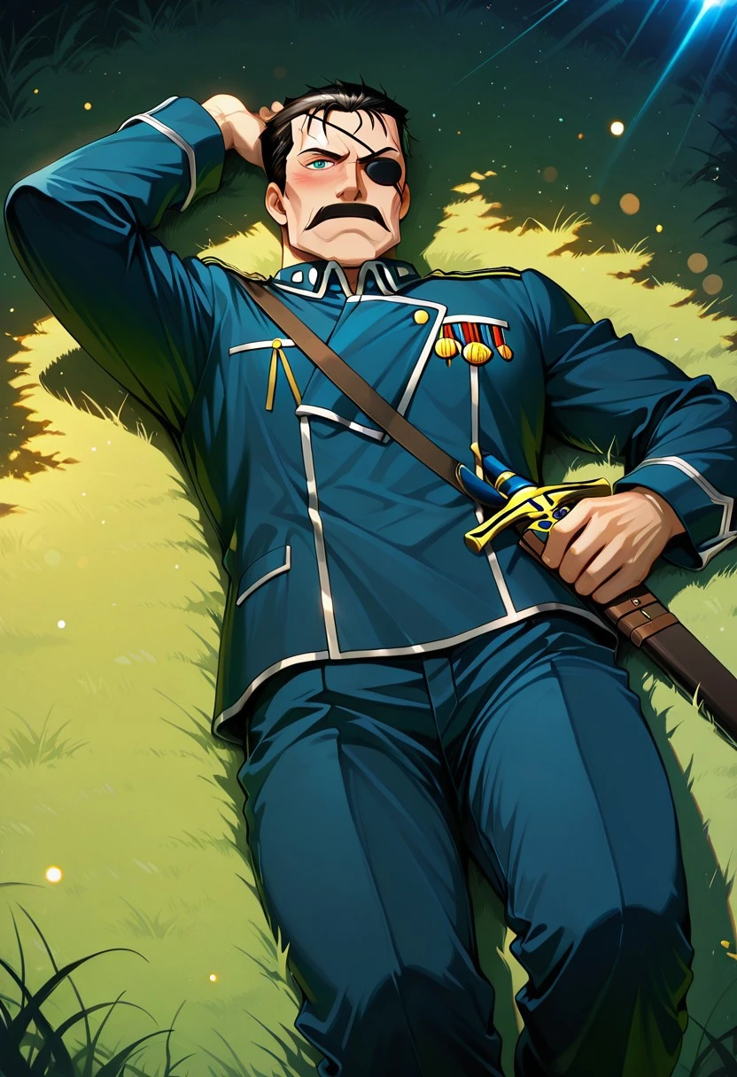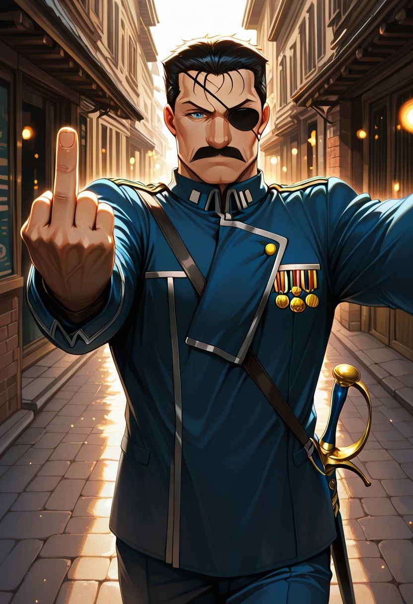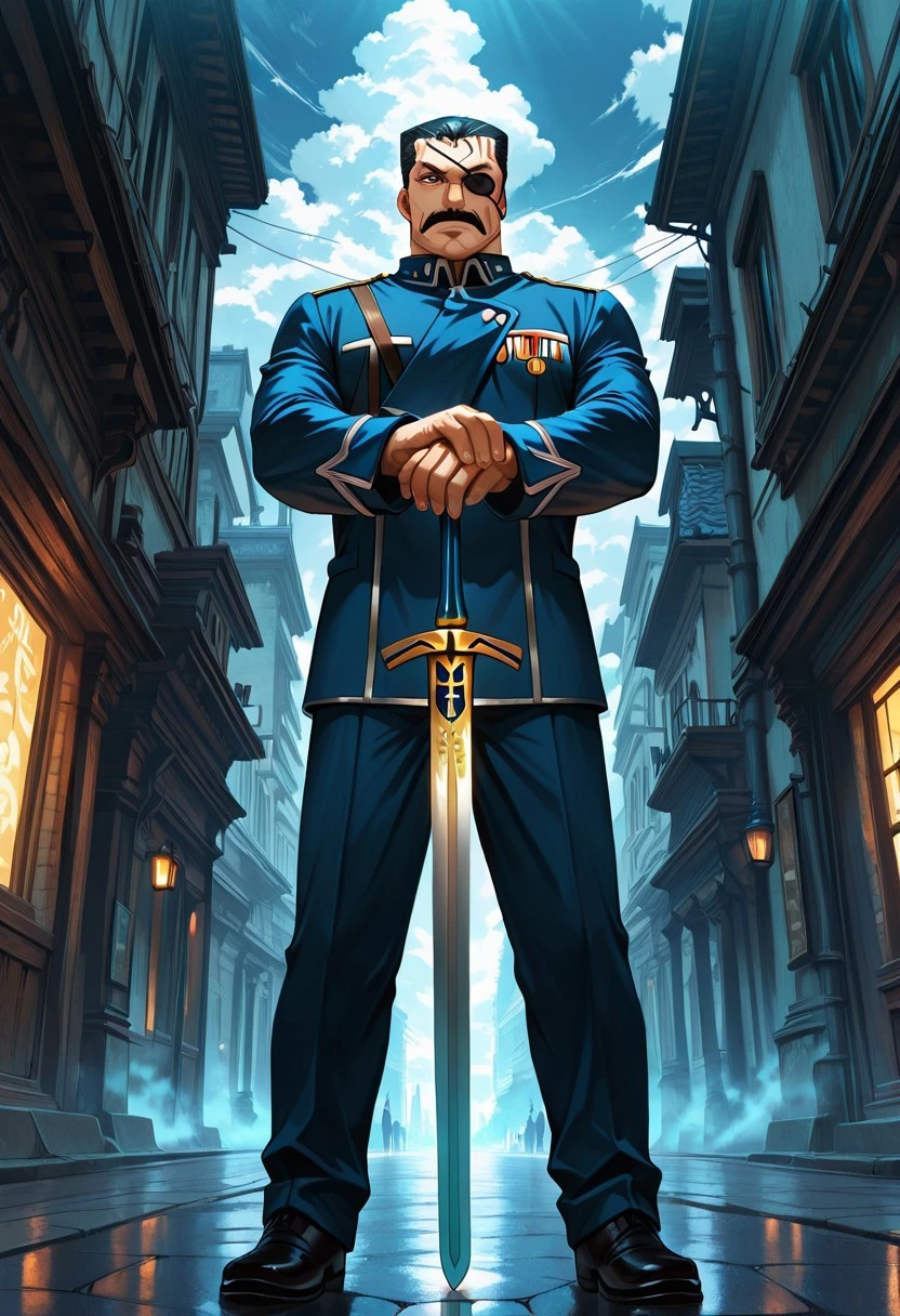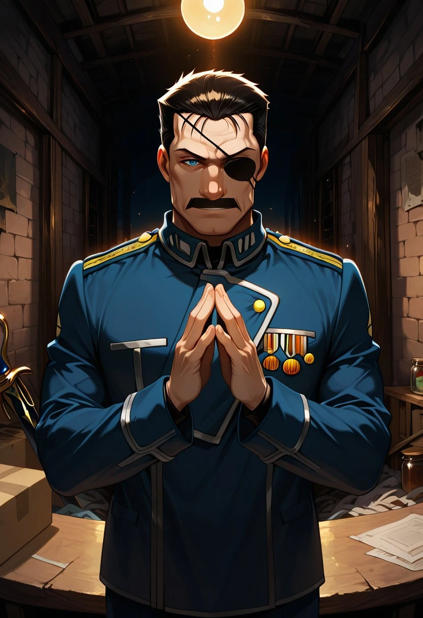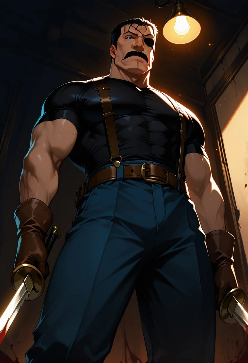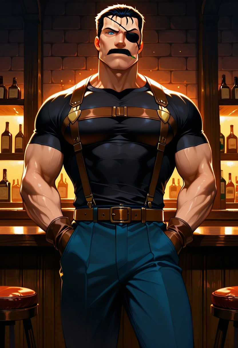 old male, muscular male, short hair, black hair, blue eye, facial hair, cheek bone, small pupils, eyepatch, facial hair, mustache, cleft chin,