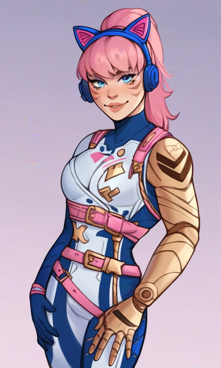 Sora, pink hair, ponytail, cat whisker tattoos, tattoos on cheeks, midnight blue headphones with cat ears, gold robotic left arm, white racing suit with blue markings, midnight blue glove on right hand, pink belt, pink bandolier