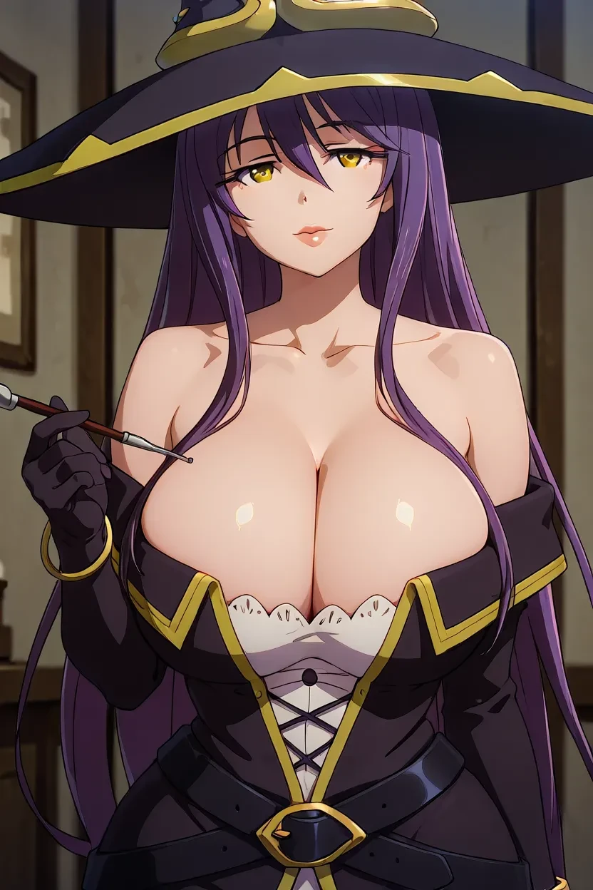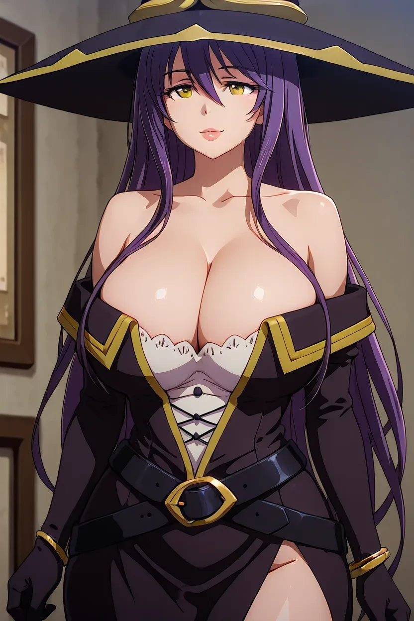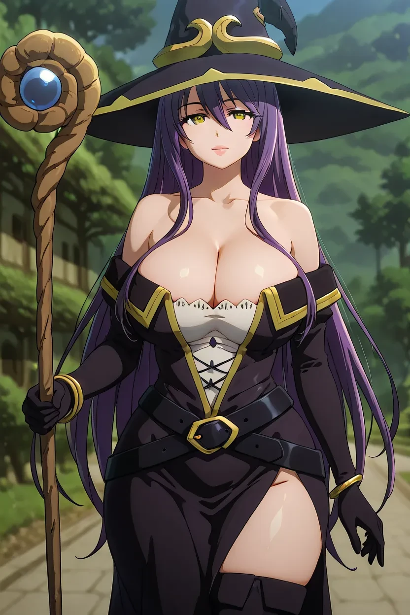 1girl, Majo (Goblin Slayer), purple hair, long_hair, yellow eyes, glossy lips, thick lips, goblin_slayer_art_style, HD, high-resolution, 8k, superb quality, clean animation