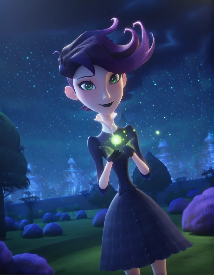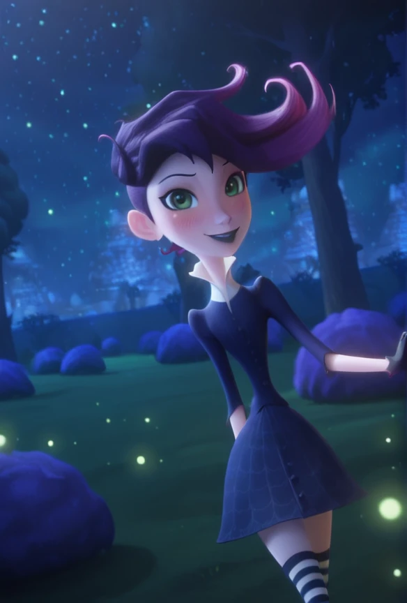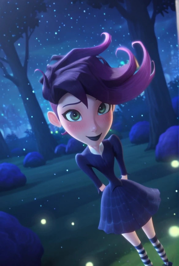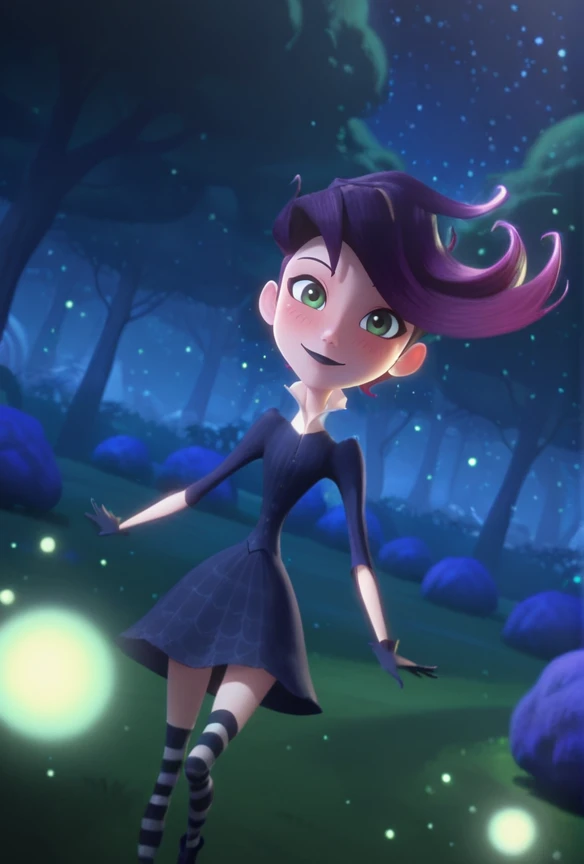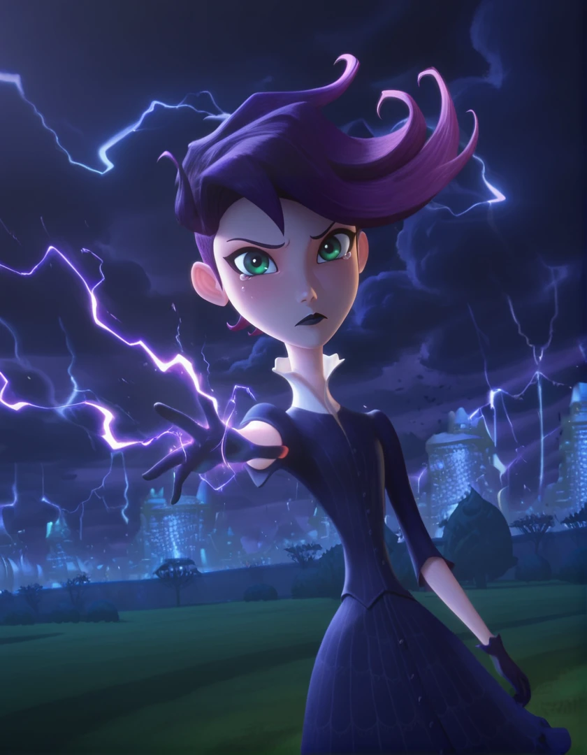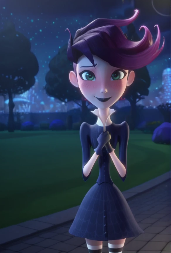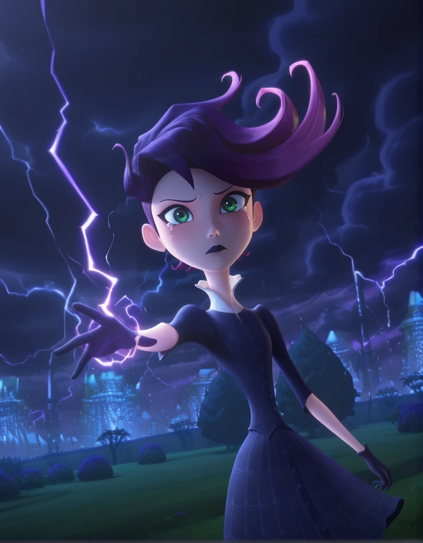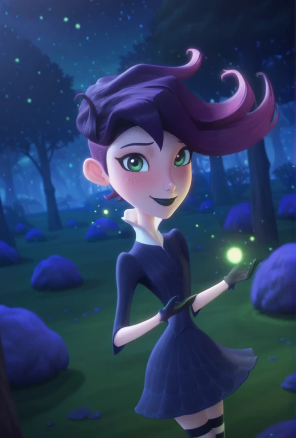 west_illus, green eyes, purple hair, lipstick, makeup, dress, striped thighhighs, lipstick, black lips, makeup, gloves, black gloves, shoes