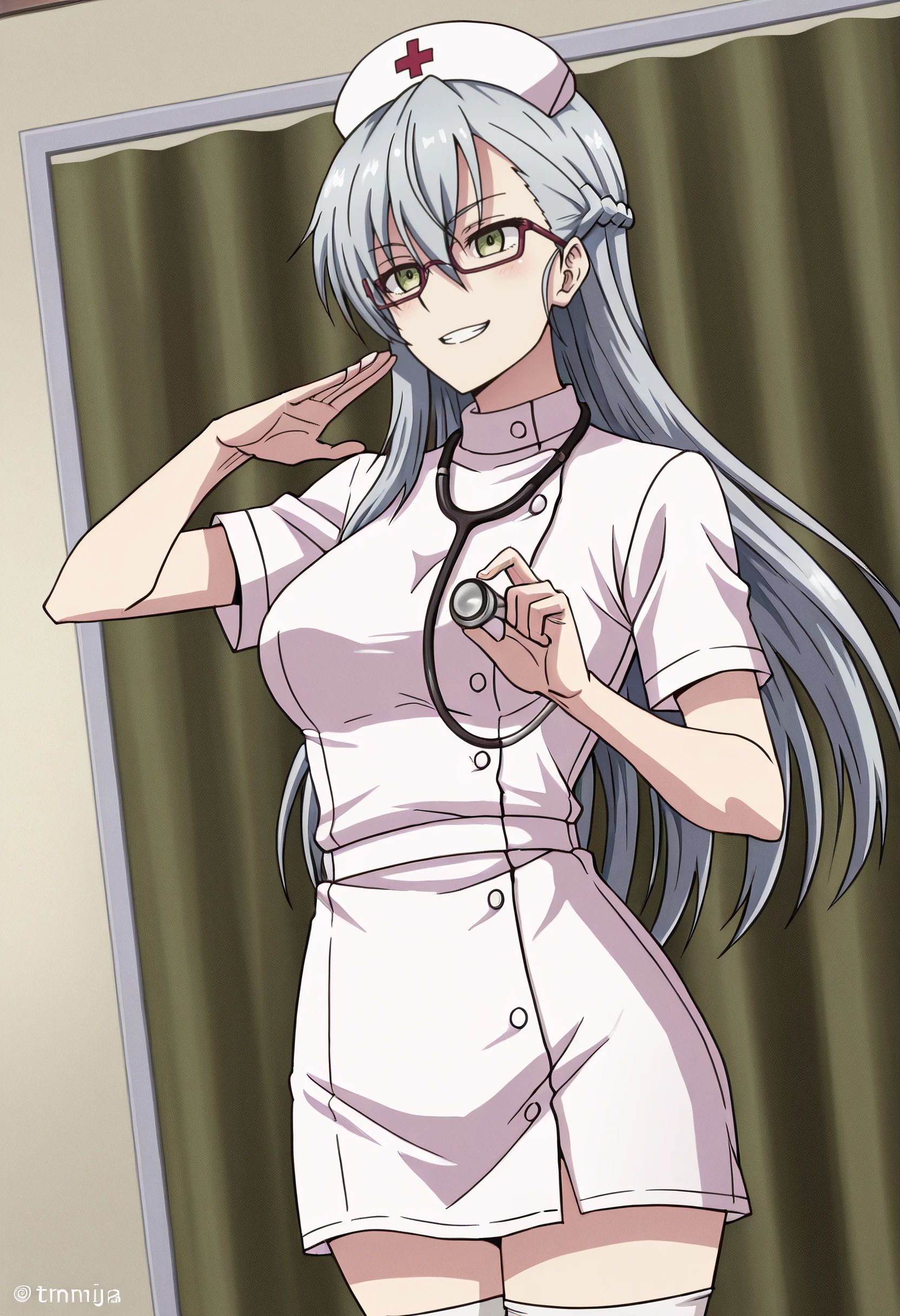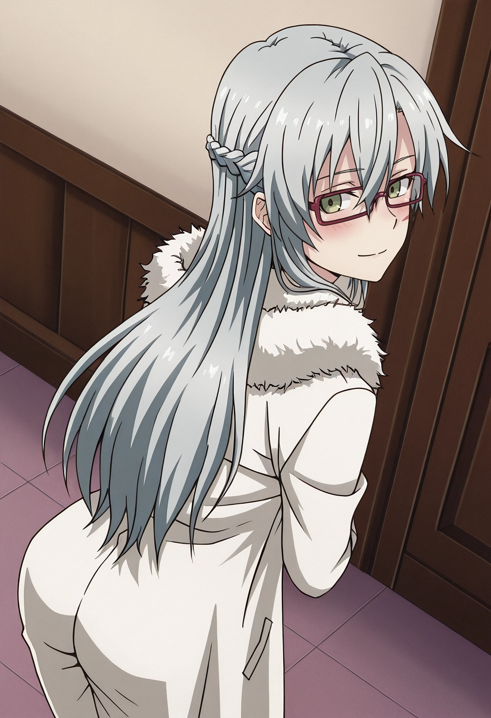 TNMMirja, glasses, long hair, red-framed eyewear, braid, grey hair, semi-rimless eyewear, half updo, french braid, half up braid, green eyes, hair between eyes,