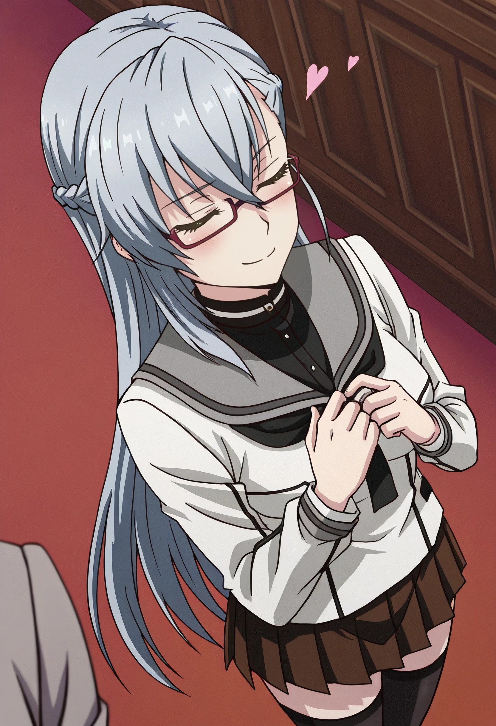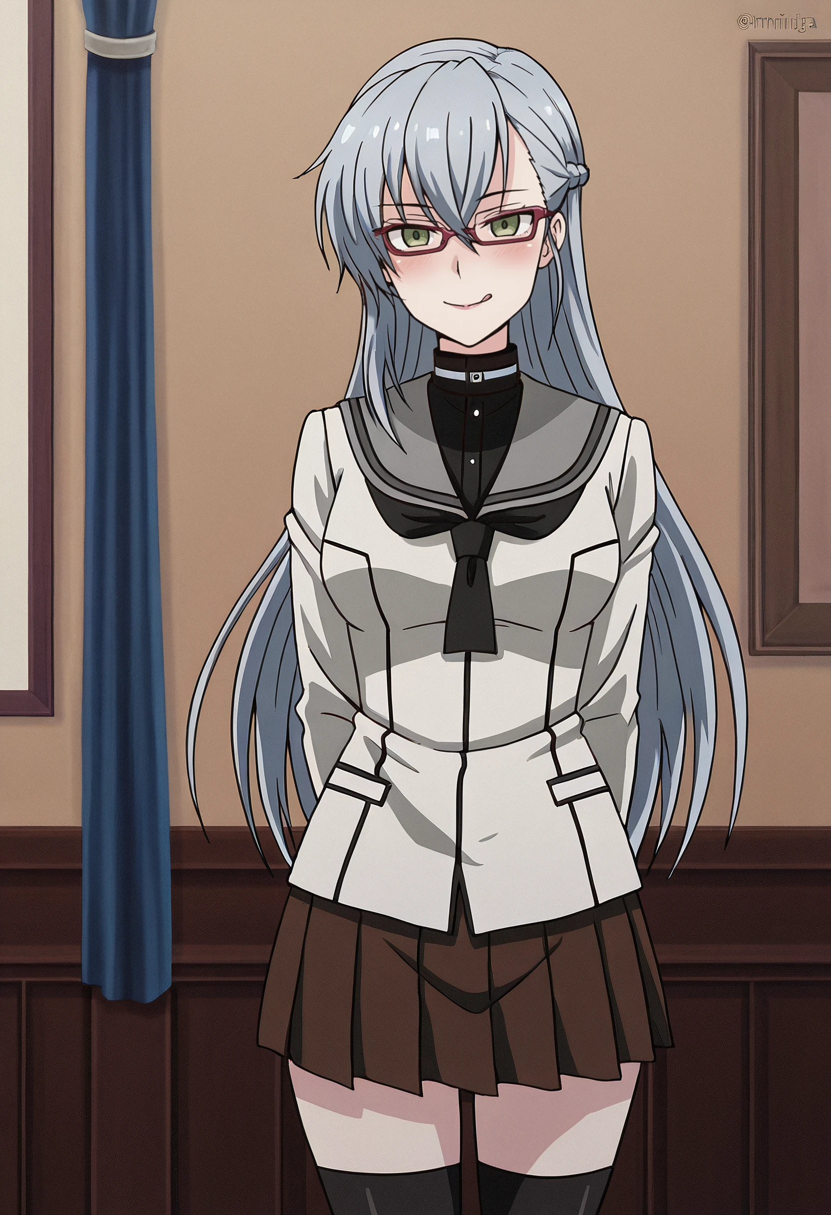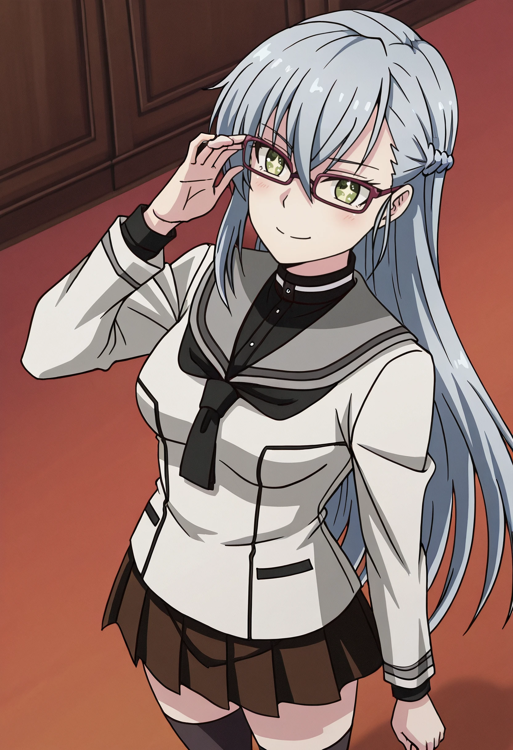 MirjaSchool, school uniform, serafuku, grey sailor collar, sailor collar, neckerchief, long sleeves, shirt, black neckerchief, necktie, skirt, pleated skirt, jacket, grey jacket, blazer, thighhighs, black shirt, black necktie, brown serafuku, brown skirt,