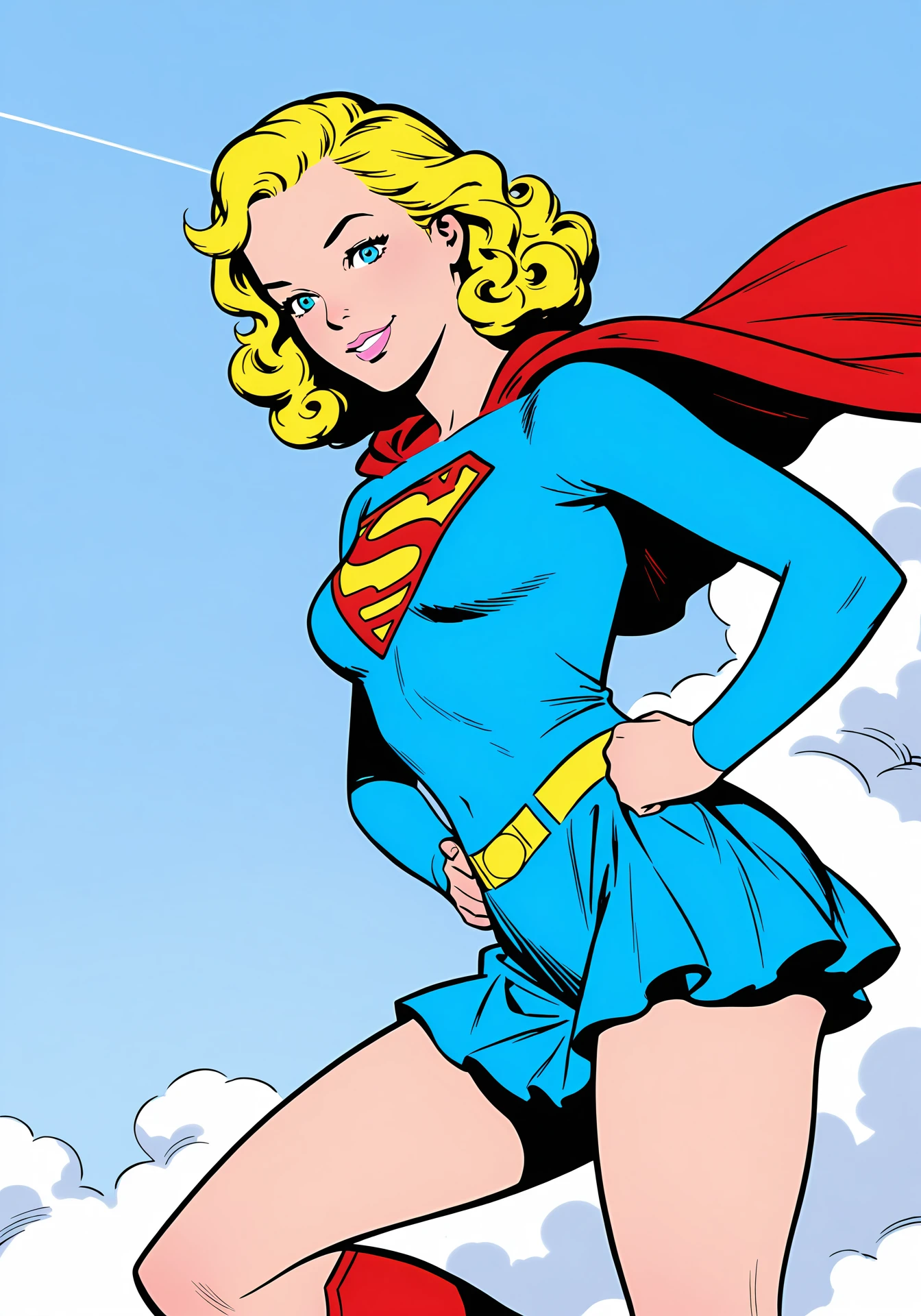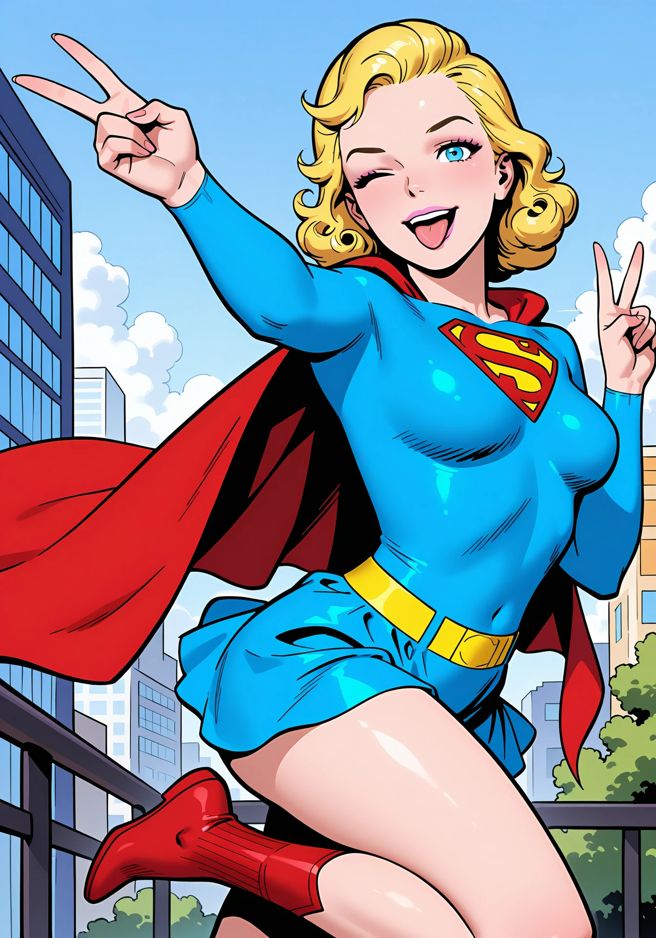 superhero, blue dress, yellow belt, red cape, red boots, superman logo