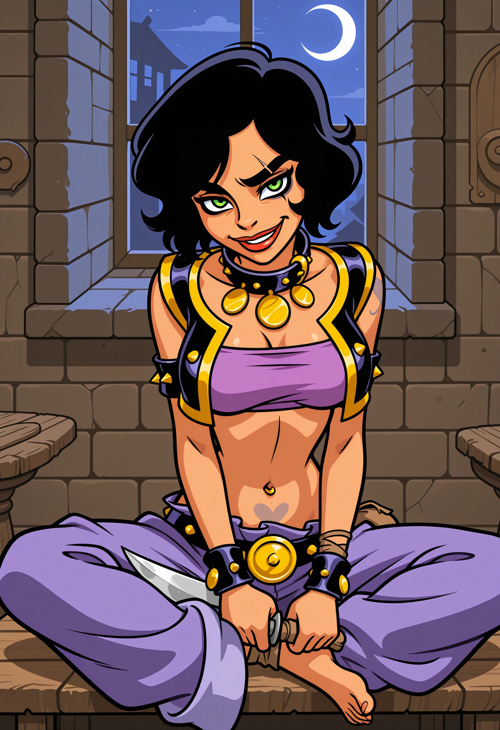 Prompt: iris_pt, 1girl, solo, black hair, green eyes, short hair, makeup, jewelry, bracelet, collar, open vest, bandeau, armlet, tattoo, navel, lipstick, pants, piercing, medium breasts, shoes