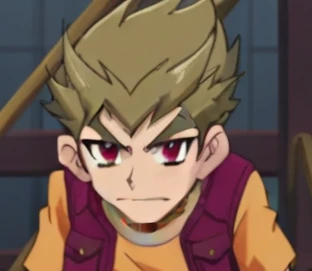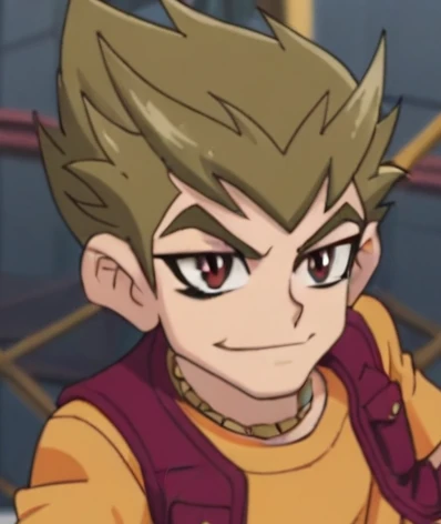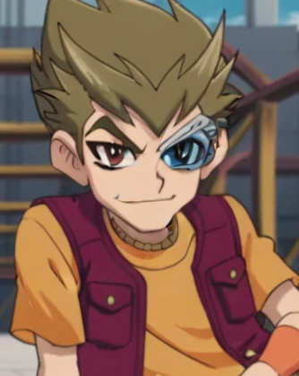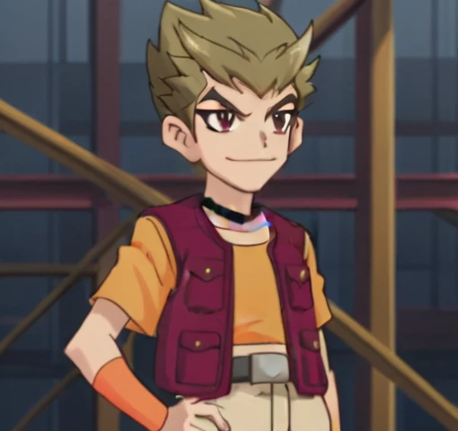 Prompts: male, blond hair, spiked hair, red eyes, v-shaped eyebrows, red vest, orange short-sleeve shirt, orange wristbands, belt, tan pants, boots, necklace, jewelry, hard hat hanging off back of neck, tinted eyewear over left eye, construction site
