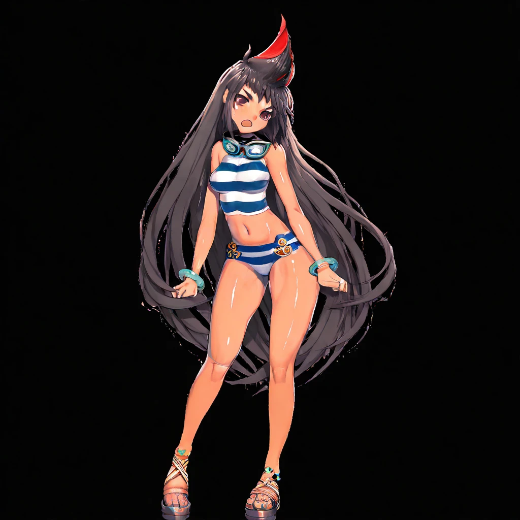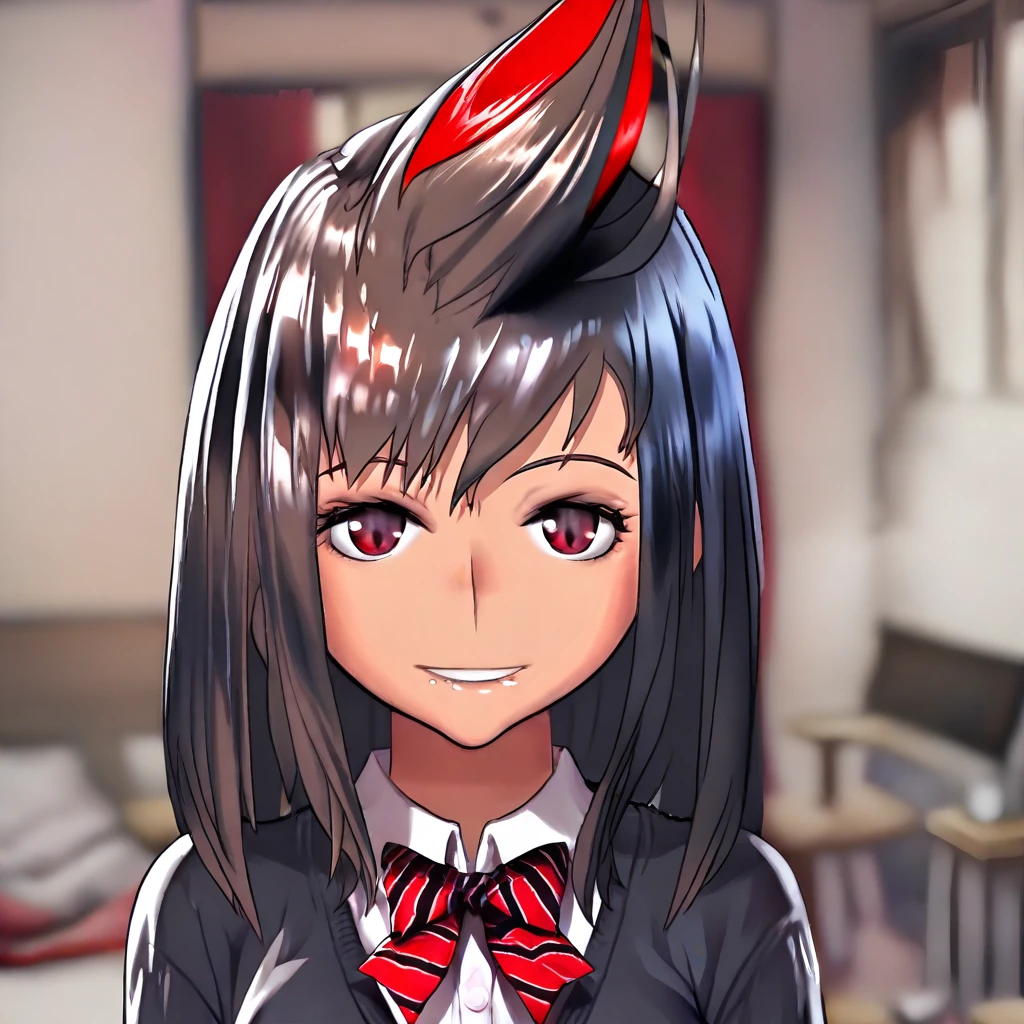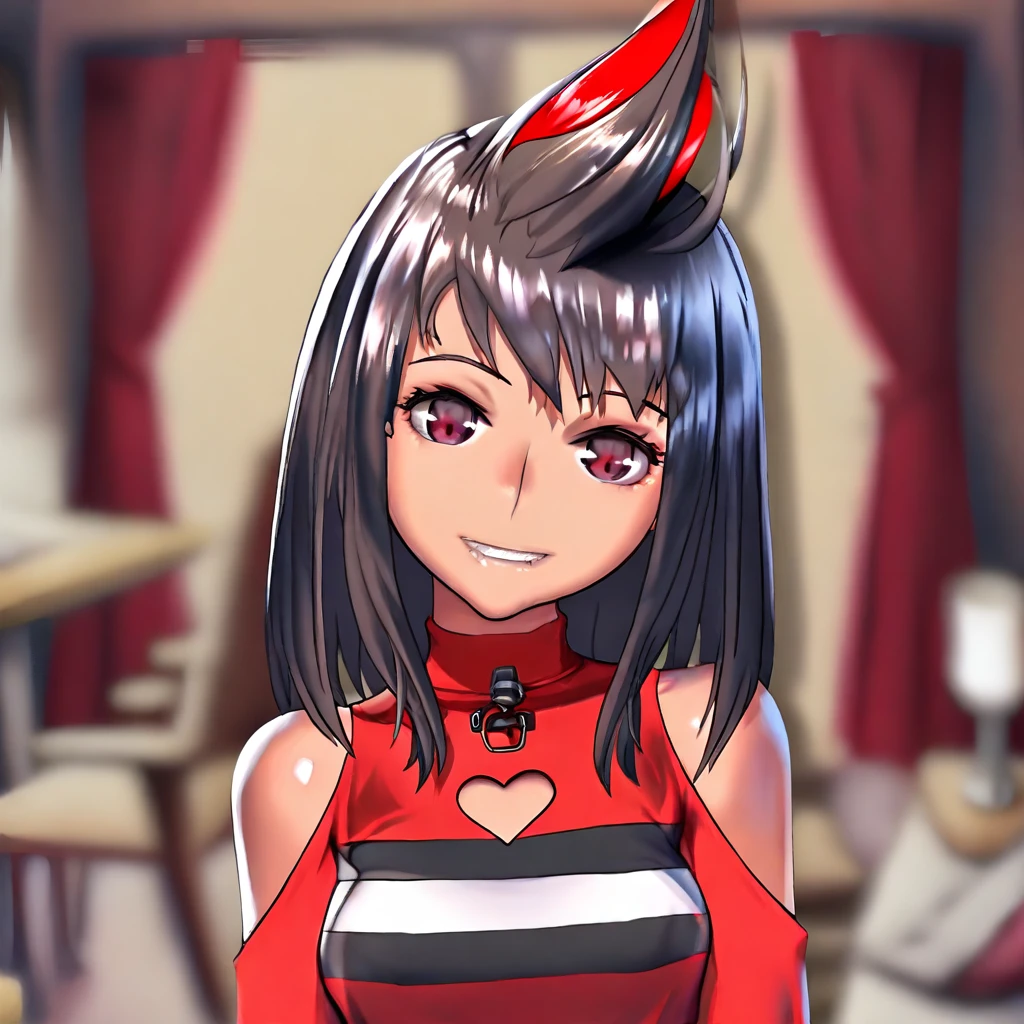 DCdering-tv, 1girl, medium hair, pompadour quiff hairstyle, black hair, red hair, multicolored hair, streaked hair, red eyes,