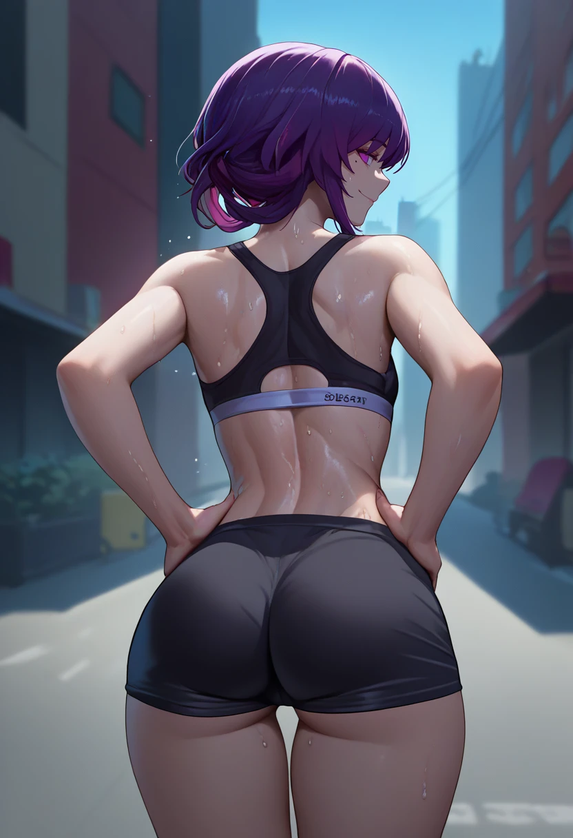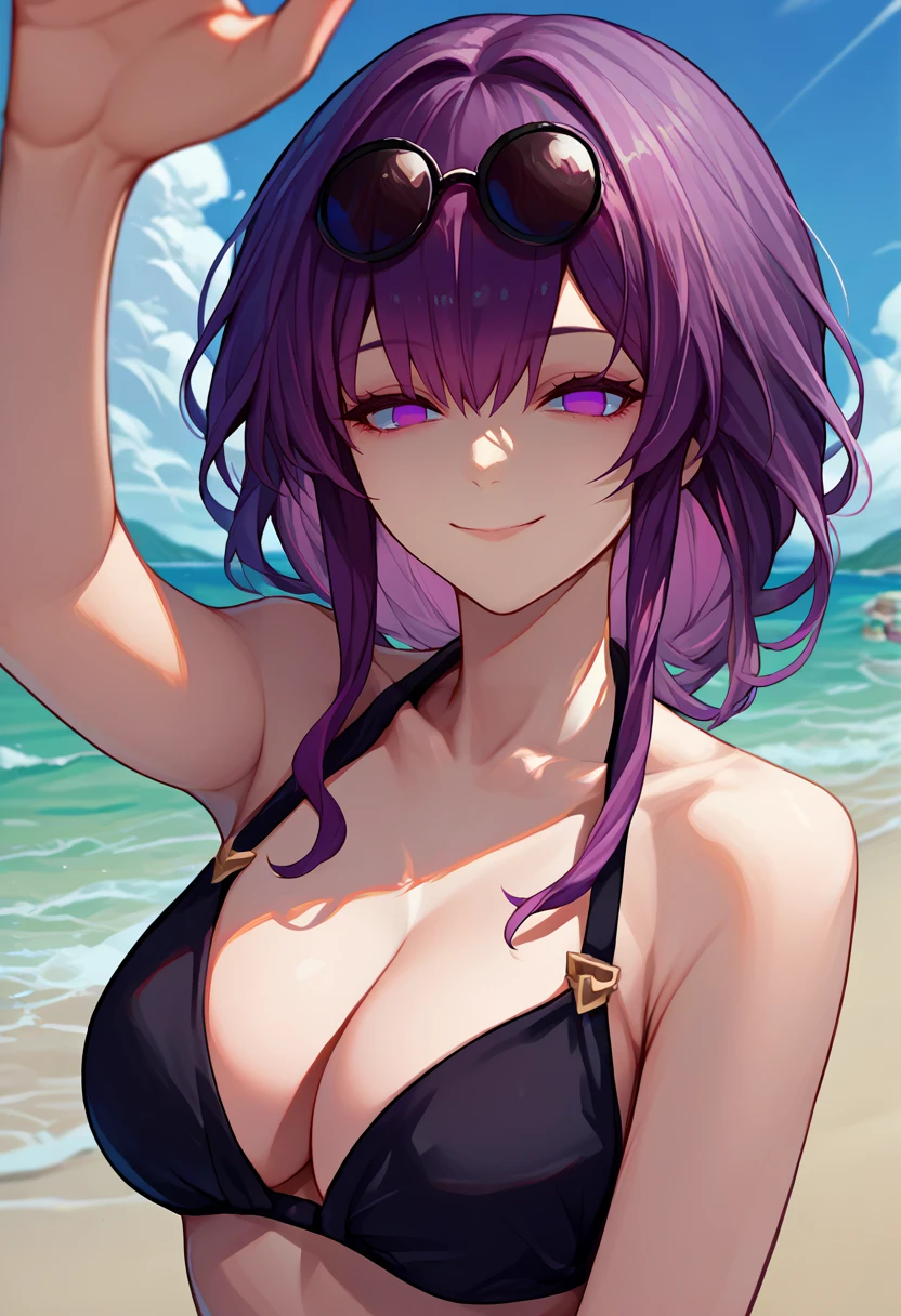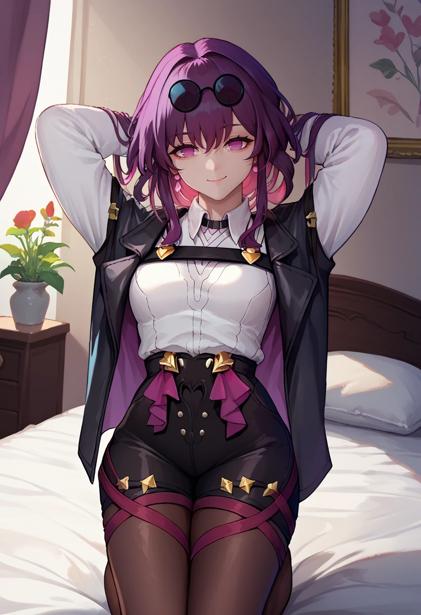 Default Outfit: kafkadef, sunglasses, pince-nez, eyewear on head, purple eyes, no pupils, black jacket, white shirt, collared shirt, long sleeves, chest harness, purple gloves, black shorts, high-waist shorts, pantyhose under shorts, earrings
