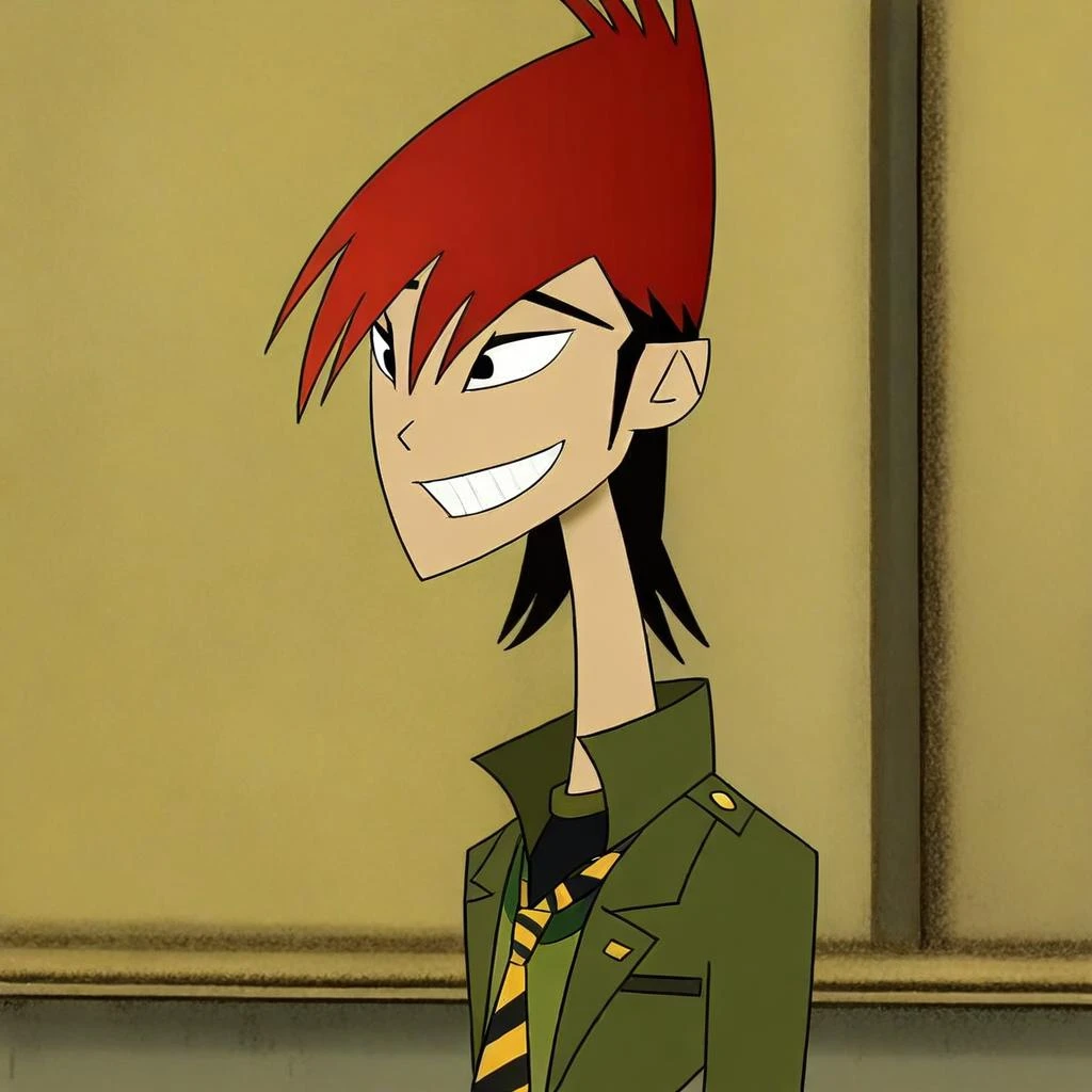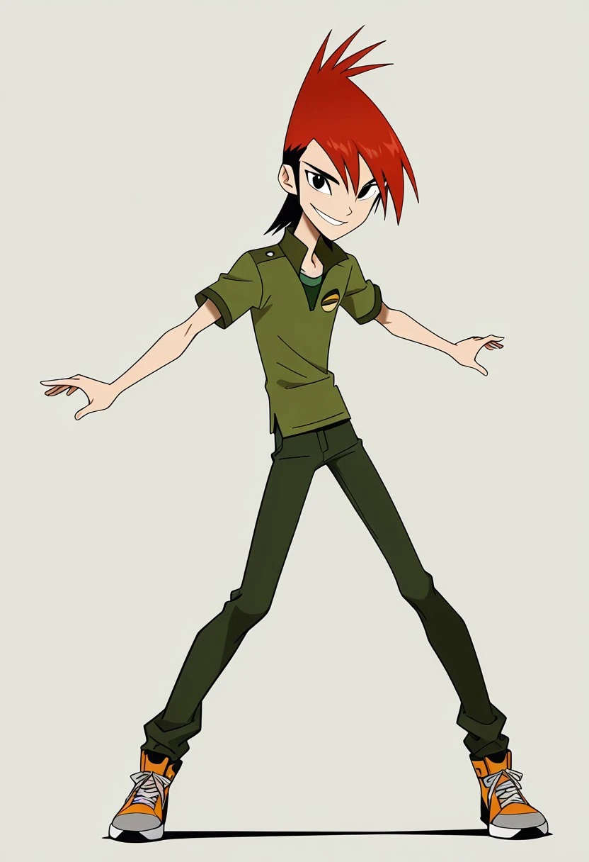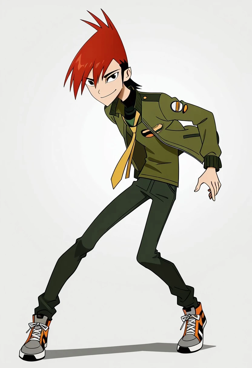 alt outfit: green jacket,black undershirt,green polo shirt,yellow and black necktie,dark green pants,gray and orange sneakers