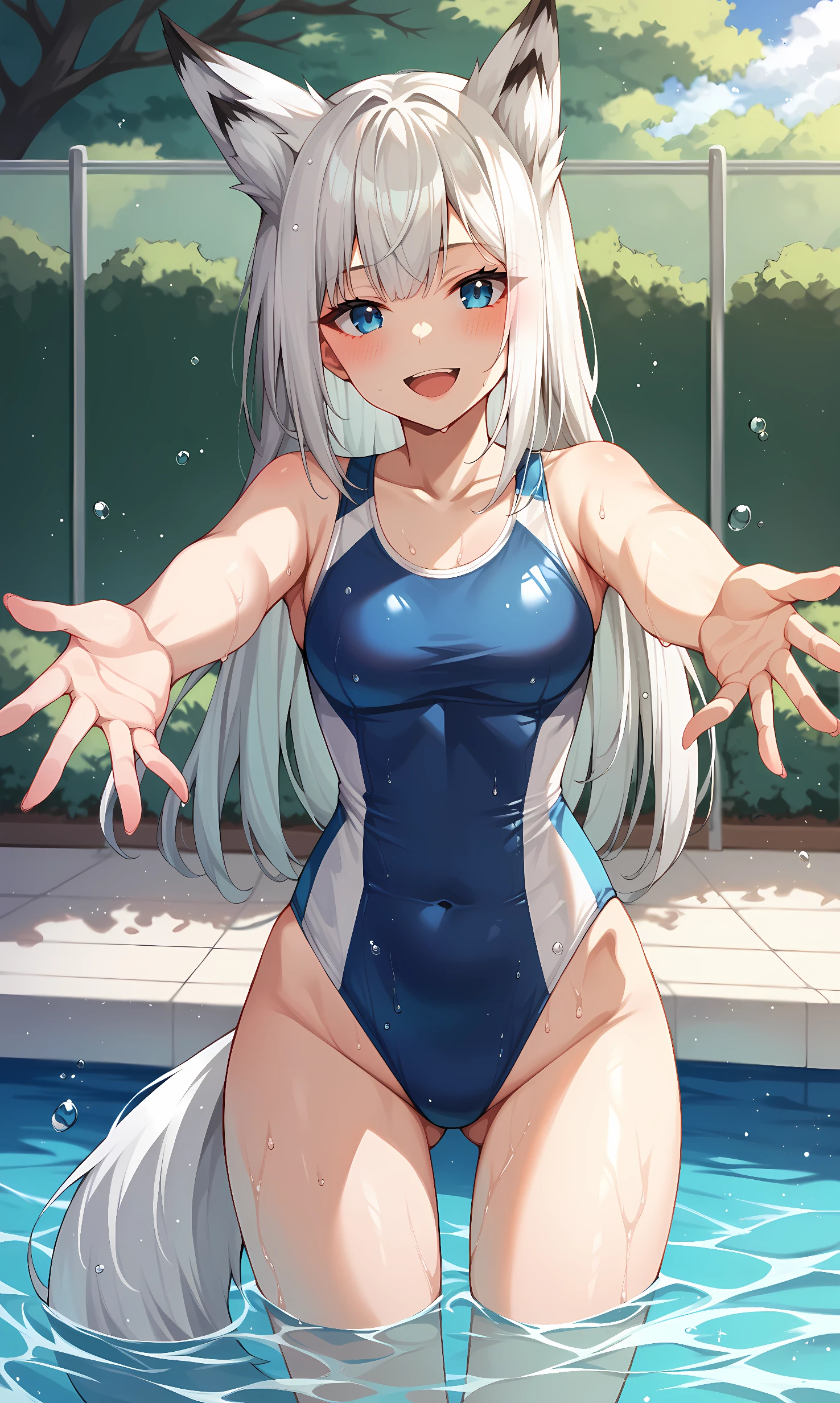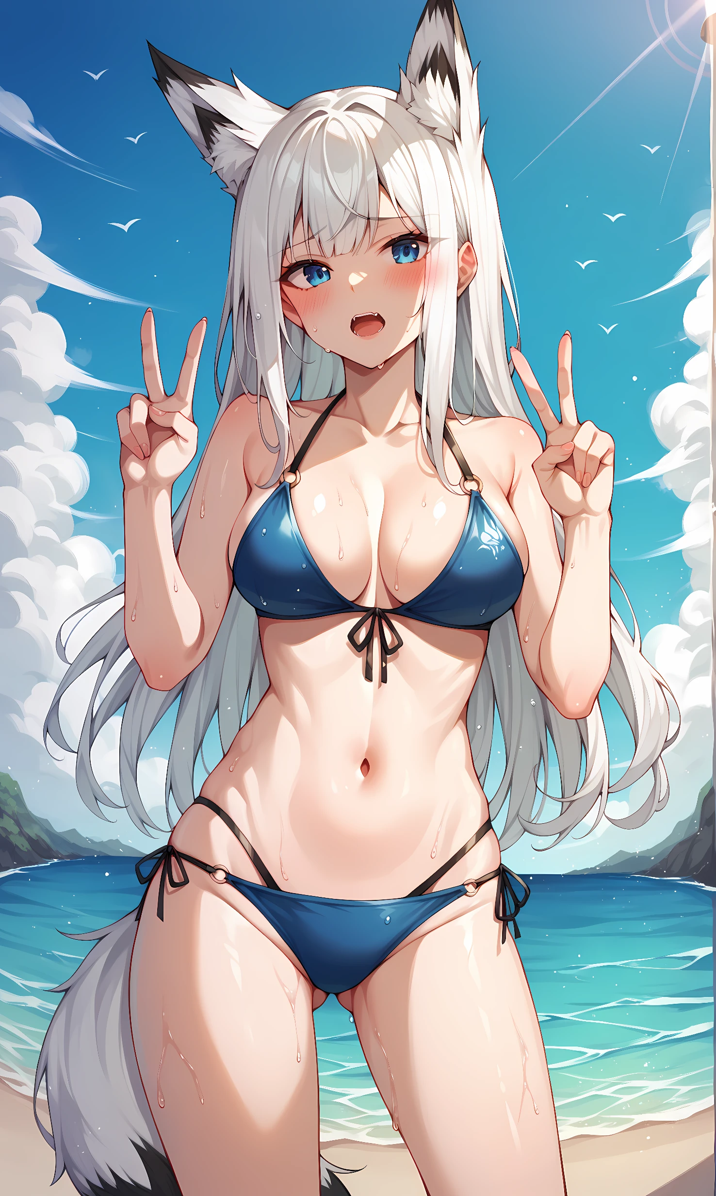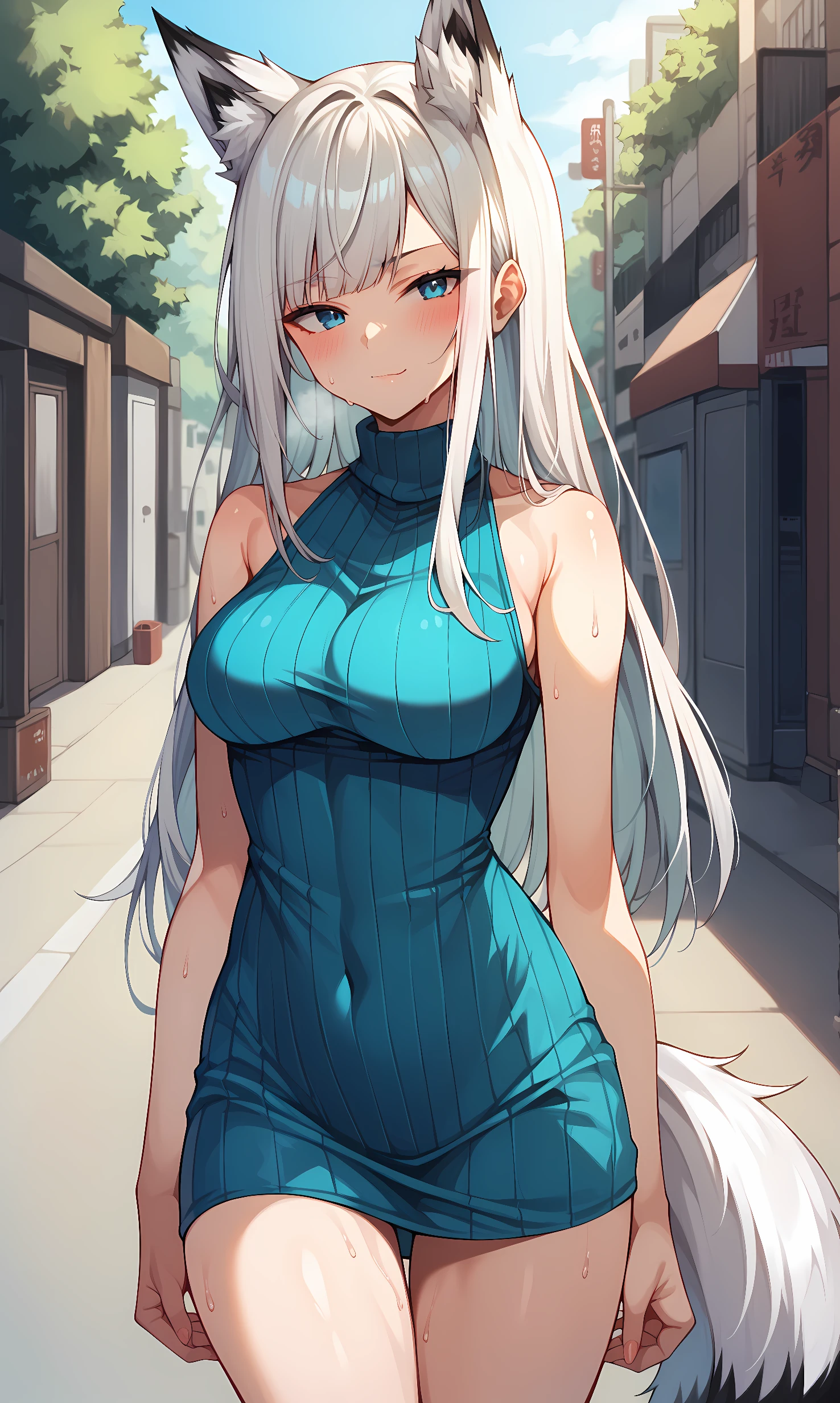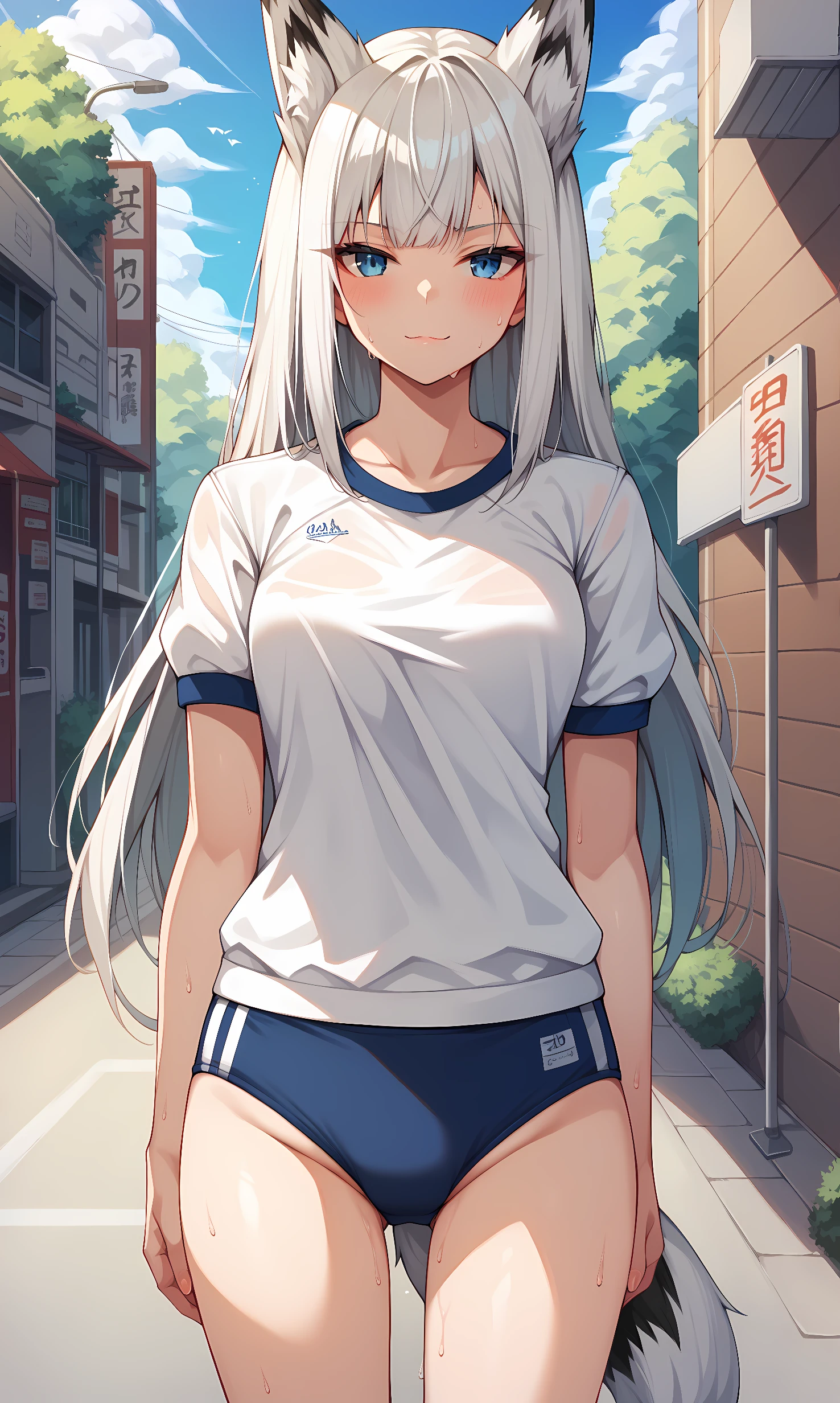 kawakaze, blue eyes, white hair, long hair, fox ears, fox tail