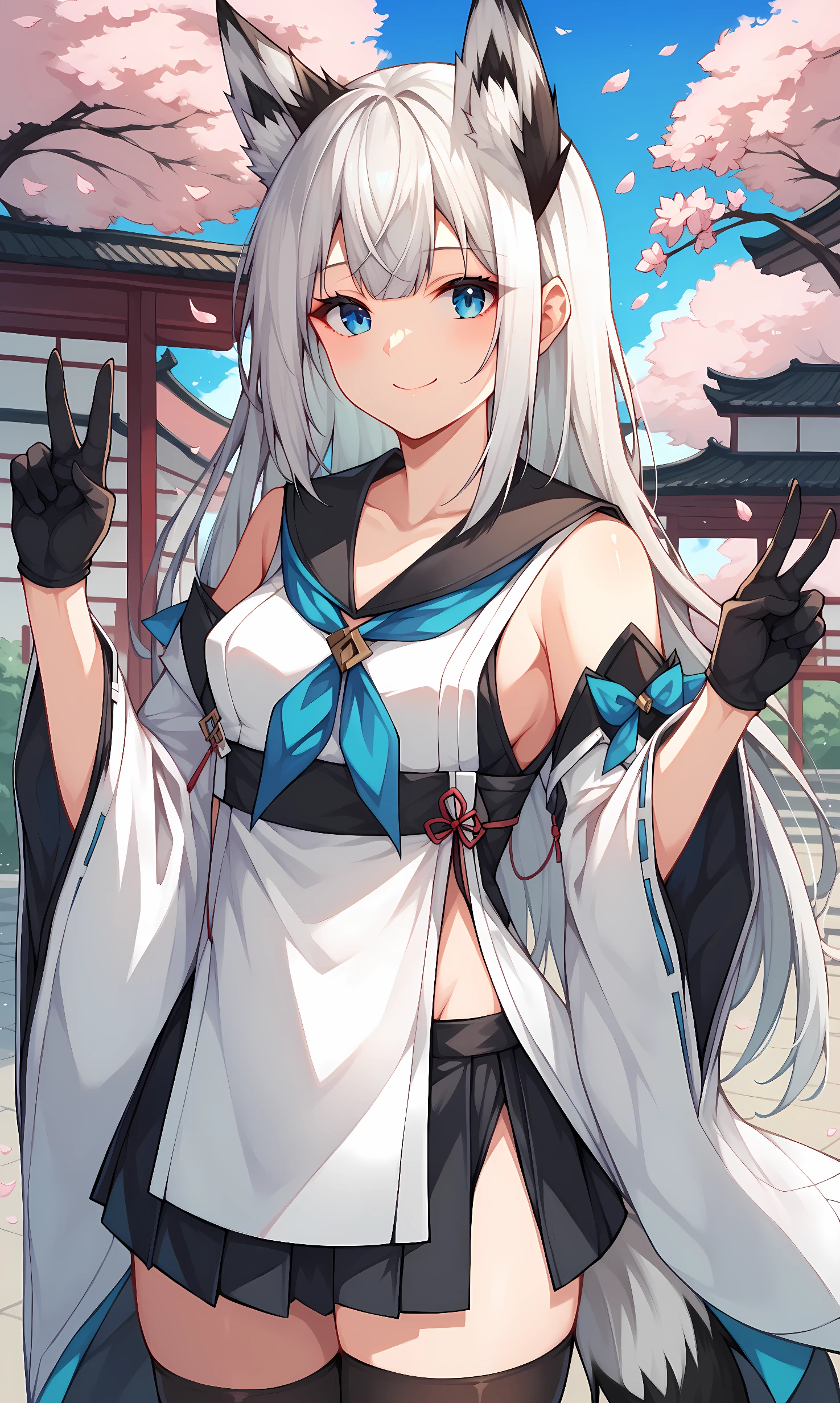 nontraditional miko, japanese clothes, wide sleeves, ribbon-trimmed sleeves, detached sleeves, black gloves, black serafuku, blue neckerchief, black skirt, pleated skirt, thighhighs