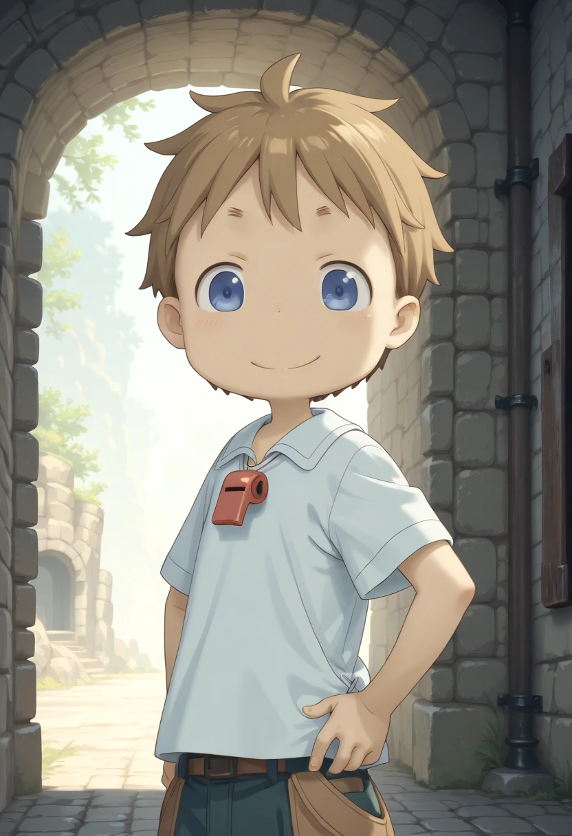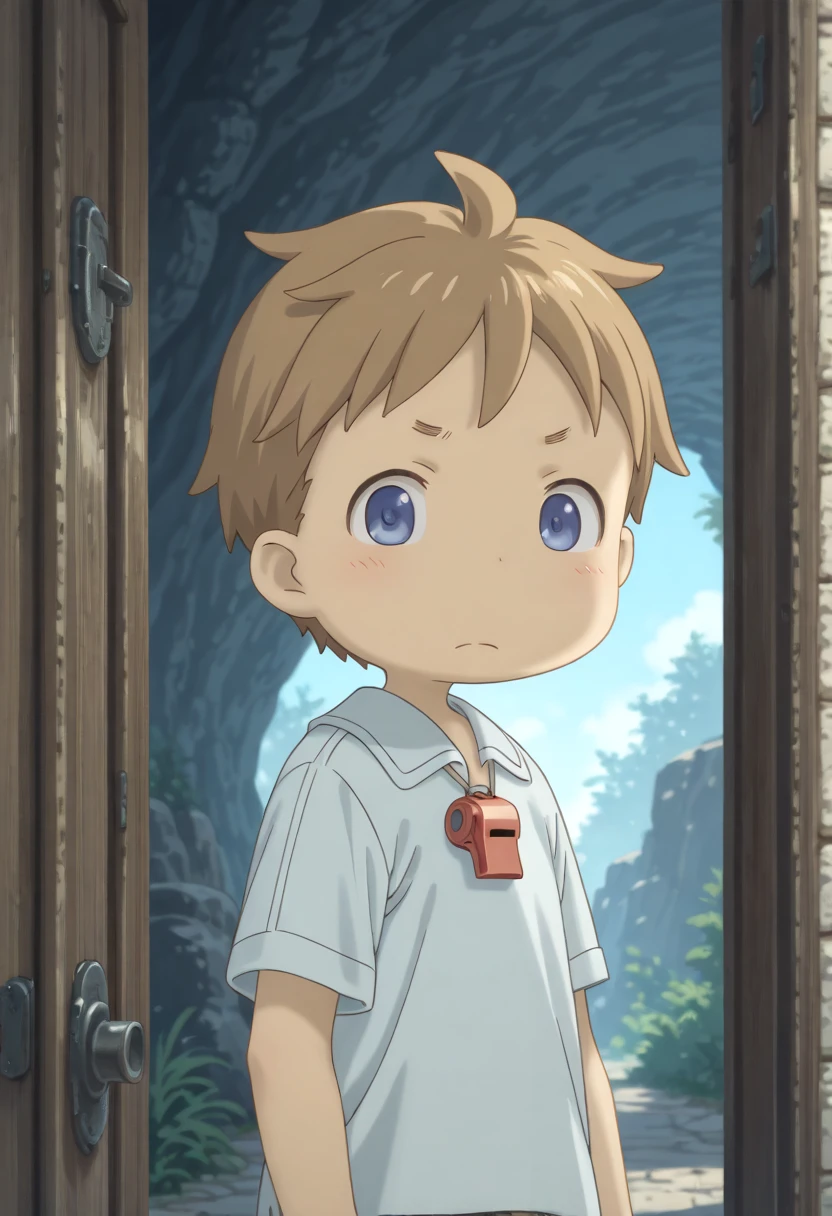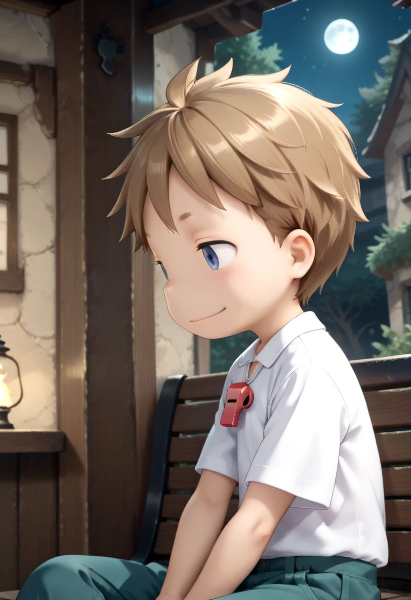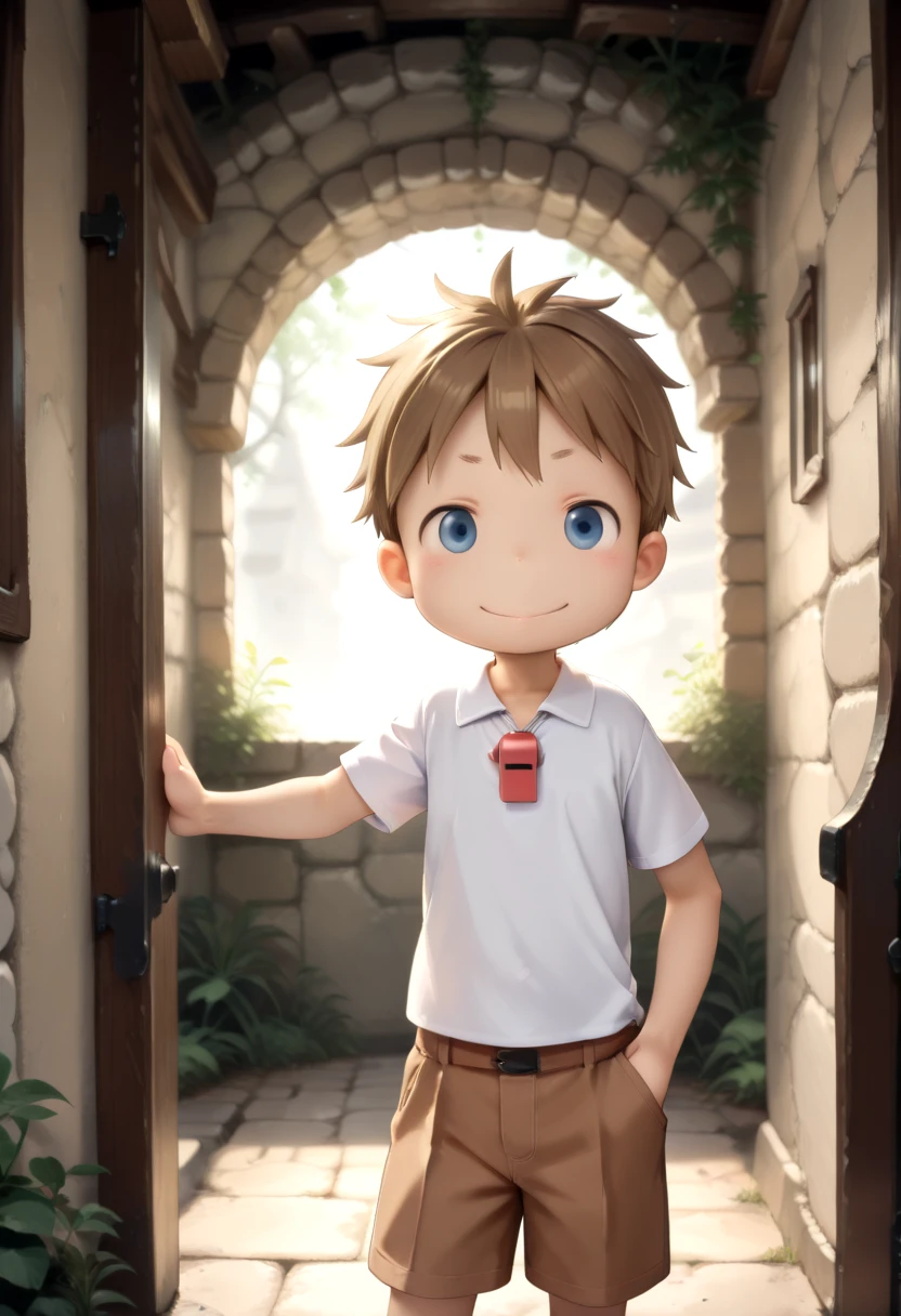 mia_nat, brown hair, 1boy, male focus, white shirt, red whistle as pendant, dark blue eyes