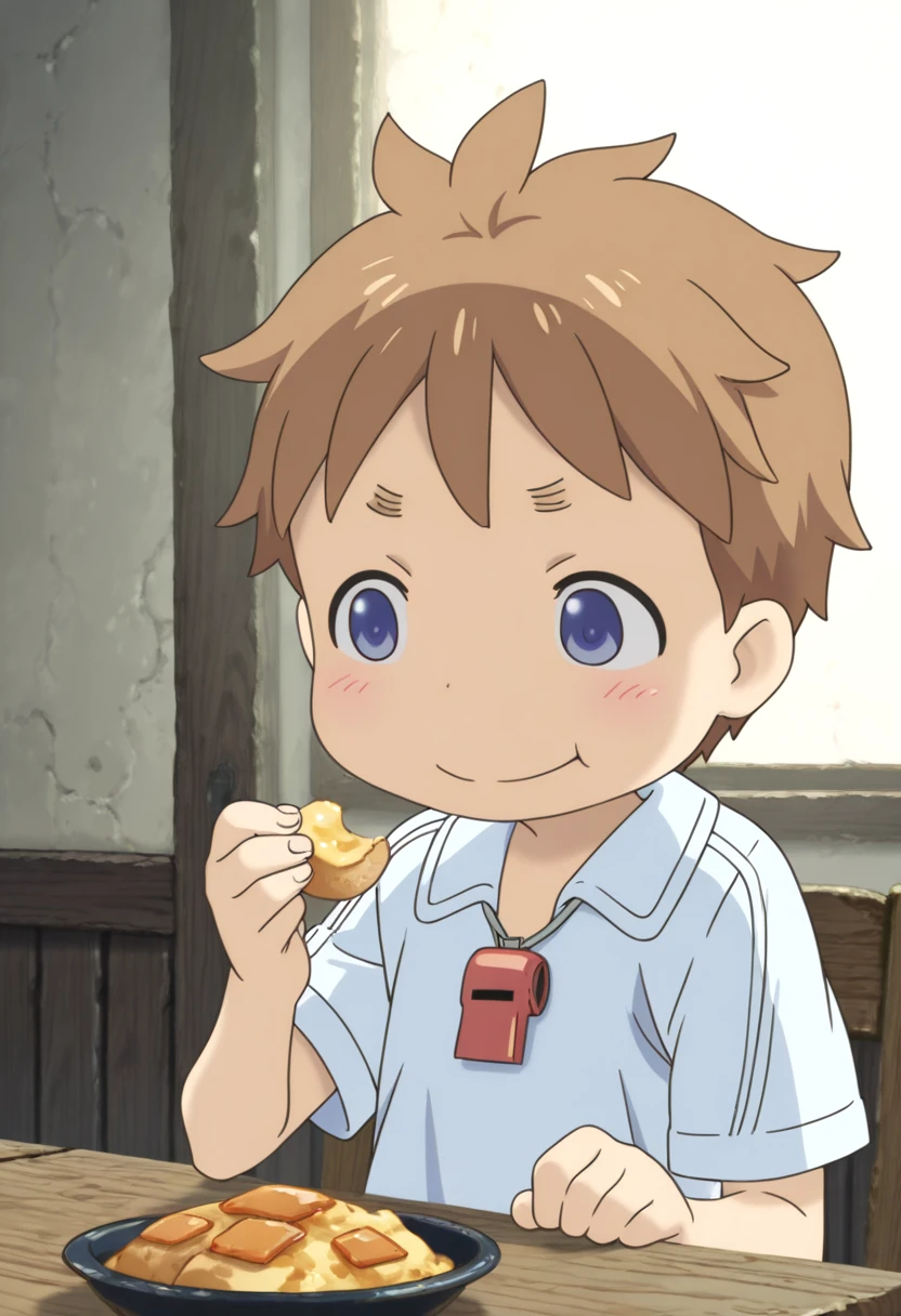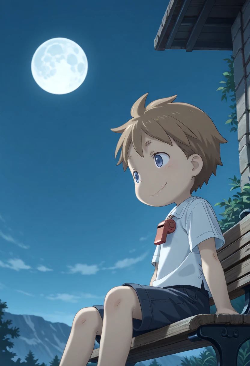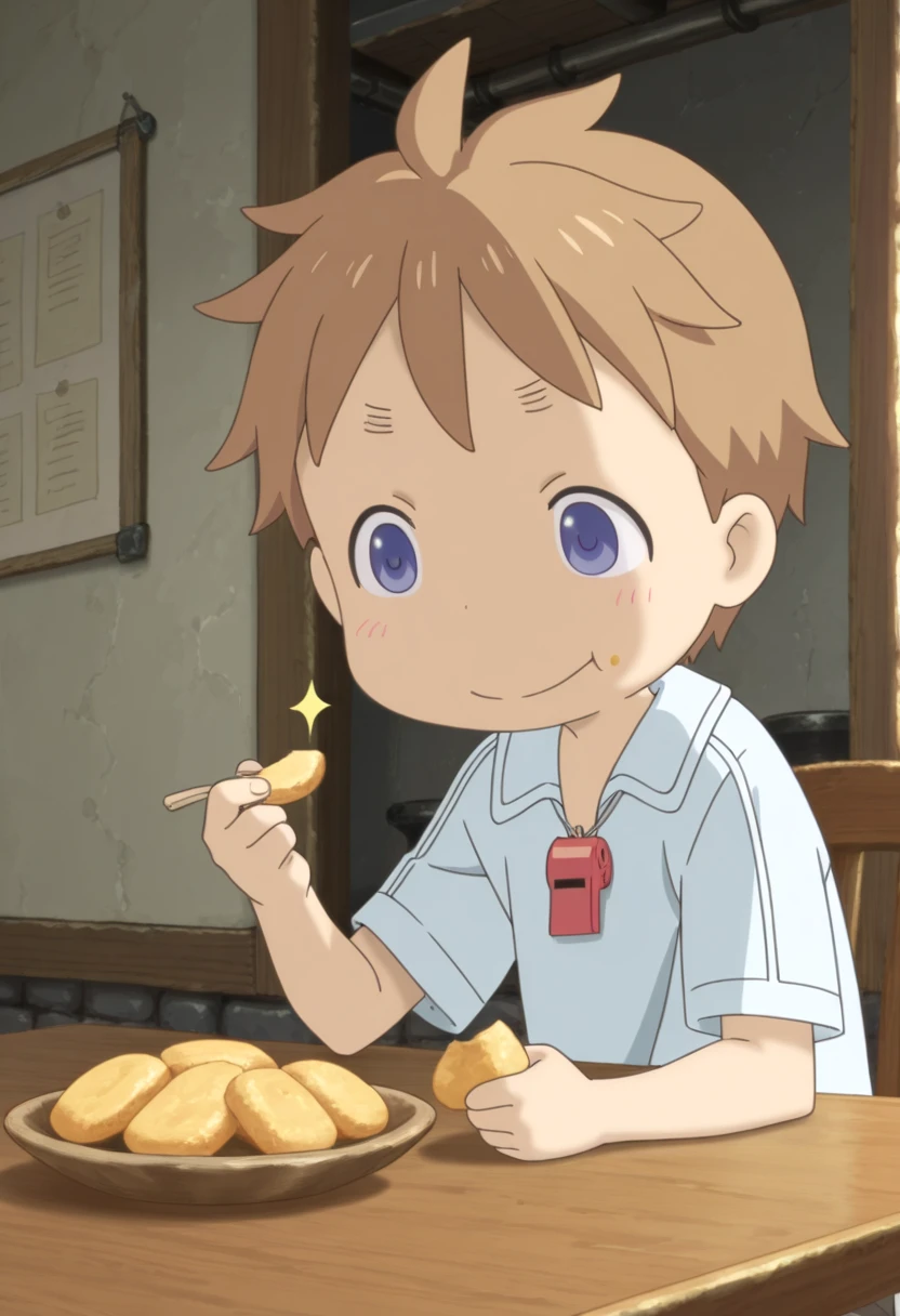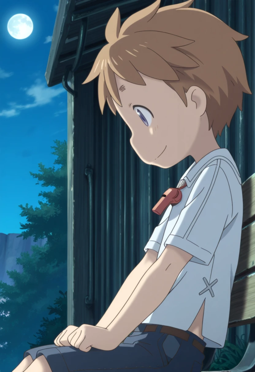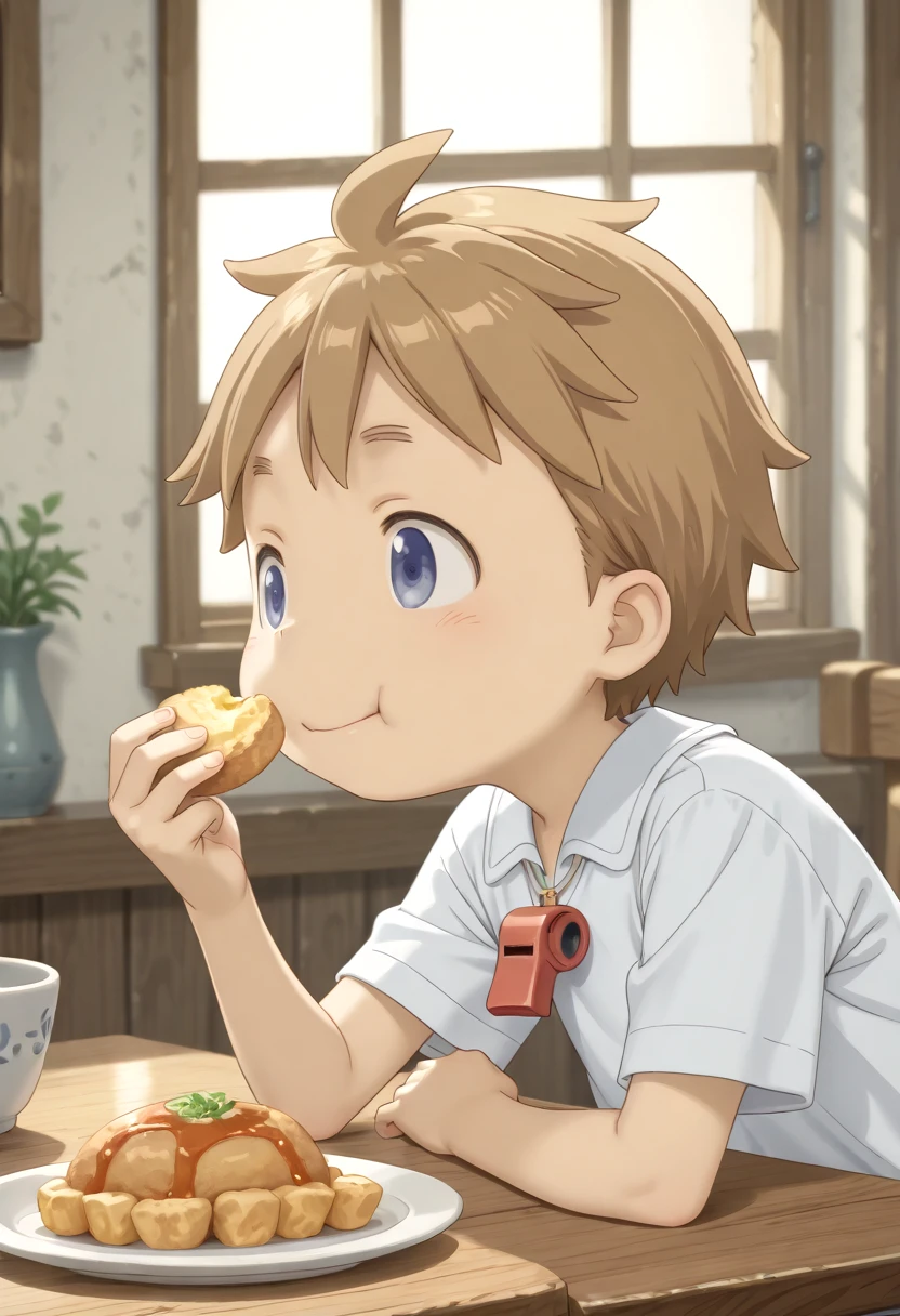 mia_nat, brown hair, 1boy, male focus, white shirt, red whistle as pendant, dark blue eyes