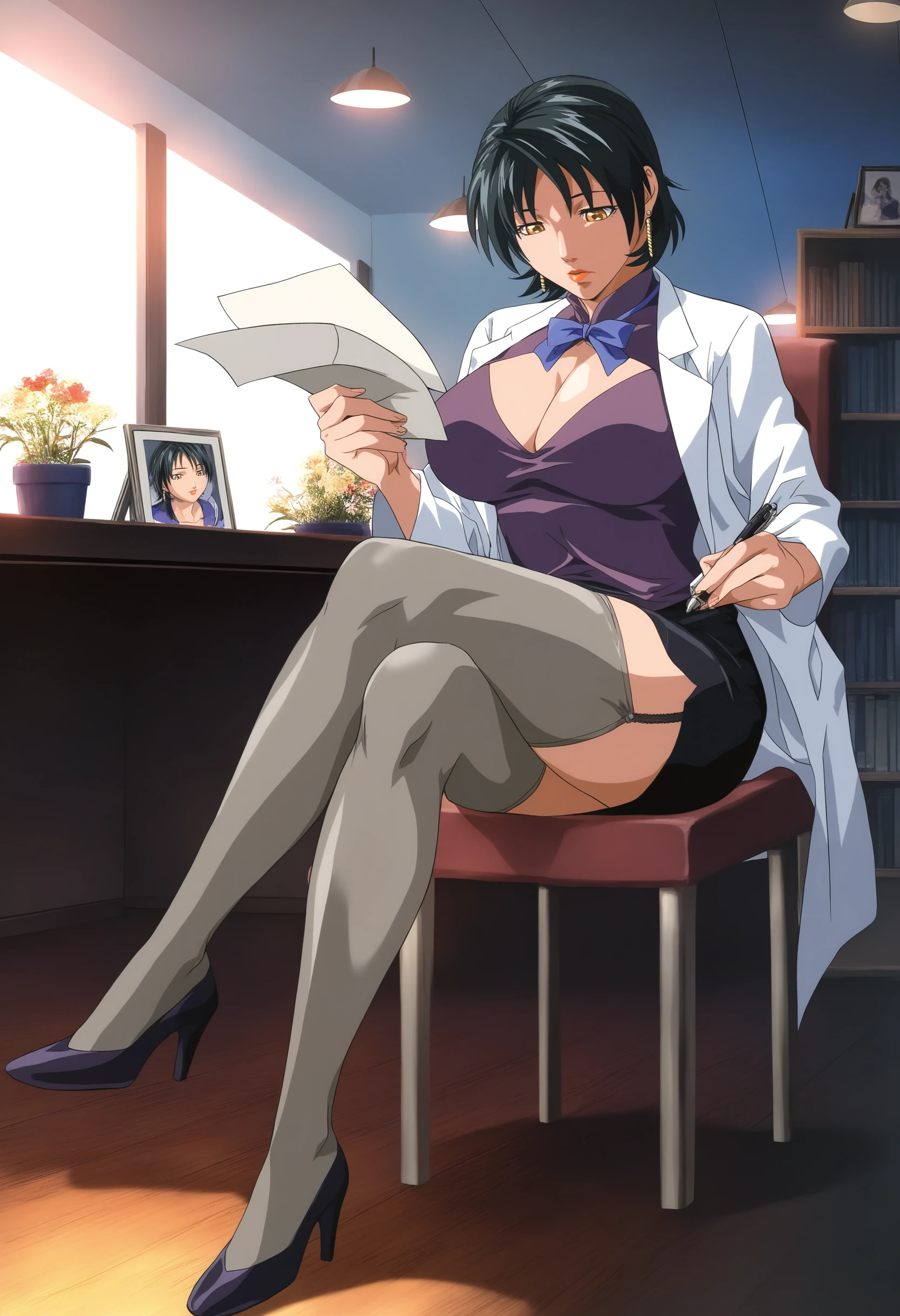 lab coat, blue bowtie, purple undershirt, black skirt, miniskirt, cleavage cutout, grey thighhighs, garter straps,
