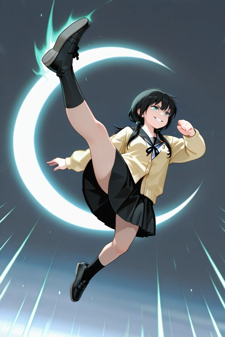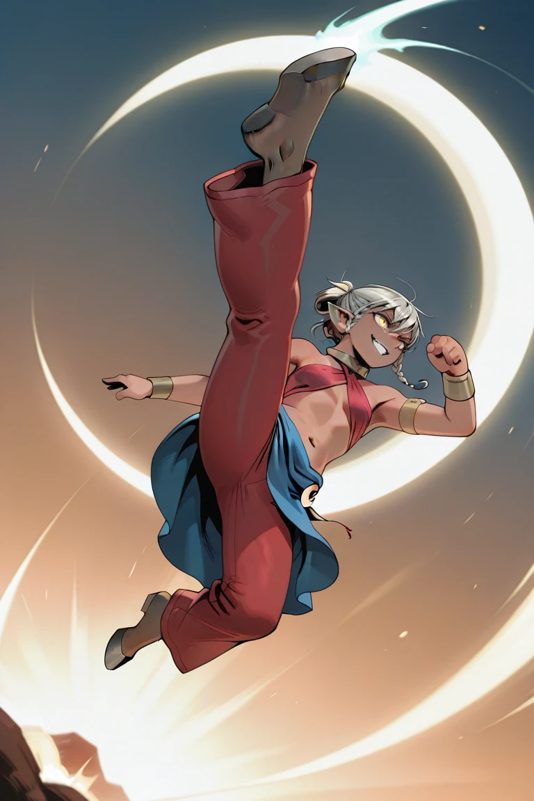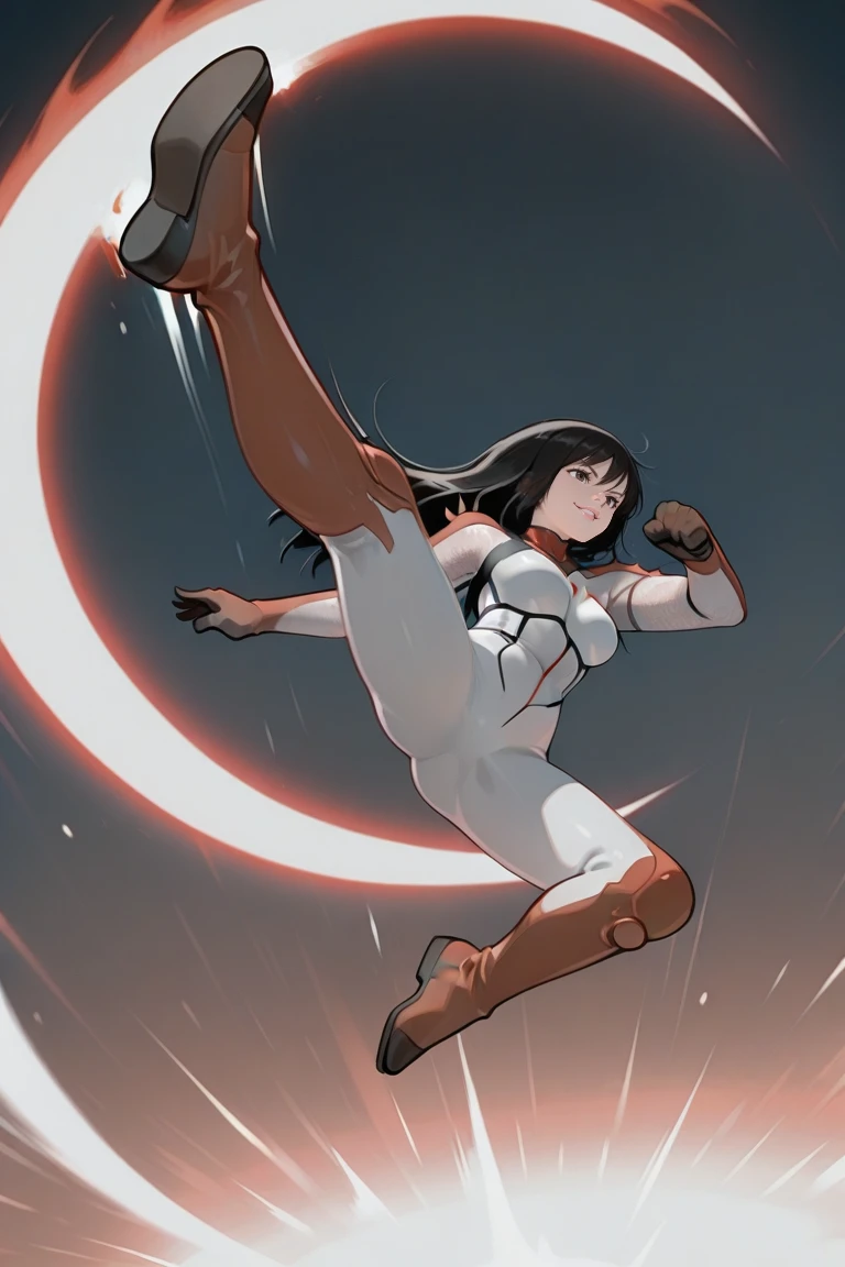 genocide_cutter,flying kick,jumping,aerial,crescent arc,full body,evil smile