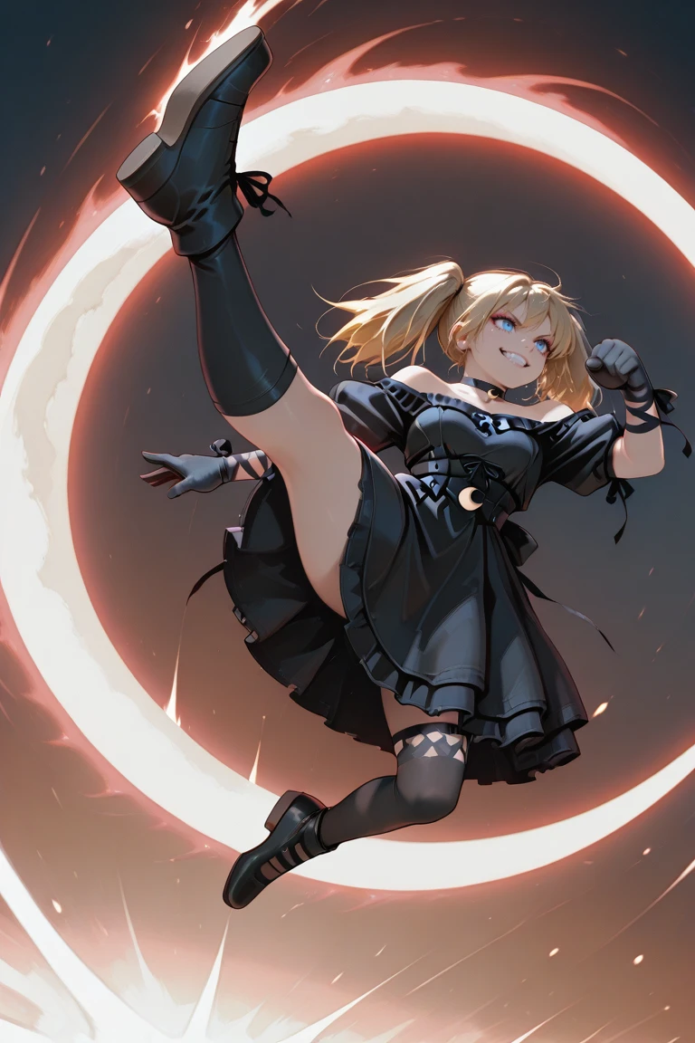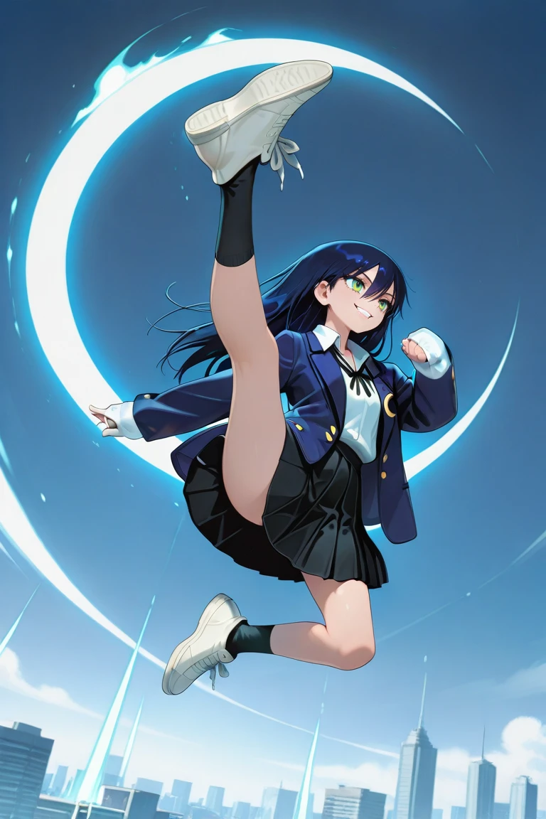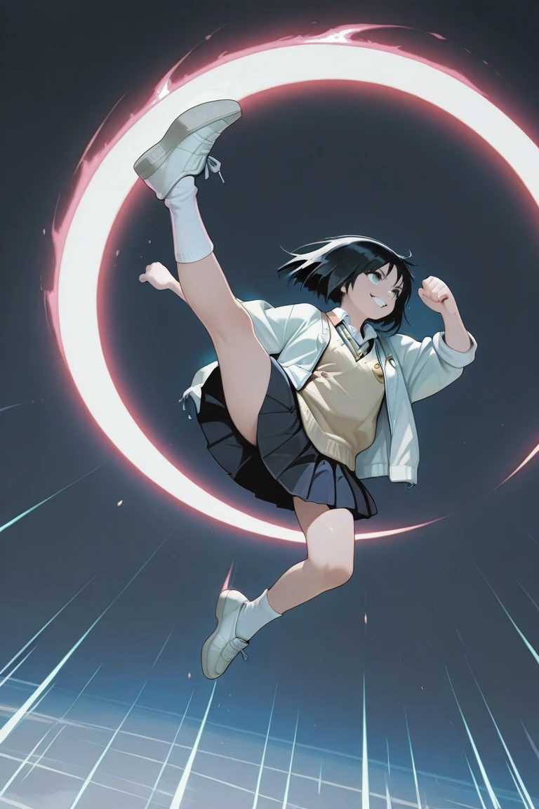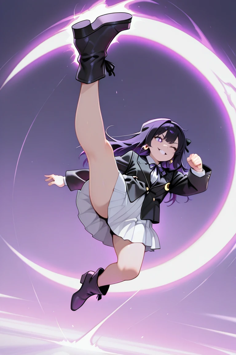 genocide_cutter,flying kick,jumping,aerial,crescent arc,full body,evil smile