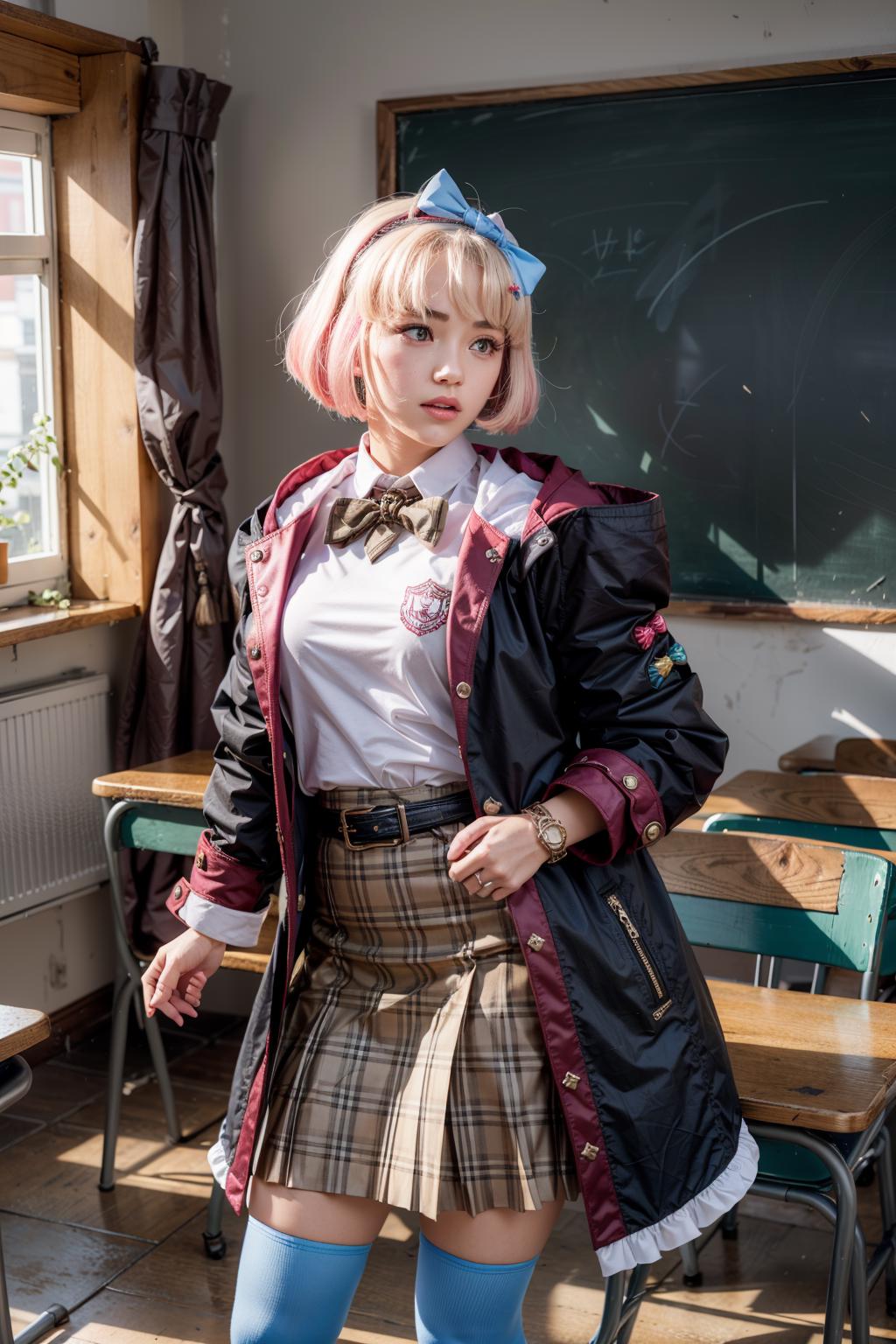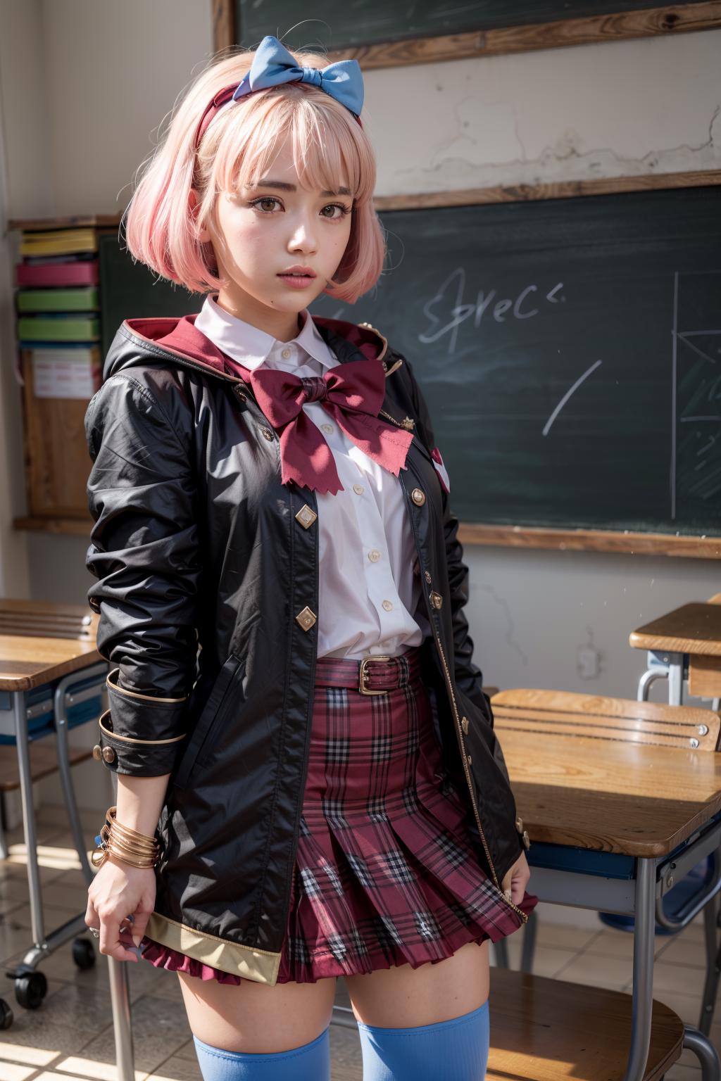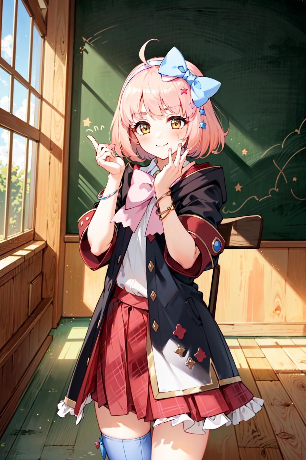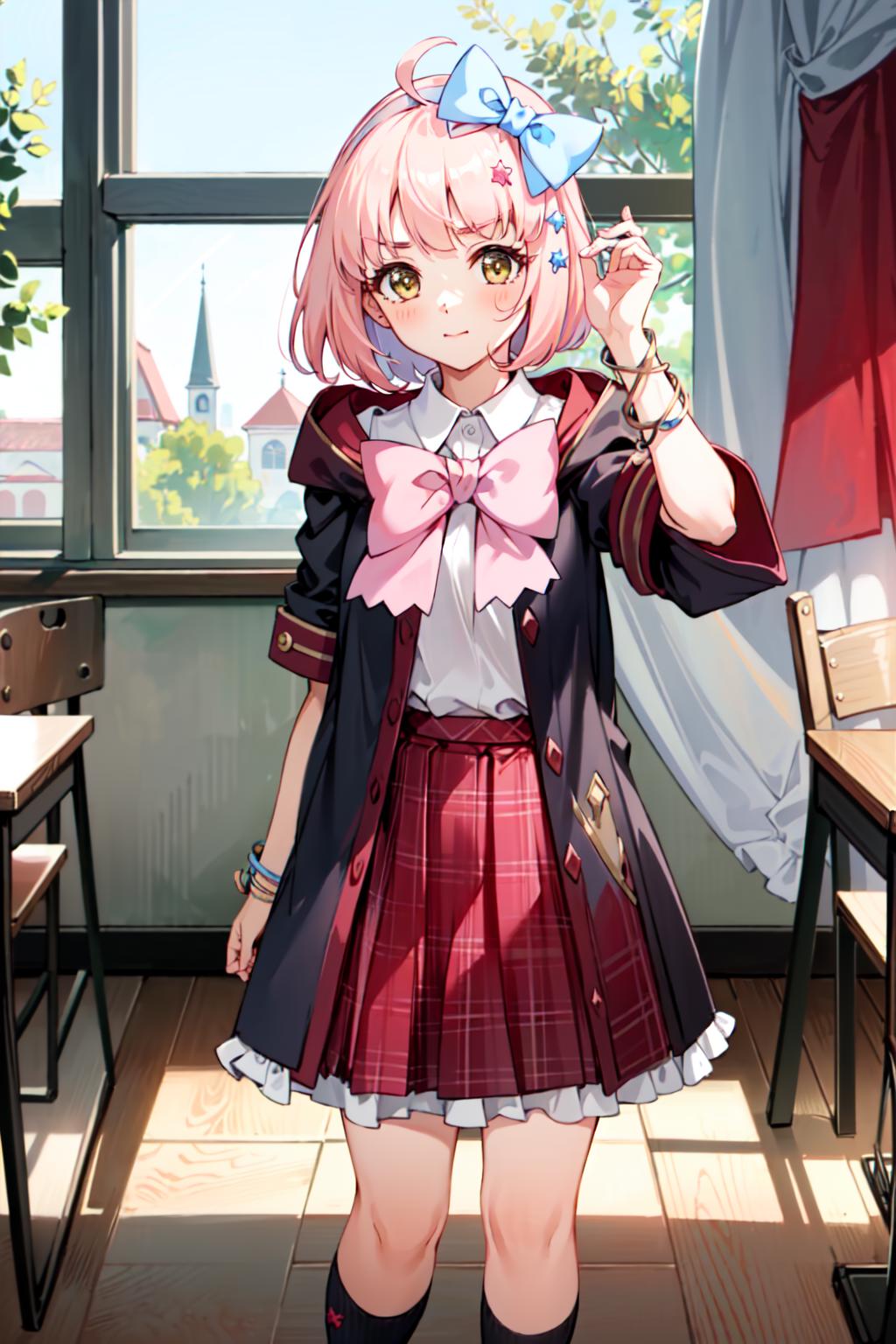 chieruschool, bow, school uniform, st. theresa's girls academy school uniform, star \(symbol\), hair ornament, black coat, star hair ornament, coat, blue bow, hairband, hooded coat, pink bow, hair bow, skirt, thighhighs, shirt, red skirt, plaid skirt, beltSchool festival outfit: