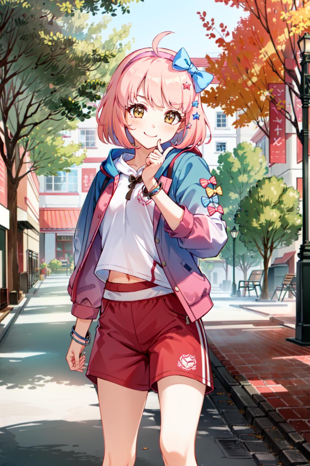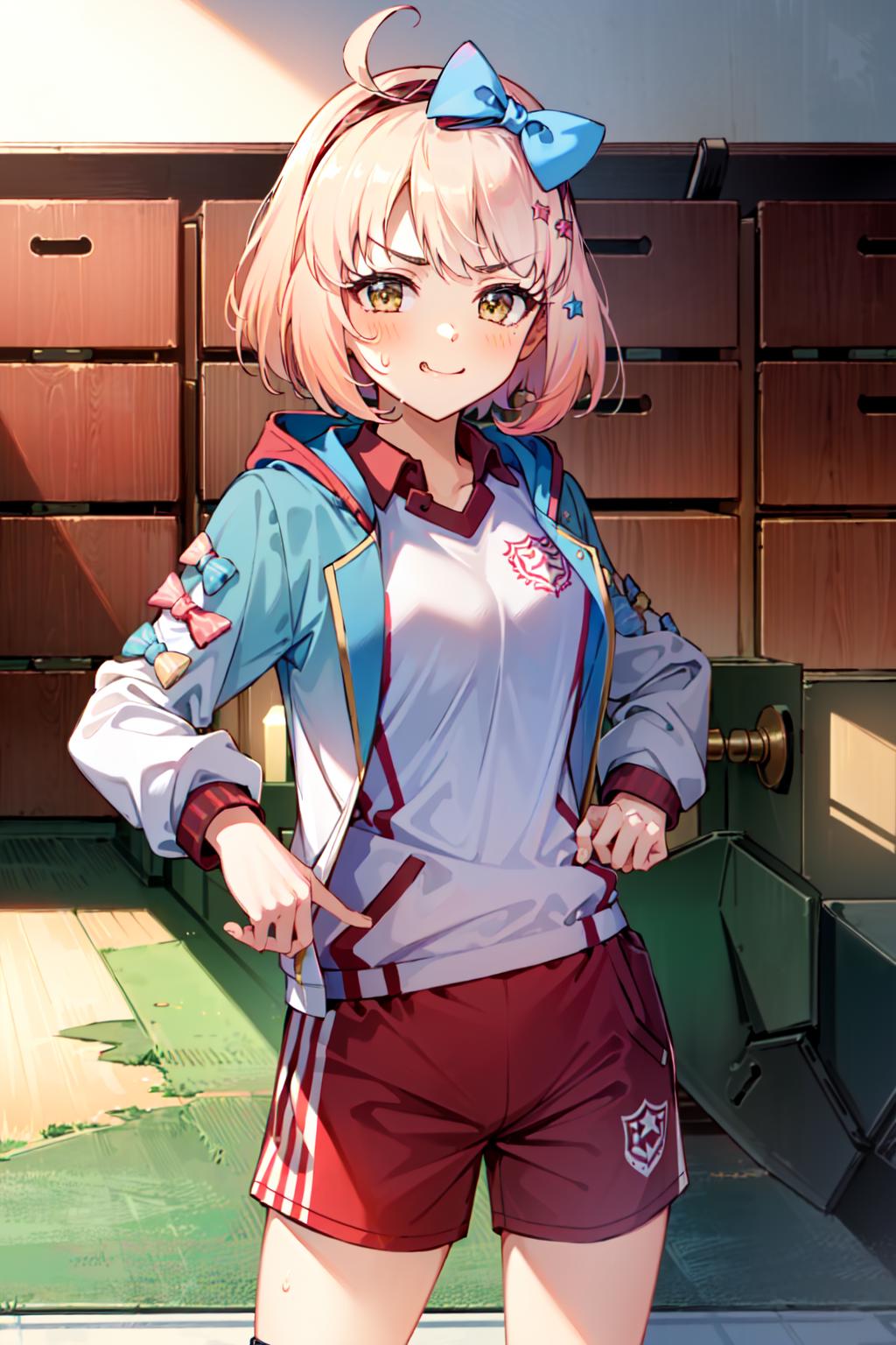 chieruschoolfestival, star \(symbol\), star hair ornament, bow, hair ornament, hair band, plaid bow, shirt, shorts, white shirt, jacket, plaid, gym uniform, hair bow, bow hairband, red bow, red hair band, red shortsReal-world outfit: