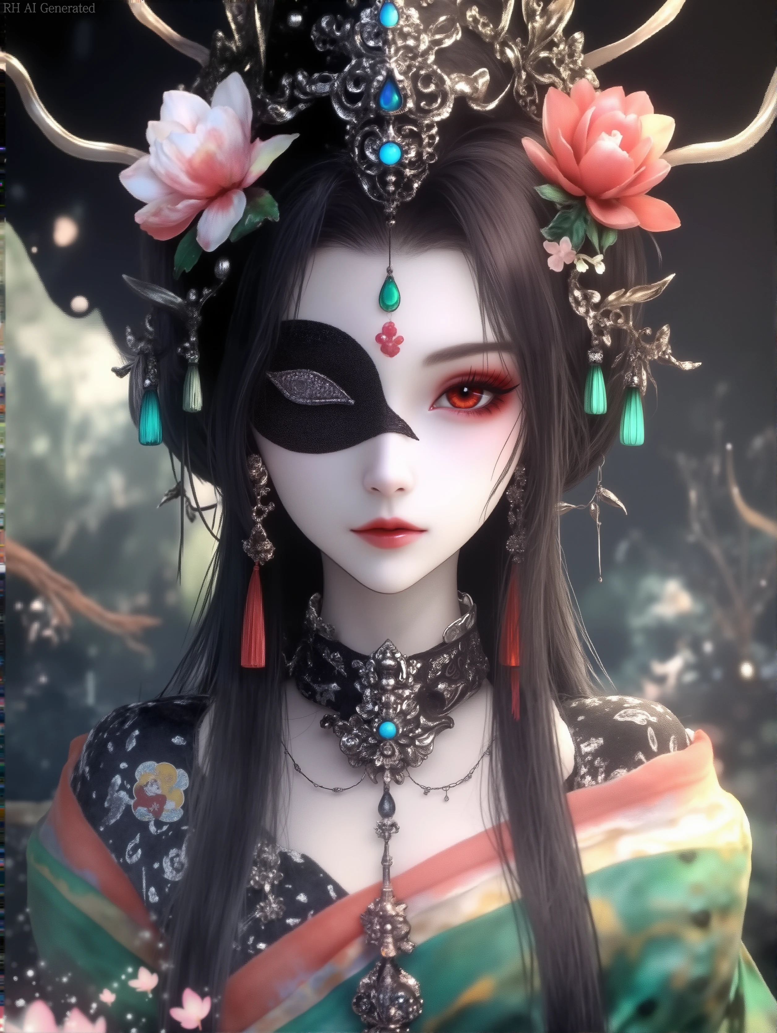 1.long hair, eyes closed, female solo, china_dress, sfw, chinese clothes, 1girl, earrings, red eye, mask, original character, very long hair, jewelry, black hair, mask on head, dress