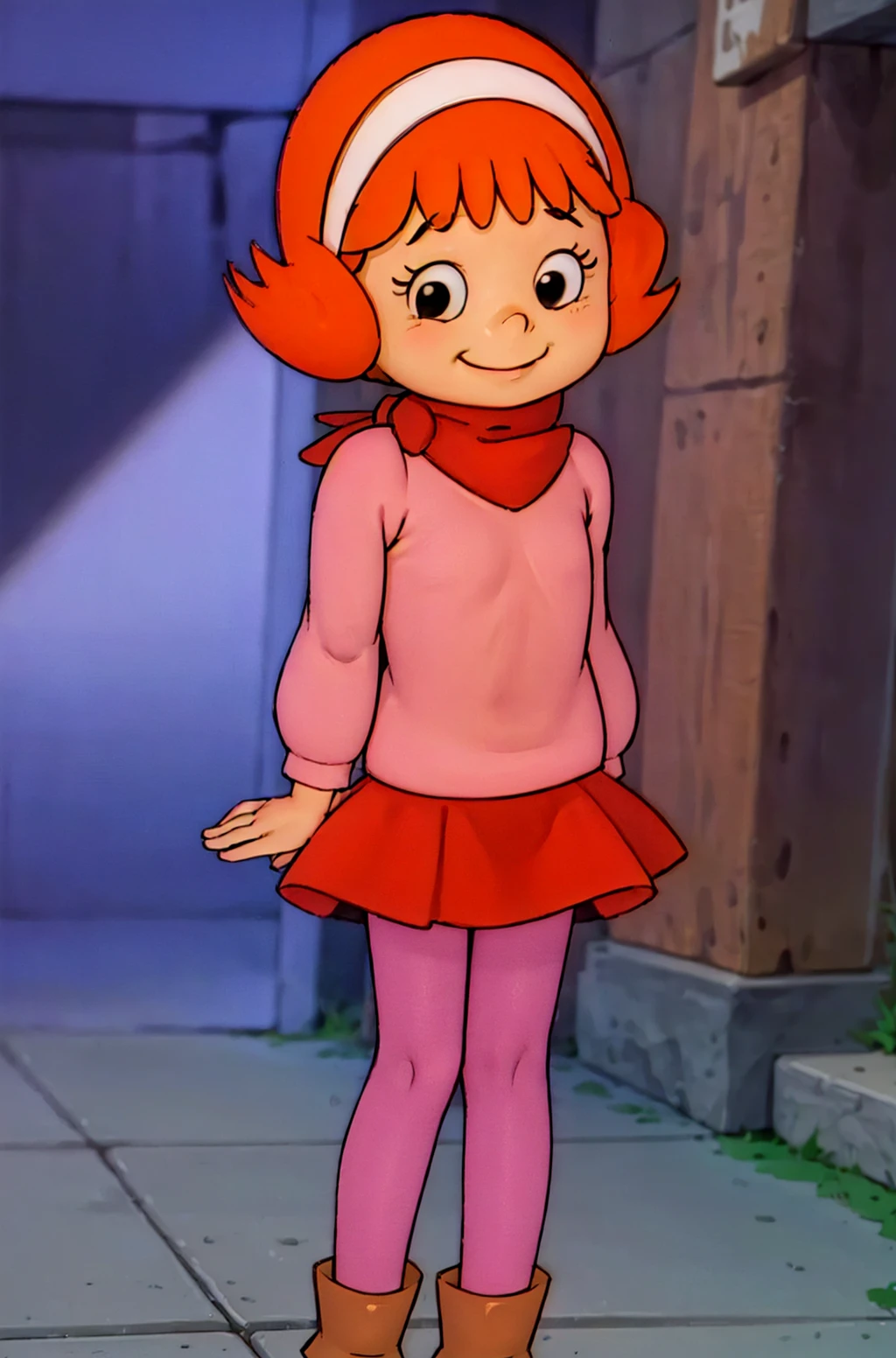 daphne, 1girl, solo, pink sweater, orange hair, short hair, hairband, scarf, skirt,black eyes, red skirt, pantyhose, pink pantyhose, boots