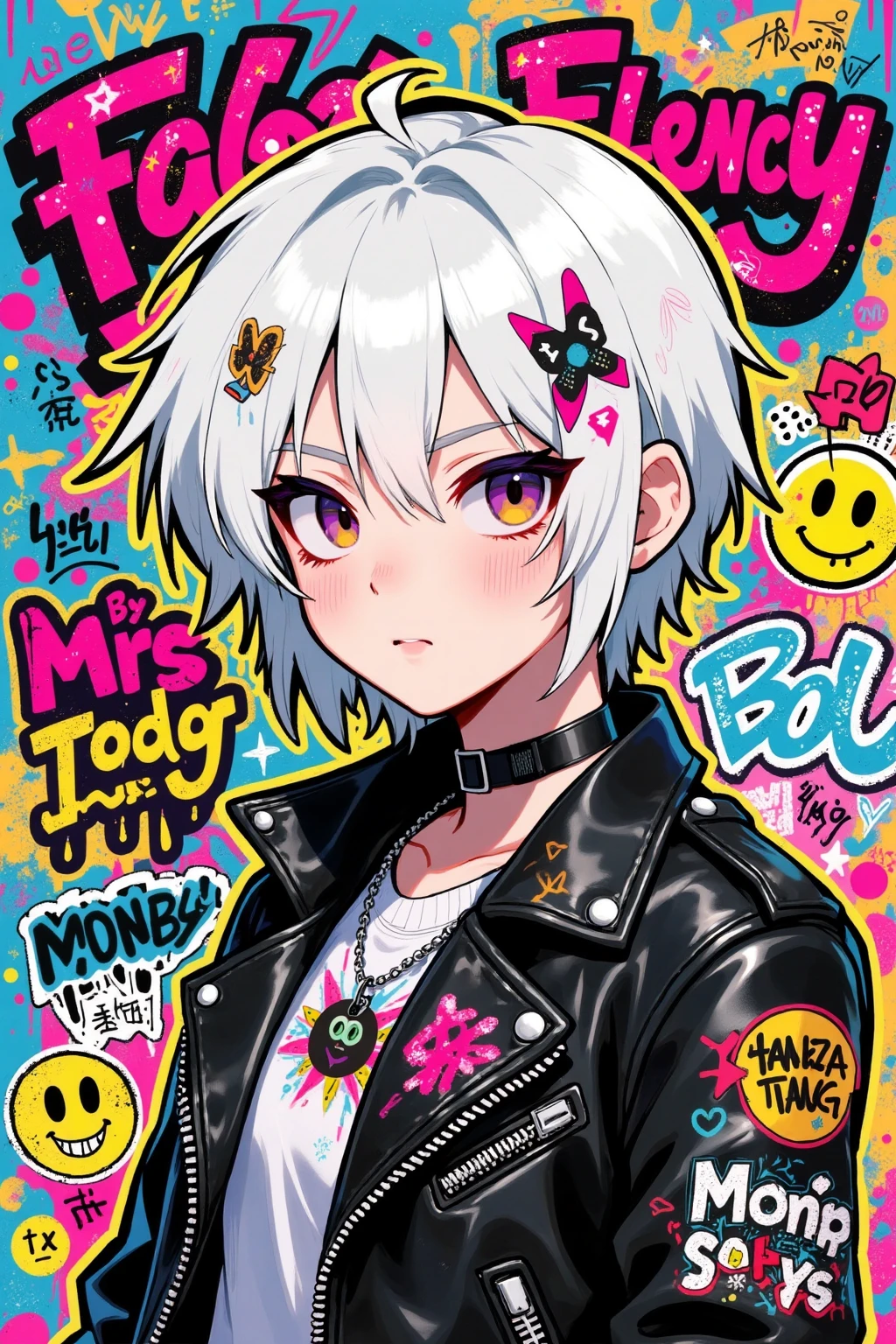 Vibrant graffiti - style anime characters, white - haired character, leather jacket, punk - style tags, edgy atmosphere.